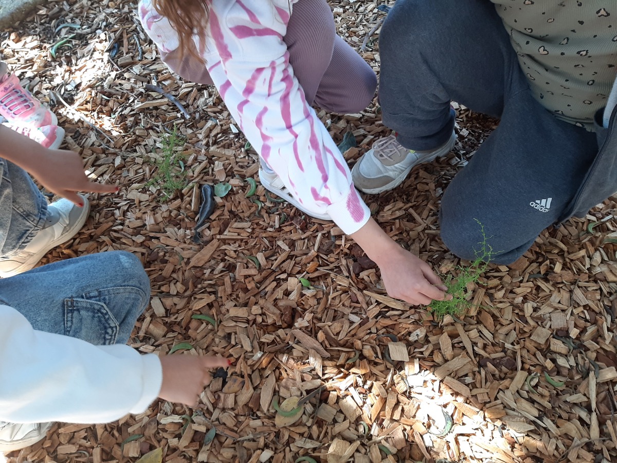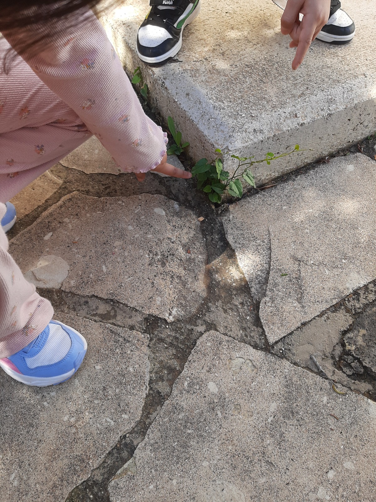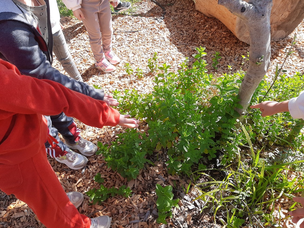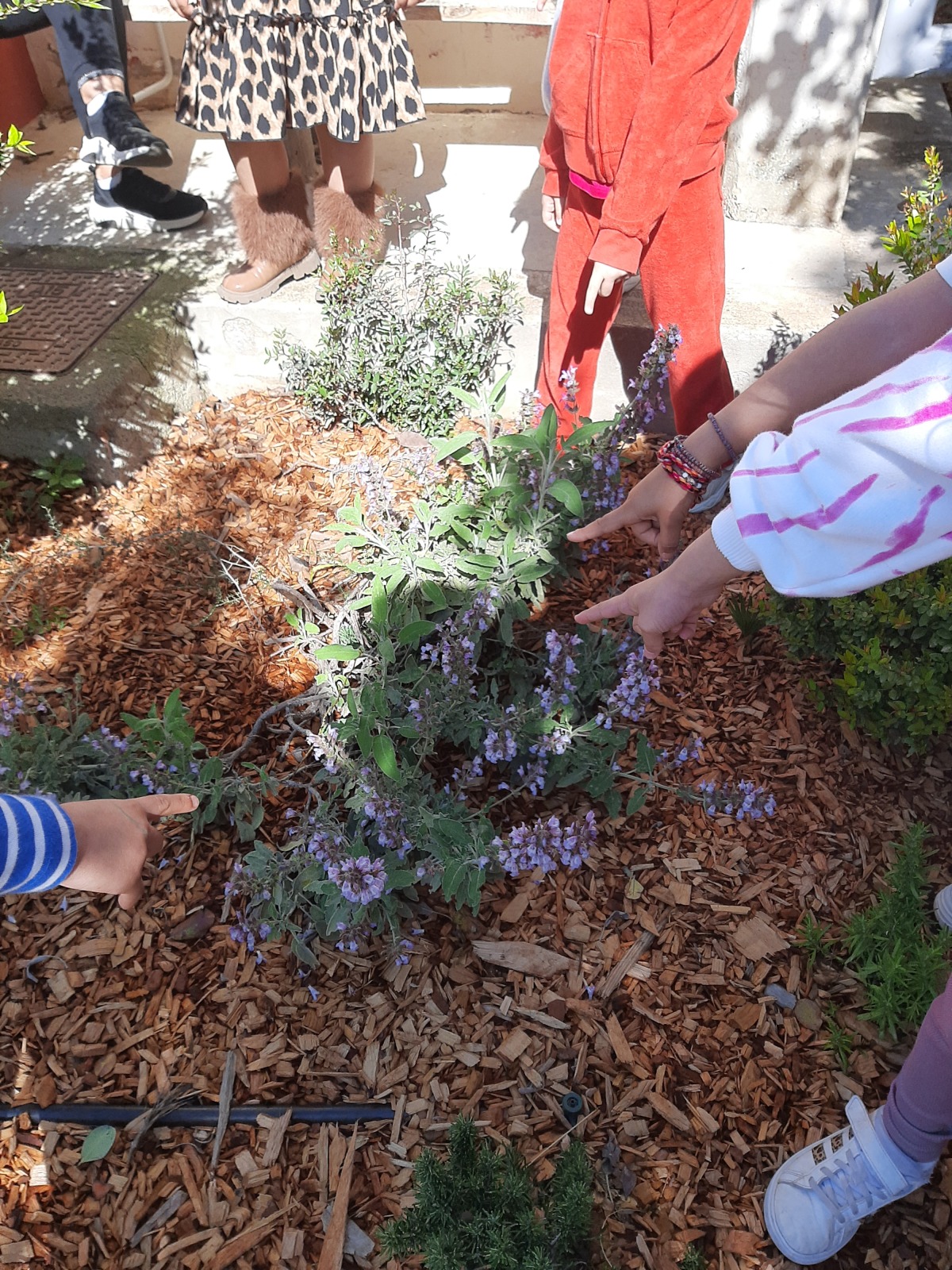 Η μηλιά άρχισε να δυναμώνει και να φαίνονται ωραία τα φύλλα της. Φυτά φύτρωσαν από μόνα τους χωρίς να τα έχουμε φυτέψει και κάποια φυτά μάλιστα κατάφεραν να φυτρώσουν μέσα από κουγκρί. Στις σχισμές των κομμένων κορμών φύτρωσαν μανιτάρια. Συζητήσαμε πώς ήταν ο χώρος της φύσης το Χειμώνα και πώς έγινε την άνοιξη.