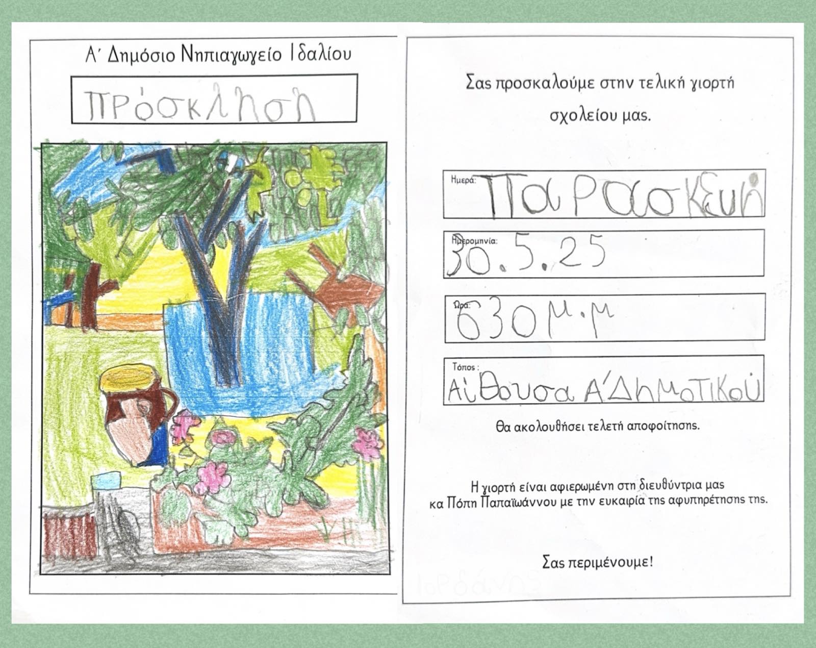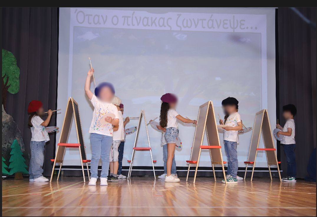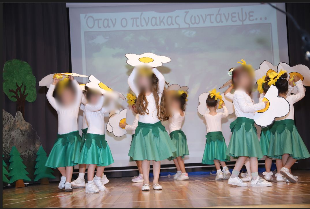 Ο στόχος του σχολείου μας για το «Πρασινίζω» δεν θα μπορούσε να λείπει από την τελική μας γιορτή. Ο πίνακας του Κύπριου ζωγράφου Τηλέμαχου Κάνθου με τίτλο «Μυγδαλιές στην αυλή» αποτέλεσε την έμπνευση για τη φετινή μας παράσταση με θέμα «Όταν ο πίνακας ζωντάνεψε».