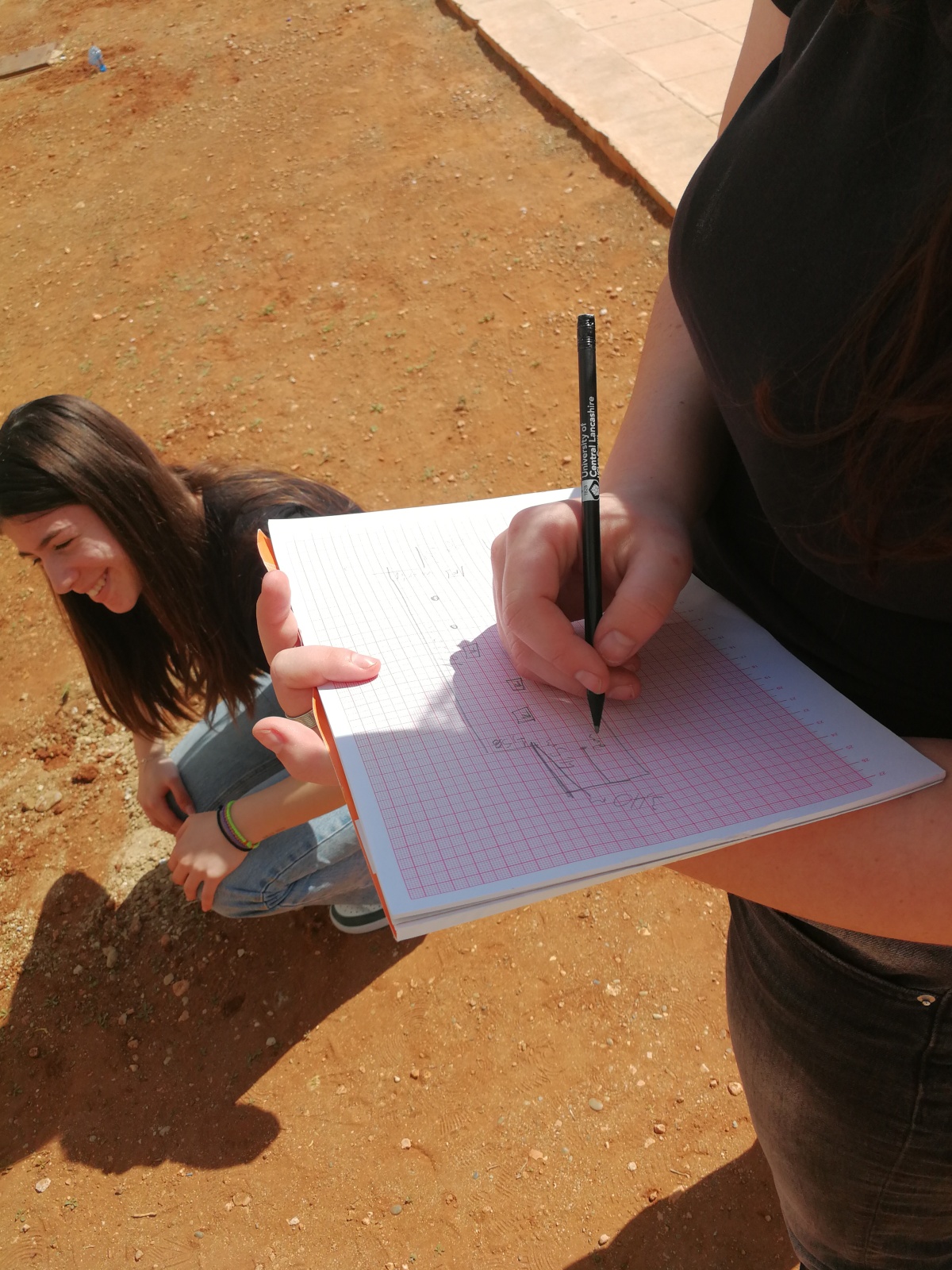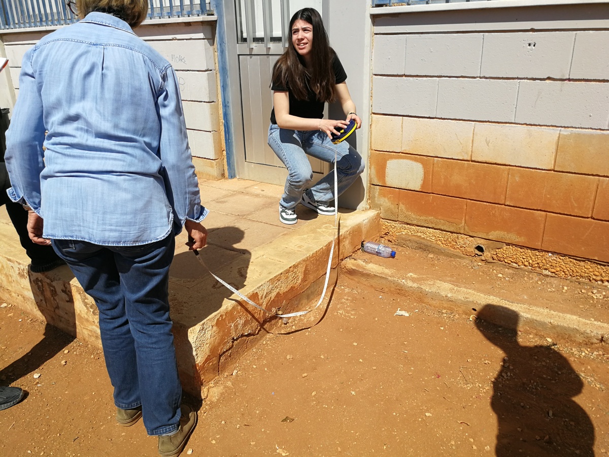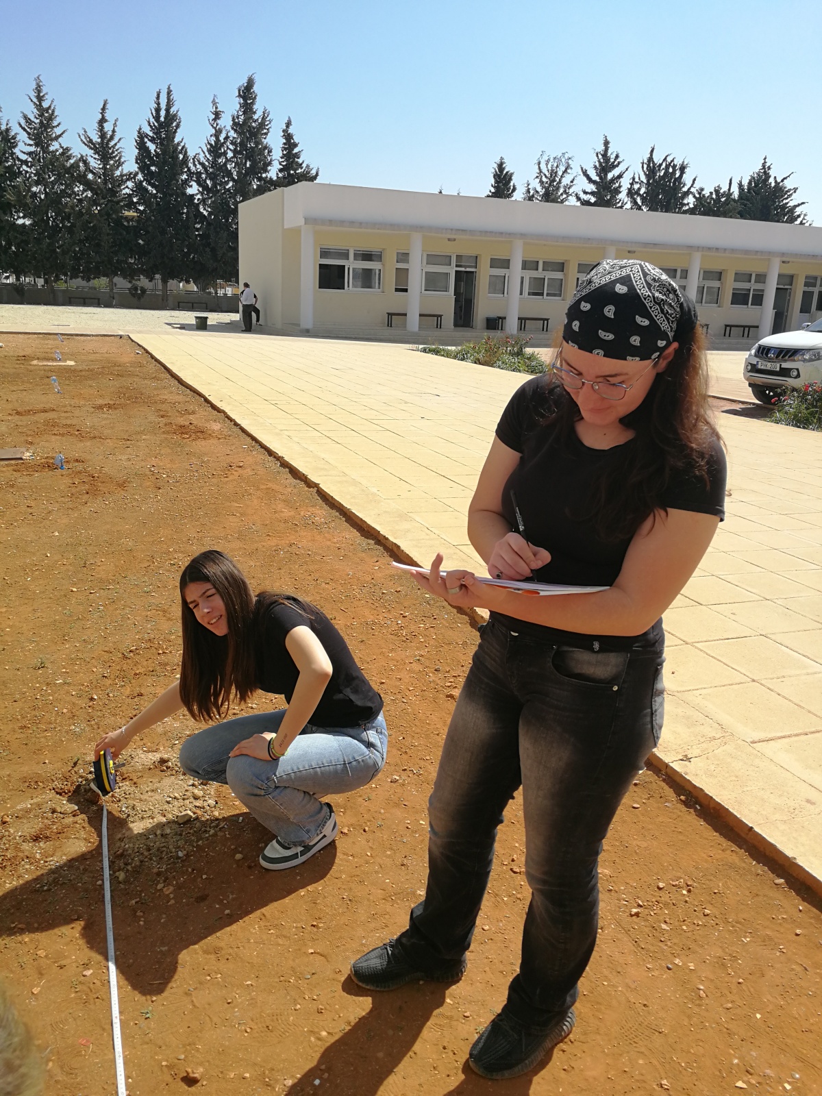 Γίνονται μετρήσεις στο νότιο τμήμα των προκατ αιθουσών για την σήμανση των θέσεων φύτευσης δέντρων από μαθήτριες του κλάδου της Γεωπονίας στα πλαίσια του μαθήματος κηποτεχνικές κατασκευές.