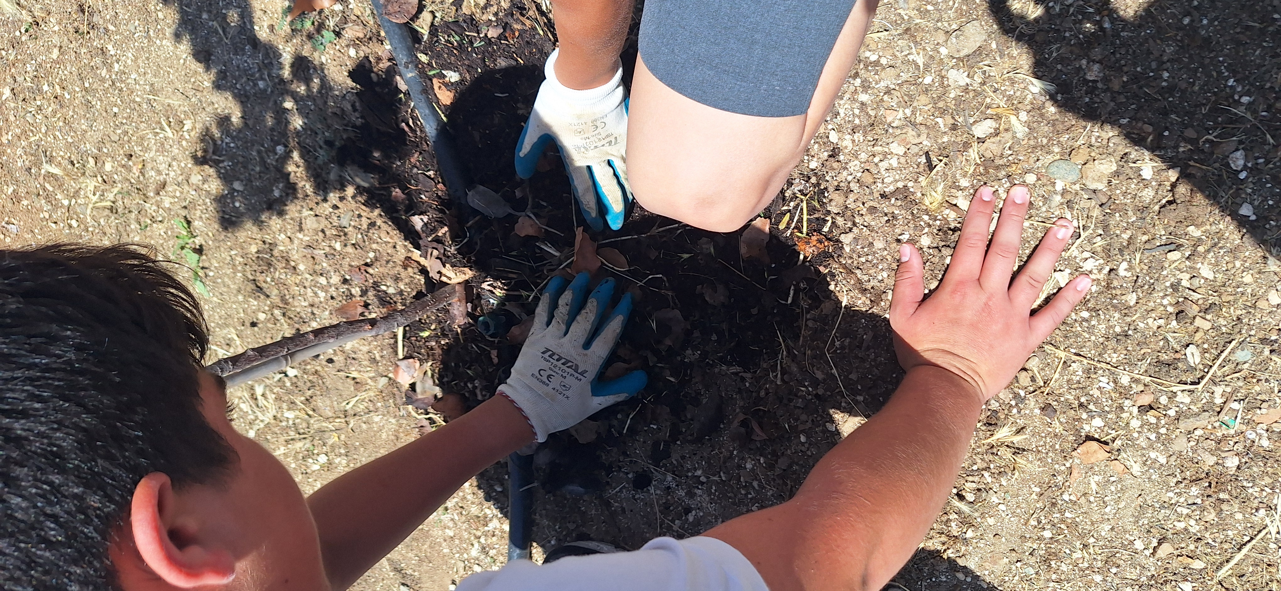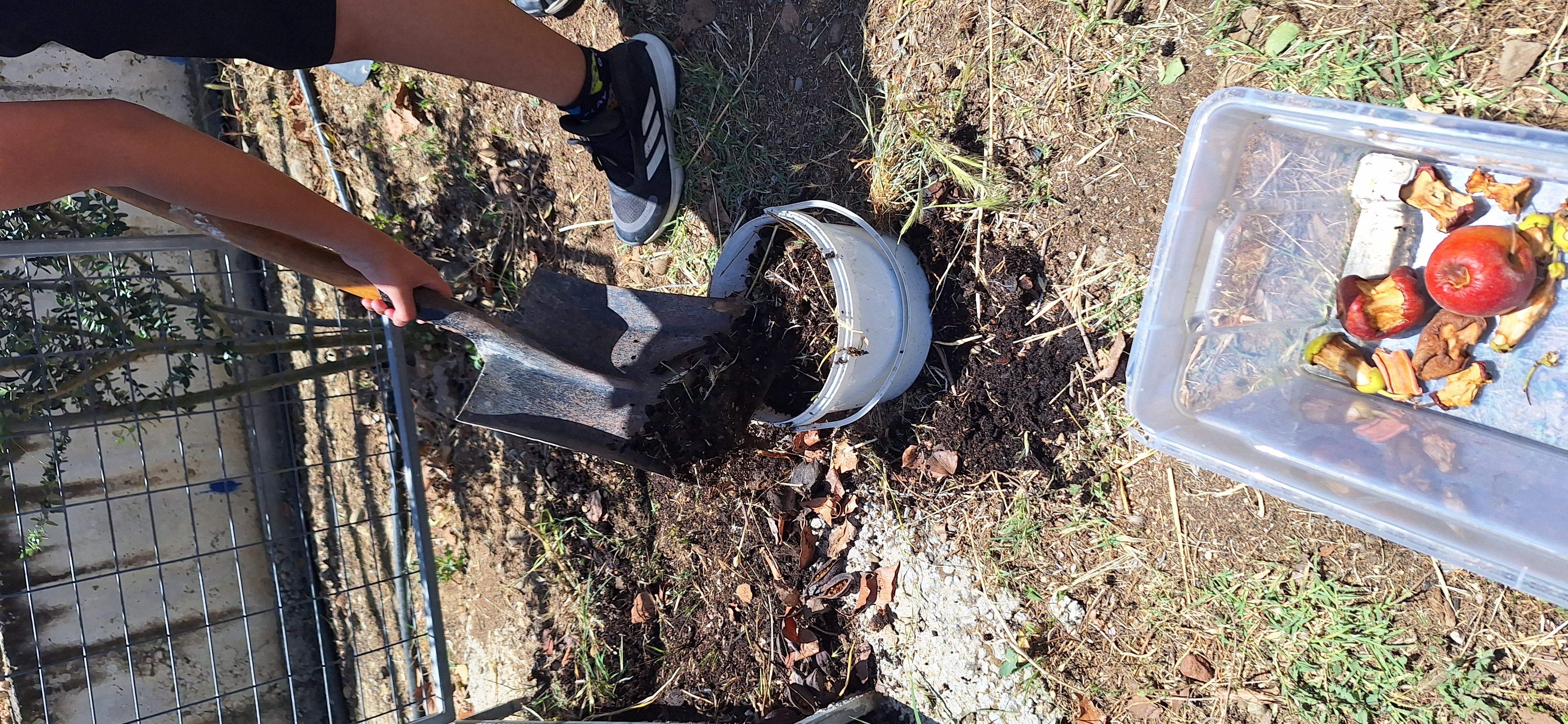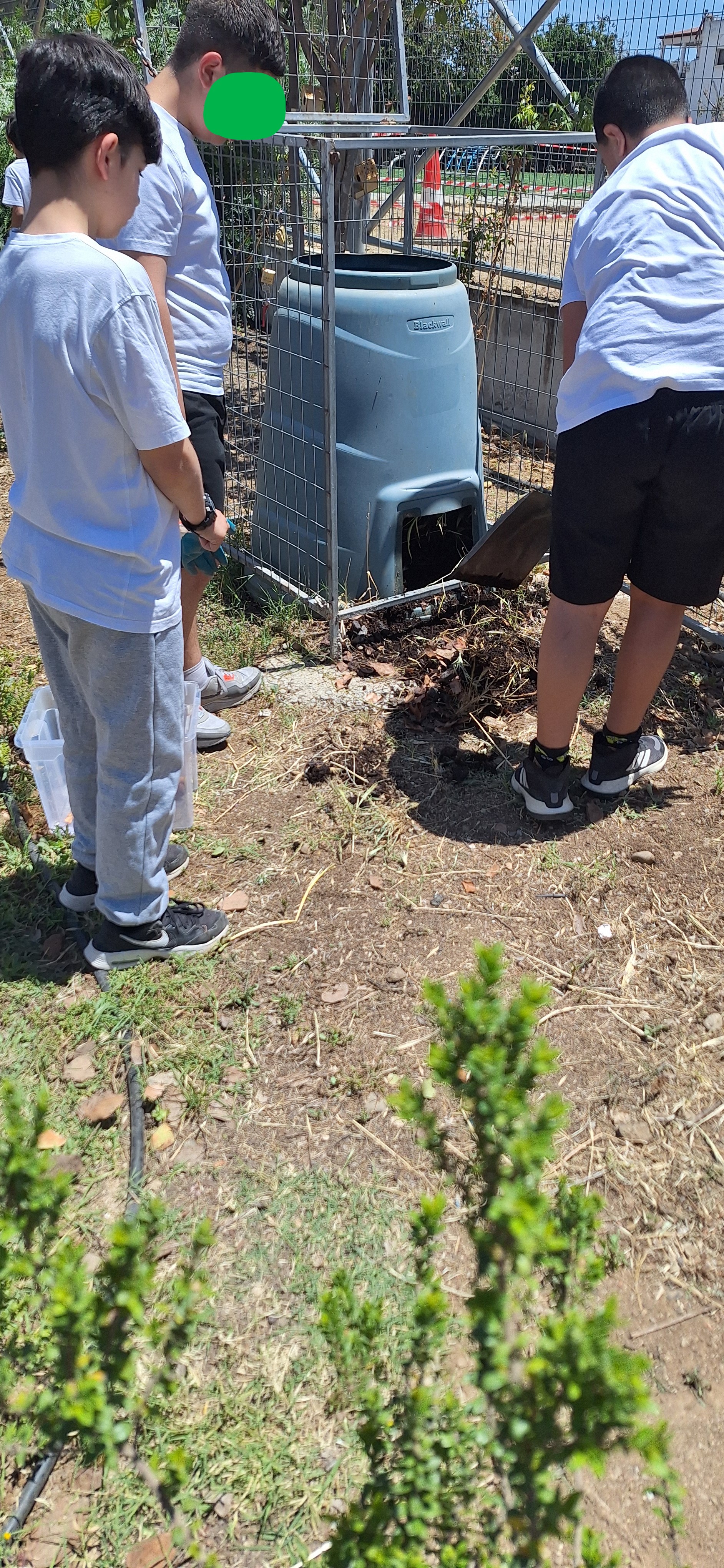Τη Δευτέρα 19 Μαϊου 2025 το κομποστ ήταν έτοιμο πια και το έβγαλαν από τον κάδο. Με δοχεία το τοποθέτησαν στις λεκάνες των δέντρων που έχουμε φυτέψει. Έτσι, τα δέντρα στον κήπο μας τρέφονται τώρα με οργανικά υλικά, καθώς το κόμποστ βελτιώνει την υφή και τη δομή του εδάφους και άρα την ικανότητά του να διατηρεί την υγρασία και την περιεκτικότητά του σε θρεπτικά συστατικά.