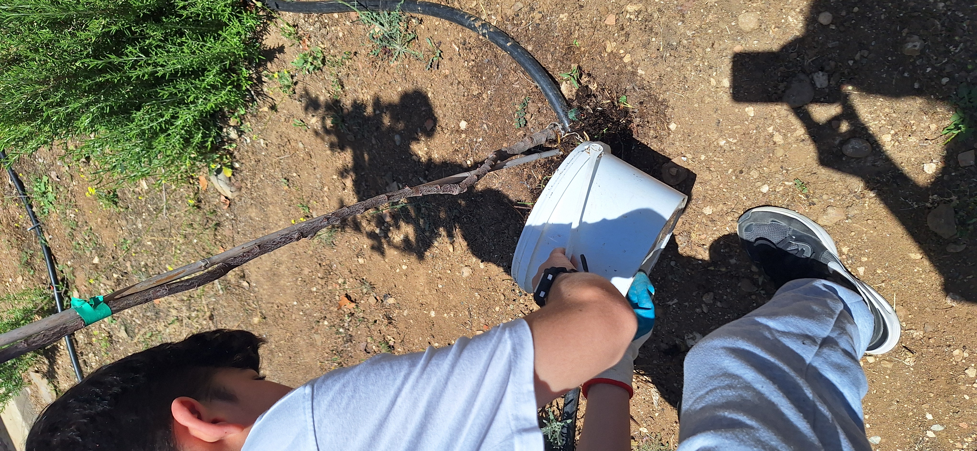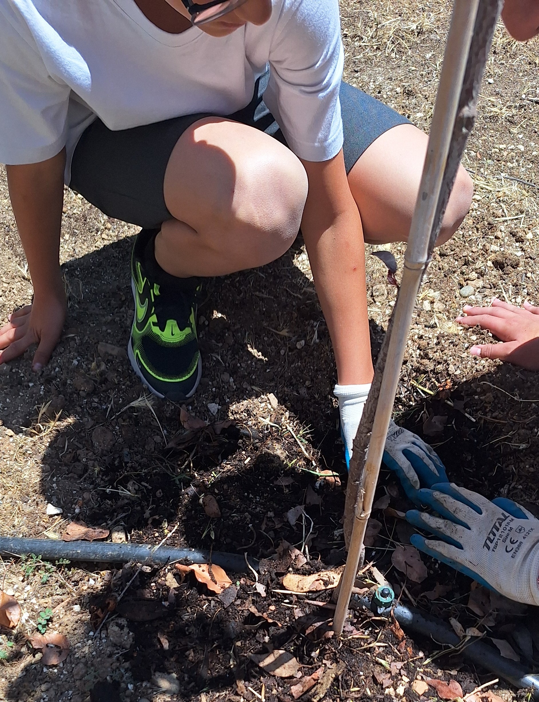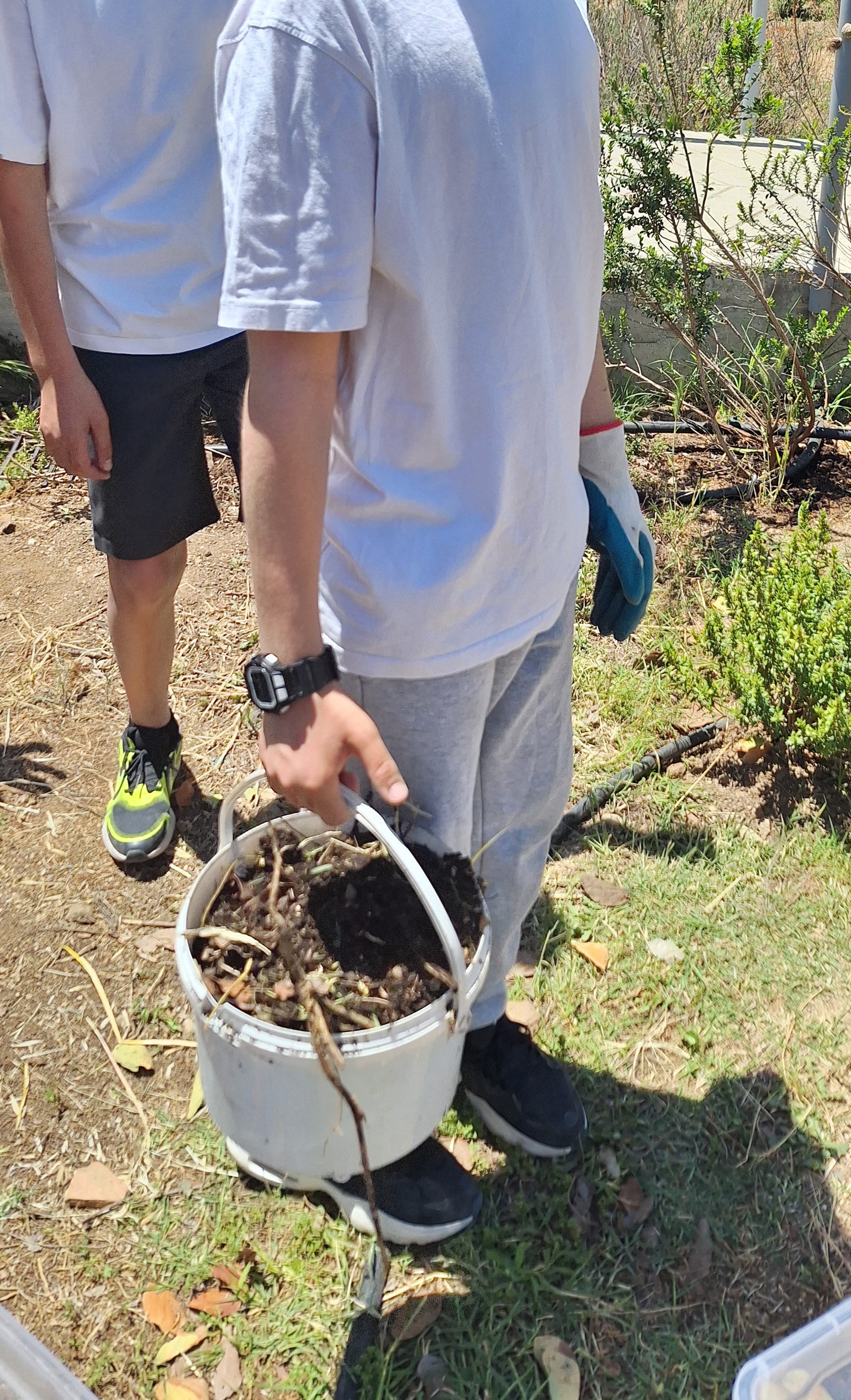 Τη Δευτέρα 19 Μαϊου 2025 το κομποστ ήταν έτοιμο πια και το έβγαλαν από τον κάδο. Με δοχεία το τοποθέτησαν στις λεκάνες των δέντρων που έχουμε φυτέψει. Έτσι, τα δέντρα στον κήπο μας τρέφονται τώρα με οργανικά υλικά, καθώς το κόμποστ βελτιώνει την υφή και τη δομή του εδάφους και άρα την ικανότητά του να διατηρεί την υγρασία και την περιεκτικότητά του σε θρεπτικά συστατικά.