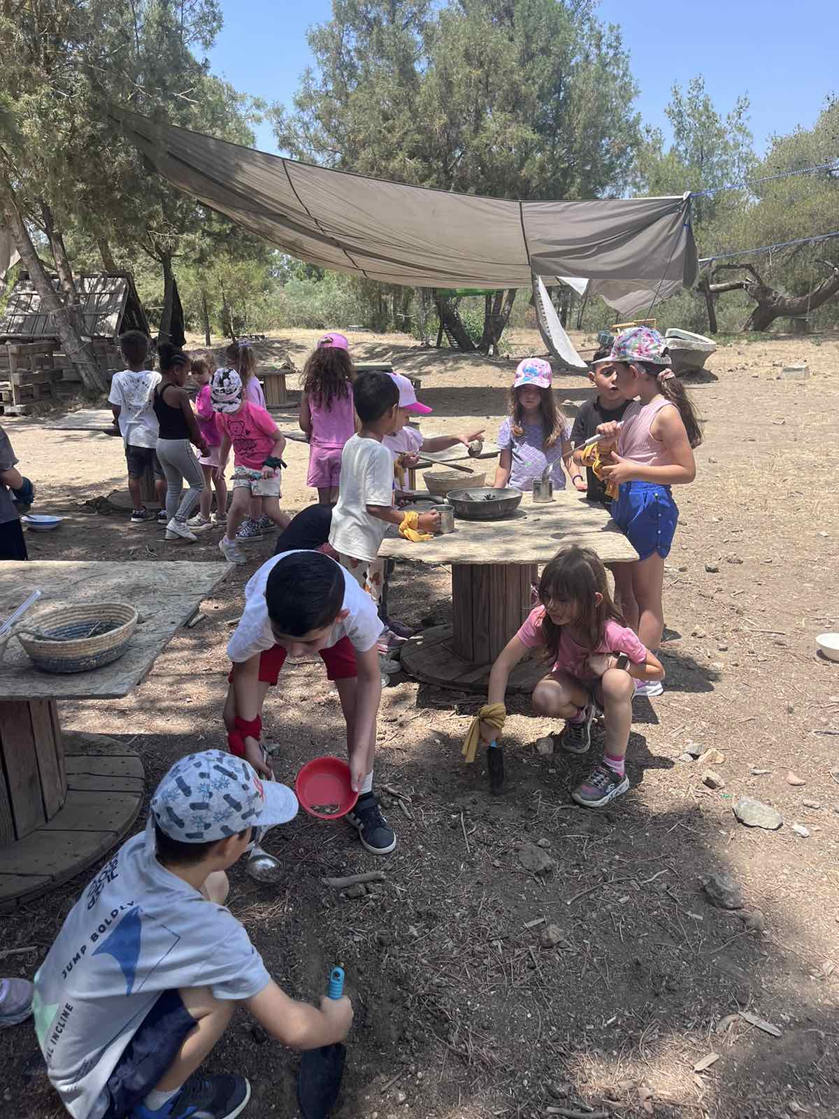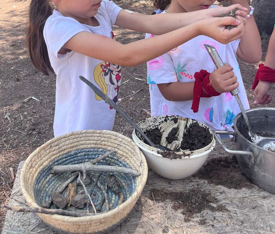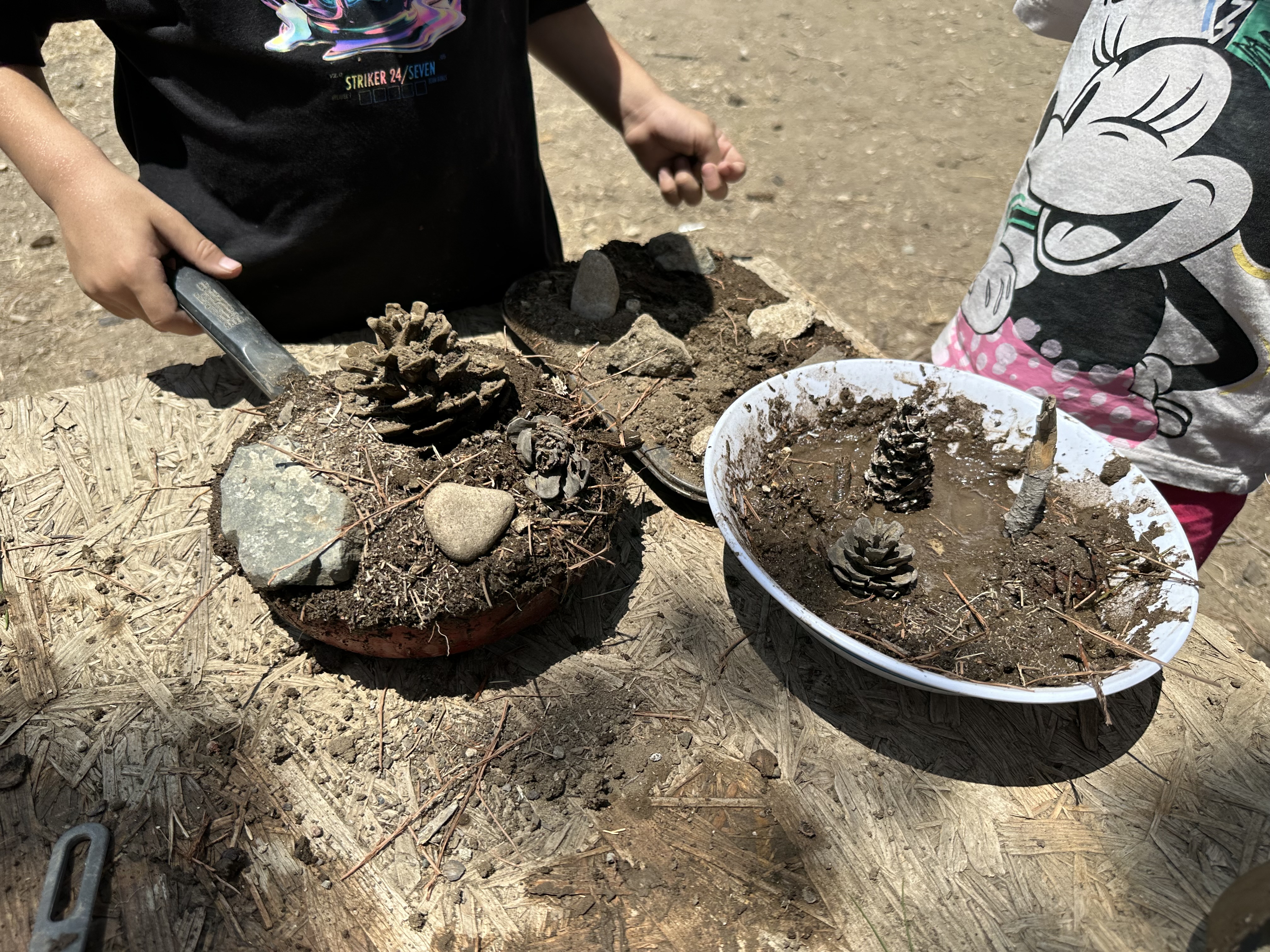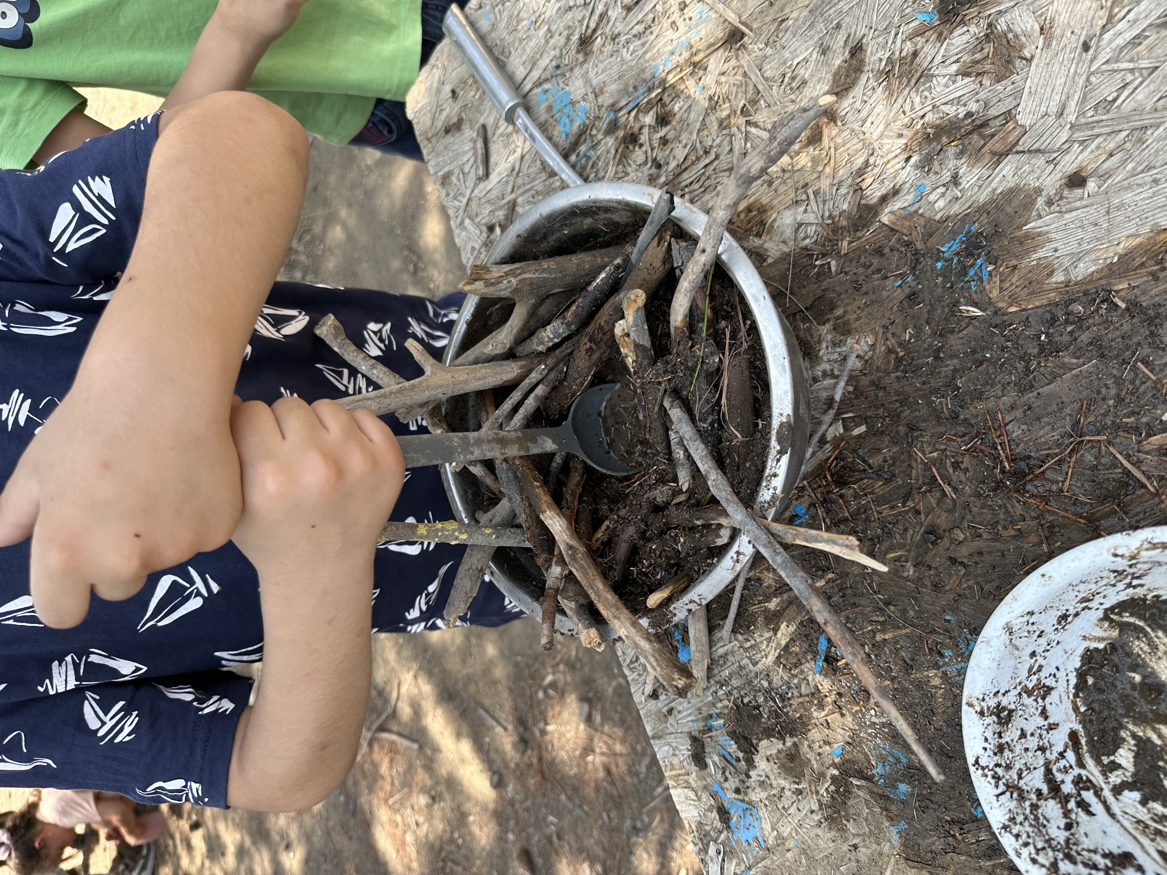 Τα έντομα, τα φυσικά υλικά και ένα καπέλο μαγειρικής έγιναν η αφετηρία για ένα ατελείωτο, δημιουργικό παιχνίδι στη λασποκουζίνα του δάσους. Εκεί, οι μικροί "σεφ της φύσης" φόρεσαν τα φανταστικά τους καπέλα και μαγείρεψαν με ενθουσιασμό. Στο μενού περιλαμβάνονταν κουκουναρόσουπες, χωματόσουπες, τούρτες από κουκουνάρι και μακαρόνια με "σάλτσες" φτιαγμένες από φύλλα, πέτρες, κουκονάρια και χώμα.