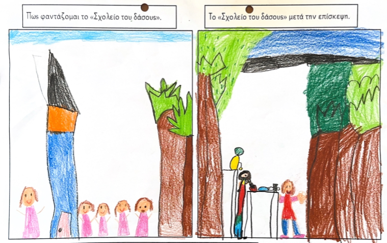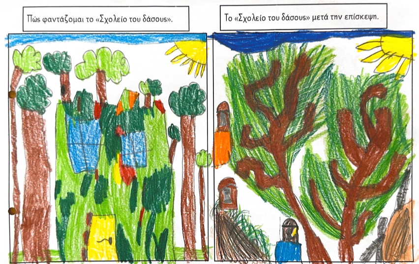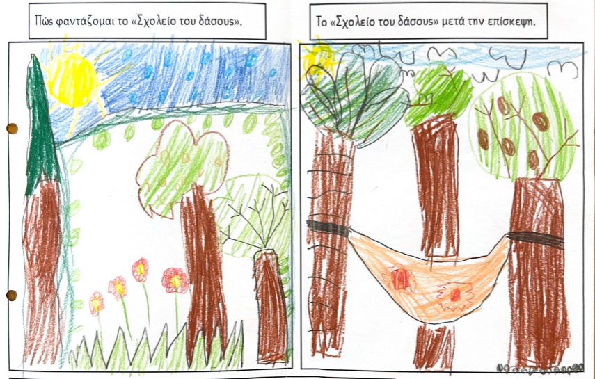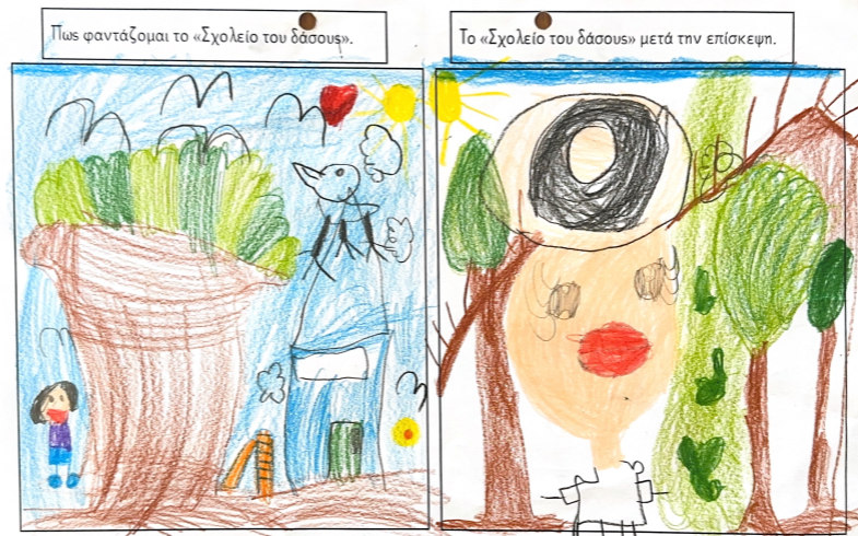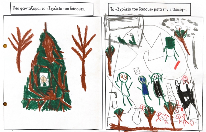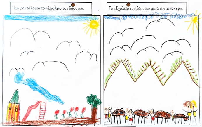 Πριν από την επίσκεψη στο σχολείο του δάσους, τα παιδιά κλήθηκαν να φανταστούν πώς μπορεί να είναι ένα τέτοιο σχολείο. Με ζωηρή φαντασία και δημιουργική διάθεση, αποτύπωσαν τις σκέψεις τους στο χαρτί, ζωγραφίζοντας πανύψηλα δέντρα, πολύχρωμα φυλλώματα, αλλά και ένα μικρό κτήριο – την ιδέα τους για το "σχολείο μέσα στη φύση".