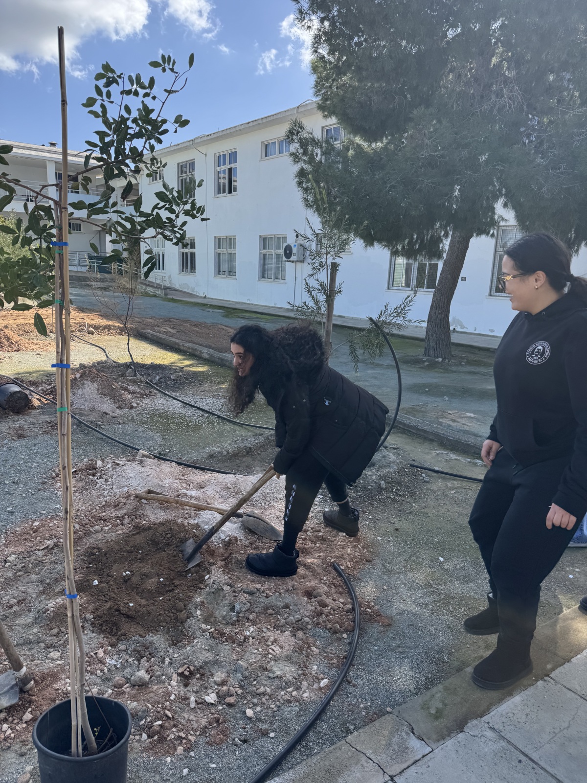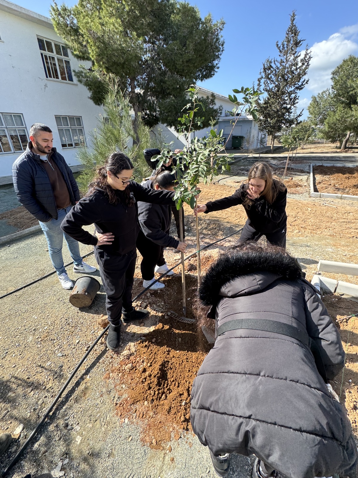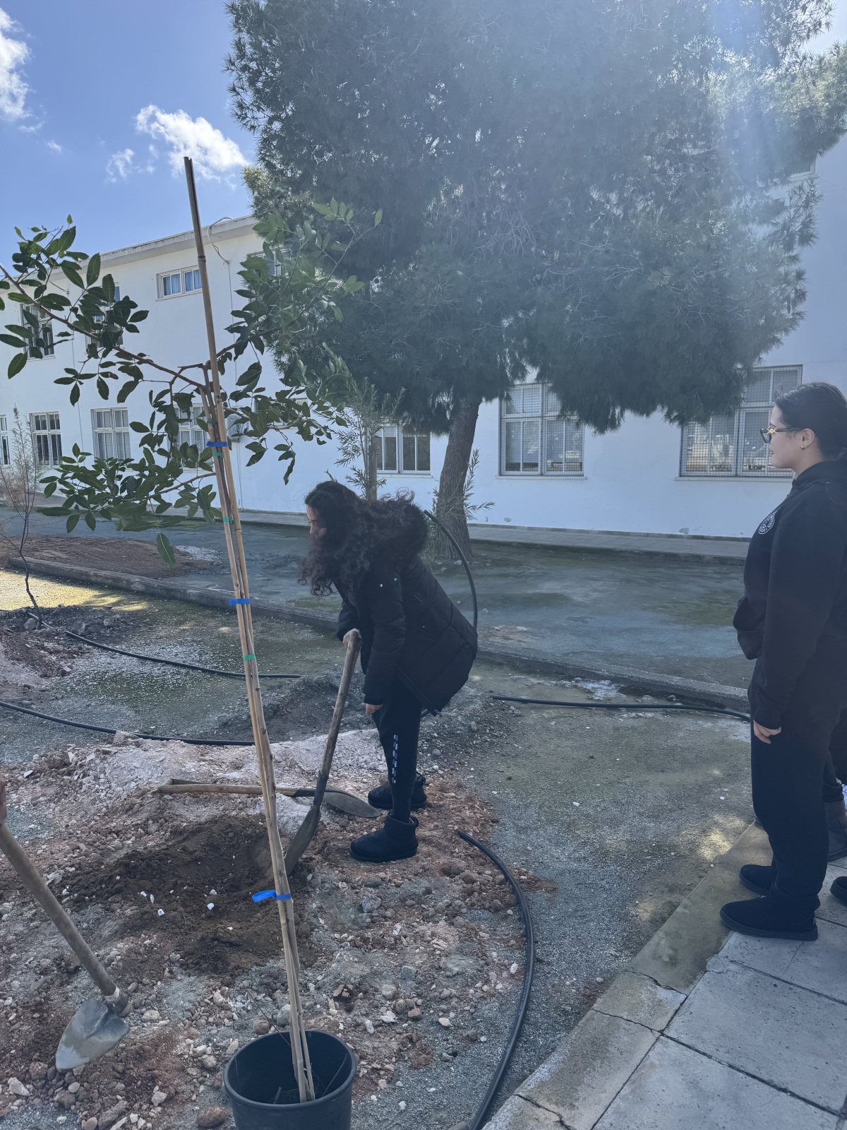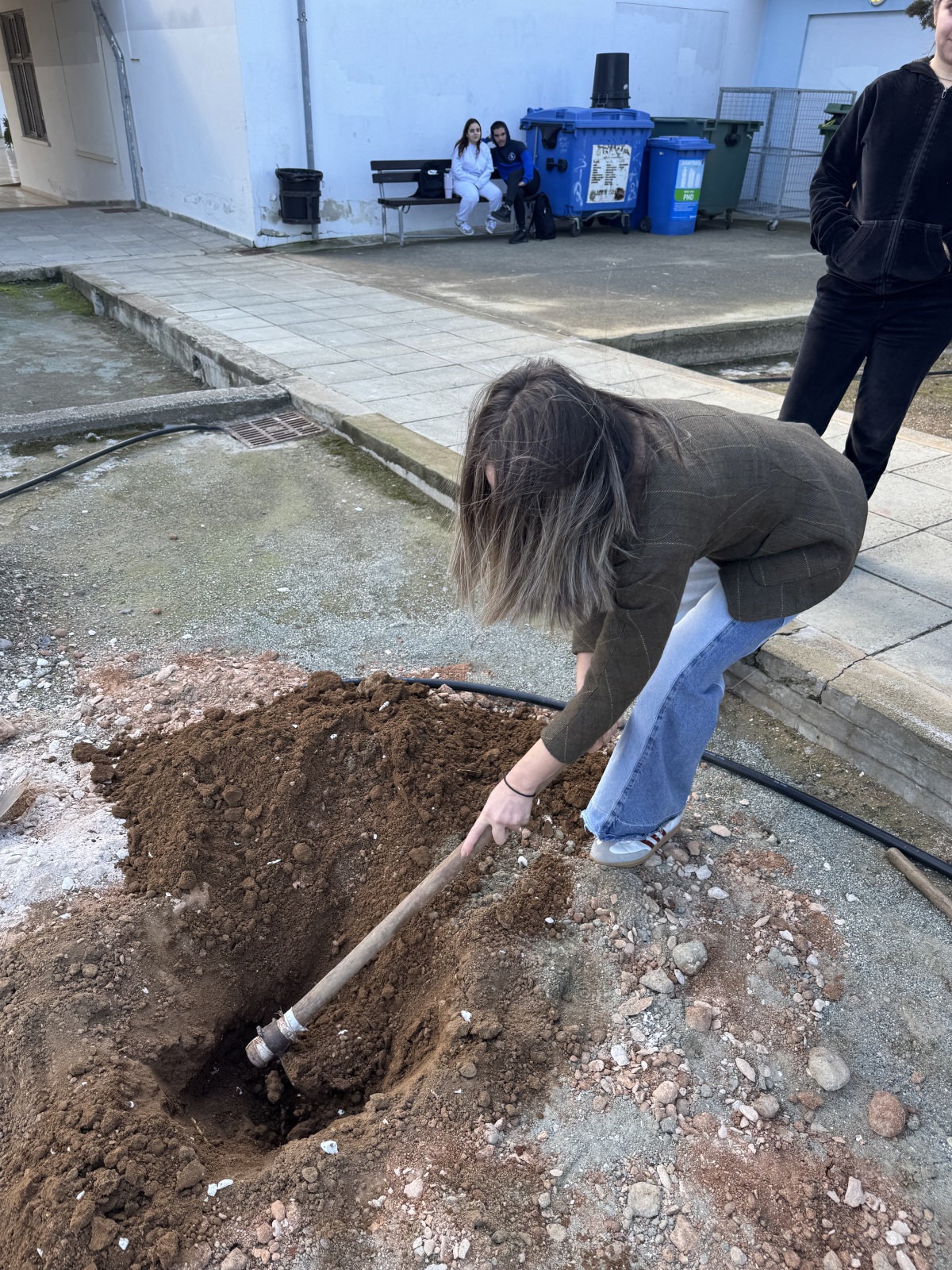 Μαζί με εκπαιδευτικό, οι μαθήτριες ανέλαβαν ενεργό ρόλο σε όλα τα στάδια της διαδικασίας, σκάβοντας, φυτεύοντας και δημιουργώντας τις απαραίτητες λεκάνες γύρω από τα δέντρα, ώστε να εξασφαλιστεί η σωστή συγκράτηση του νερού και η υγιής ανάπτυξη των φυτών. Η δράση αυτή έδωσε την ευκαιρία για συζήτηση σχετικά με τις ιδιαίτερες απαιτήσεις των μεσογειακών φυτών και τη σημασία της προσαρμογής των φυτεύσεων στο τοπικό περιβάλλον.