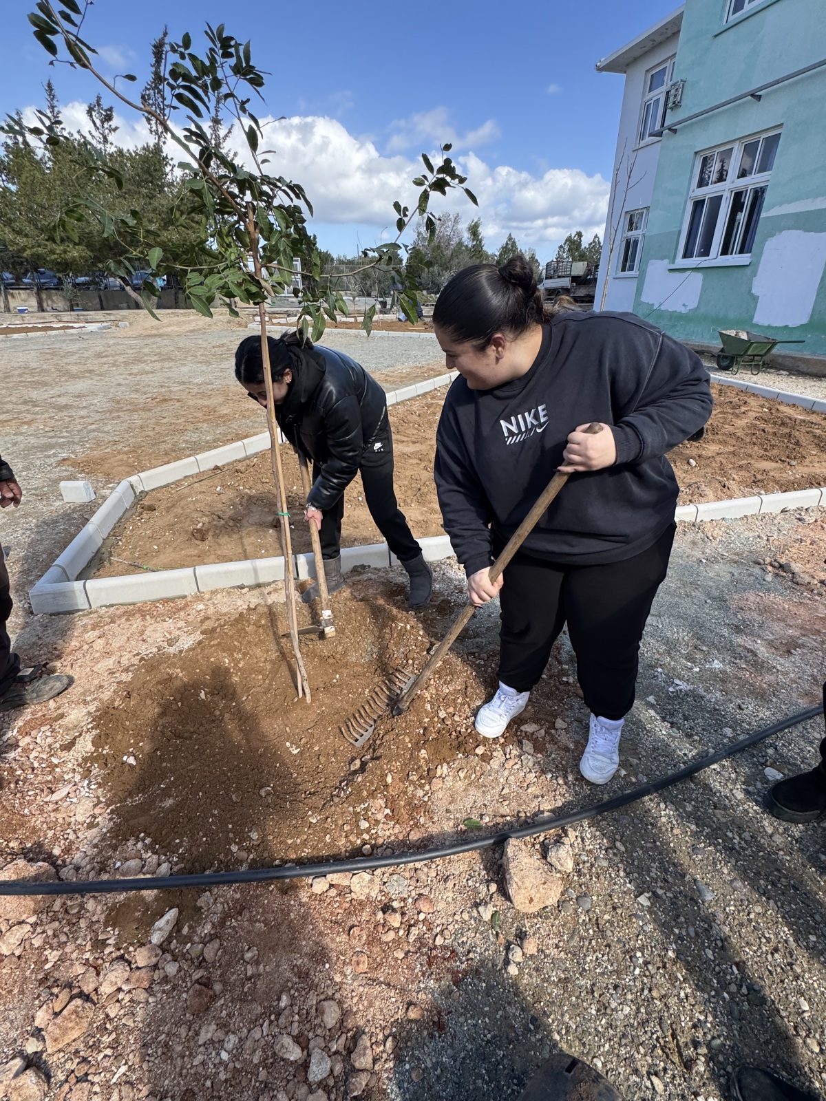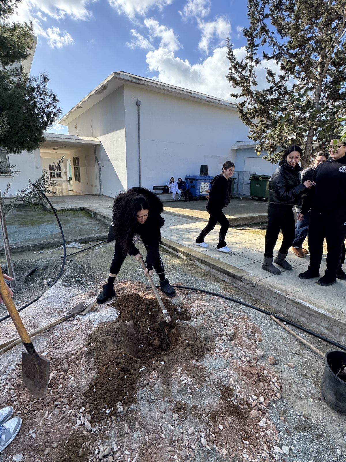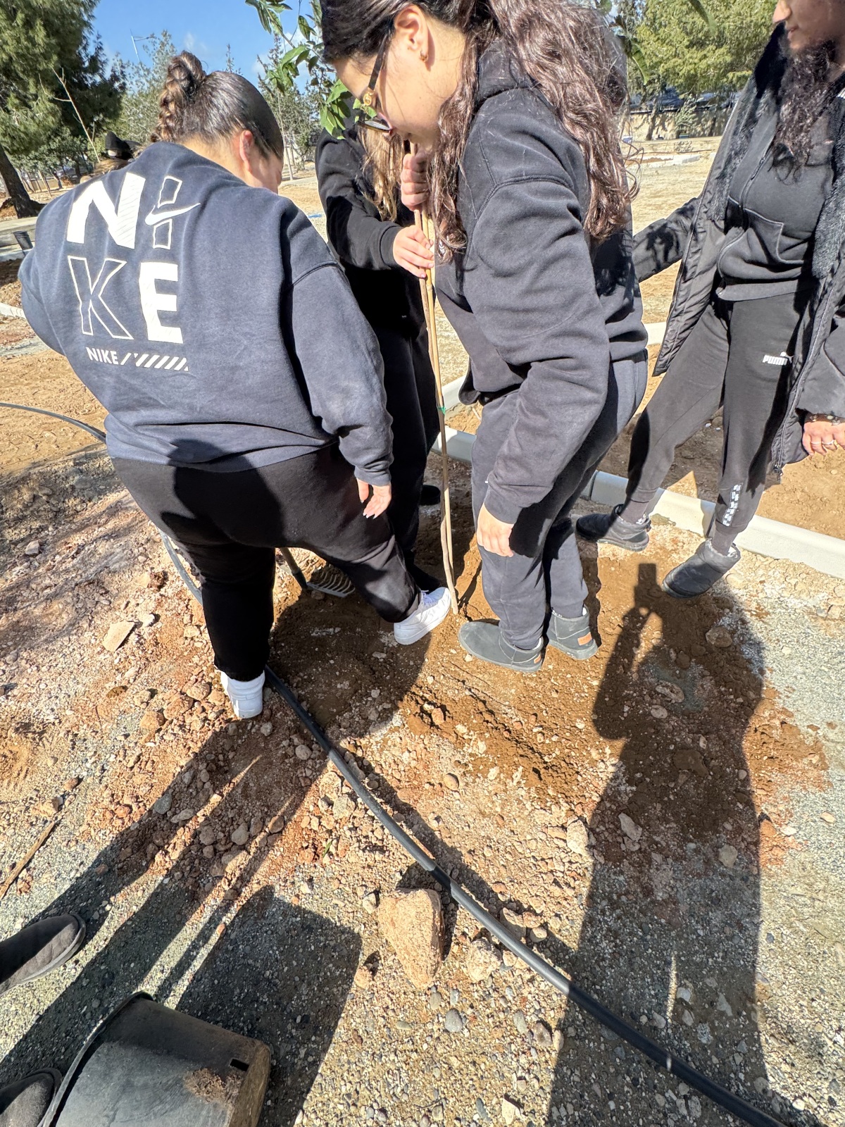 Μαζί με εκπαιδευτικό, οι μαθήτριες ανέλαβαν ενεργό ρόλο σε όλα τα στάδια της διαδικασίας, σκάβοντας, φυτεύοντας και δημιουργώντας τις απαραίτητες λεκάνες γύρω από τα δέντρα, ώστε να εξασφαλιστεί η σωστή συγκράτηση του νερού και η υγιής ανάπτυξη των φυτών. Η δράση αυτή έδωσε την ευκαιρία για συζήτηση σχετικά με τις ιδιαίτερες απαιτήσεις των μεσογειακών φυτών και τη σημασία της προσαρμογής των φυτεύσεων στο τοπικό περιβάλλον.