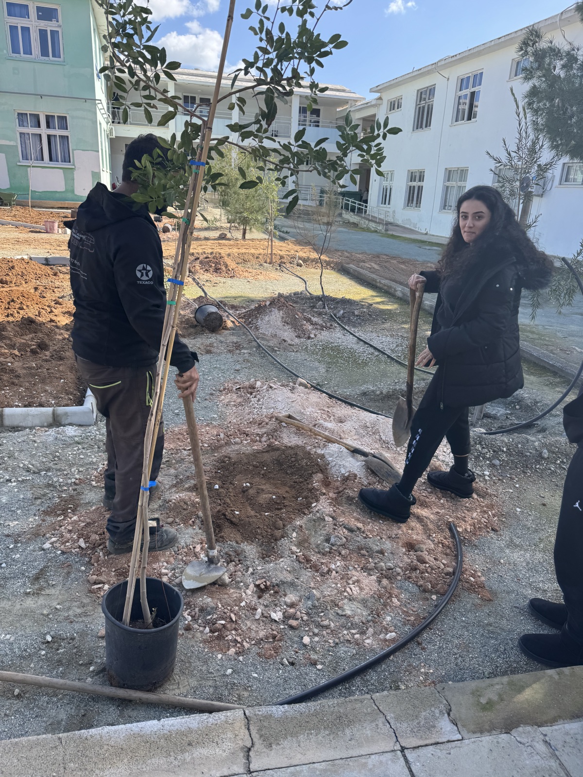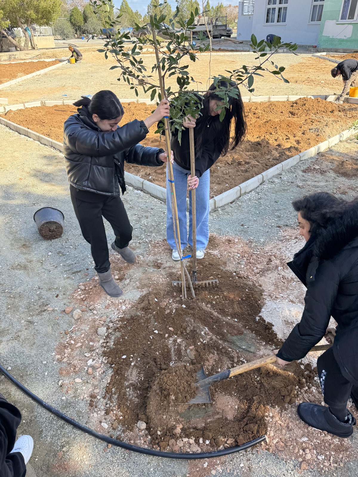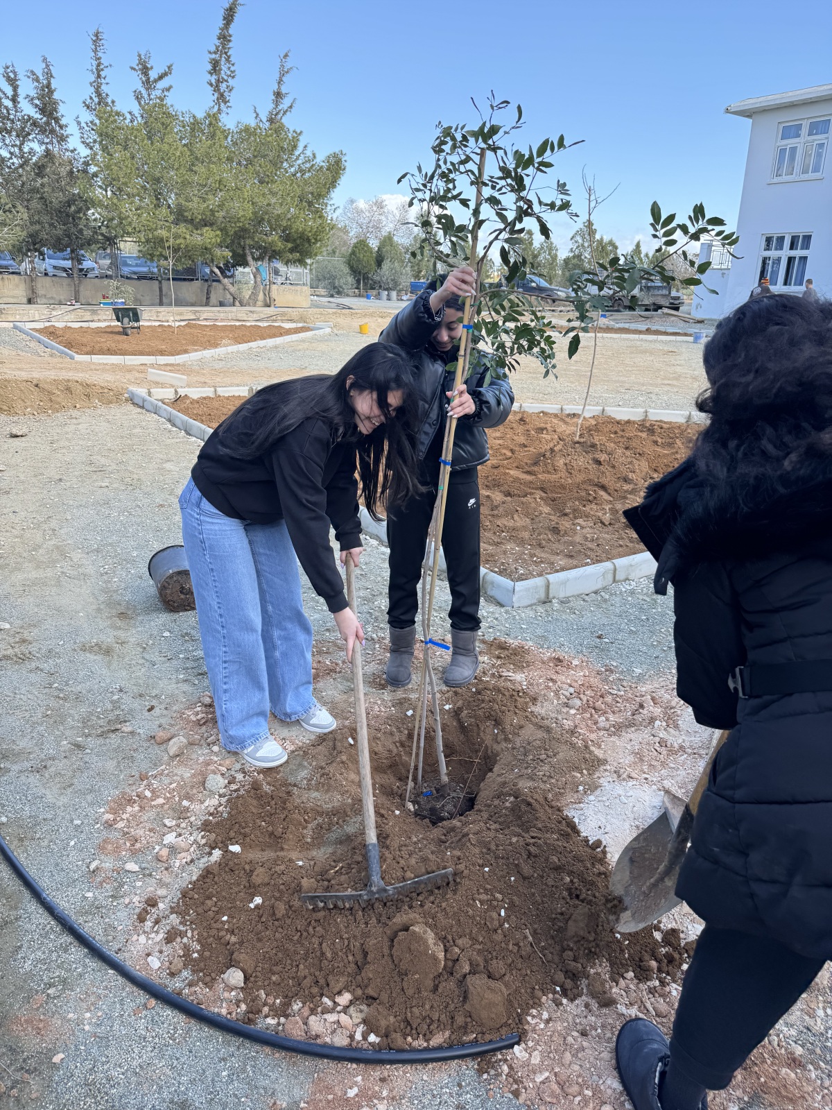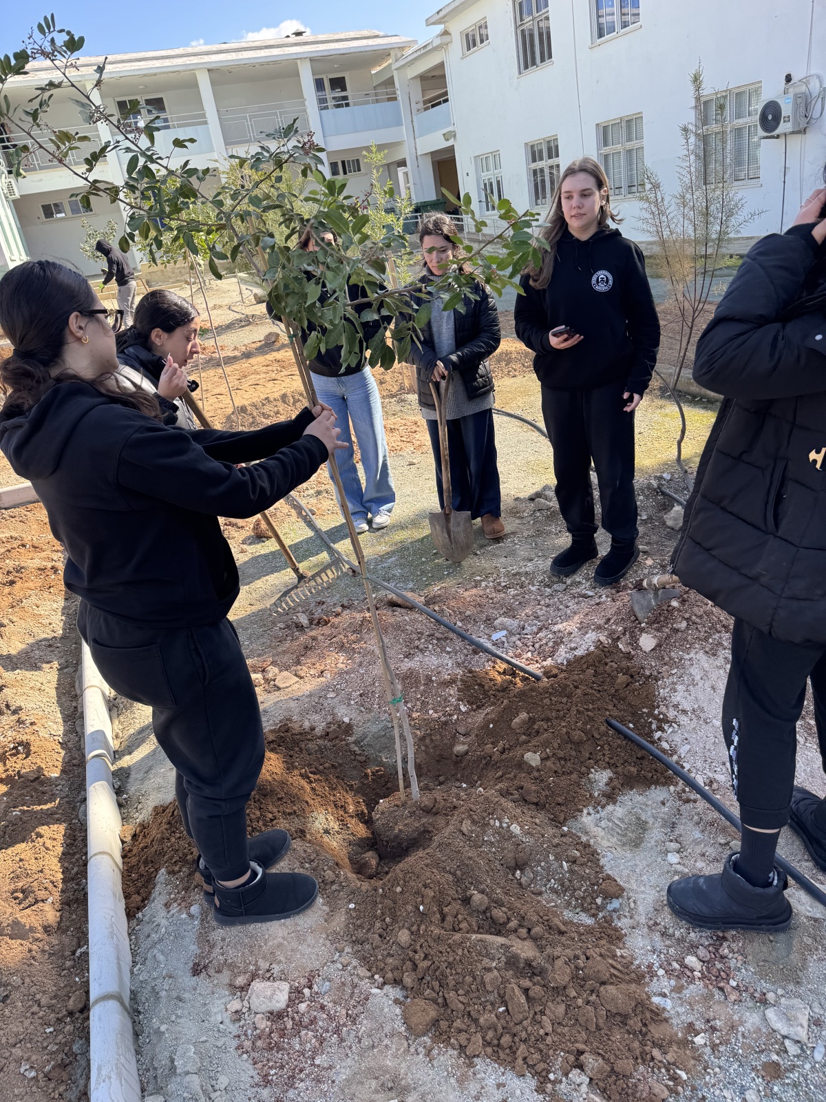 Μαζί με εκπαιδευτικό, οι μαθήτριες ανέλαβαν ενεργό ρόλο σε όλα τα στάδια της διαδικασίας, σκάβοντας, φυτεύοντας και δημιουργώντας τις απαραίτητες λεκάνες γύρω από τα δέντρα, ώστε να εξασφαλιστεί η σωστή συγκράτηση του νερού και η υγιής ανάπτυξη των φυτών. Η δράση αυτή έδωσε την ευκαιρία για συζήτηση σχετικά με τις ιδιαίτερες απαιτήσεις των μεσογειακών φυτών και τη σημασία της προσαρμογής των φυτεύσεων στο τοπικό περιβάλλον.