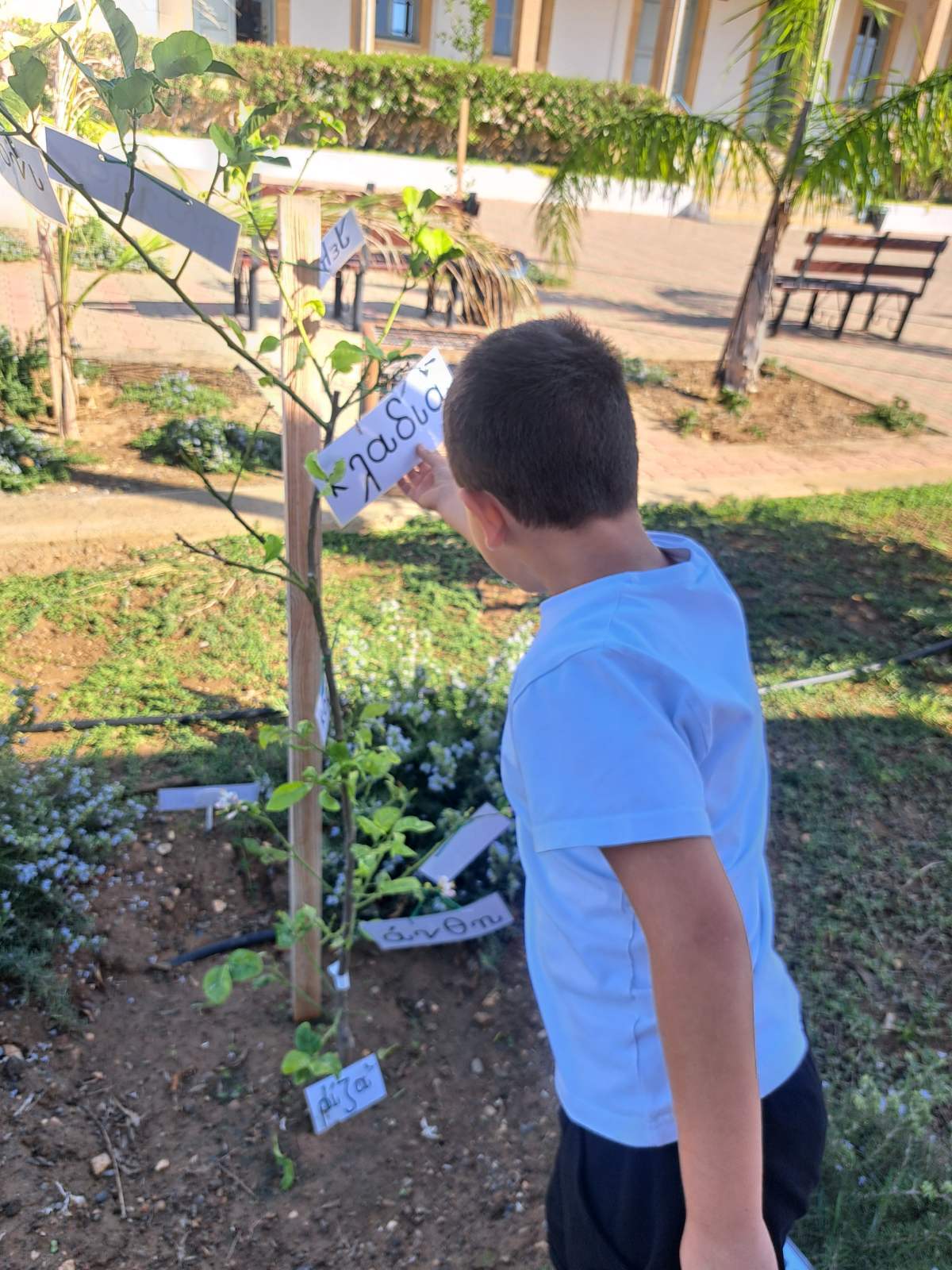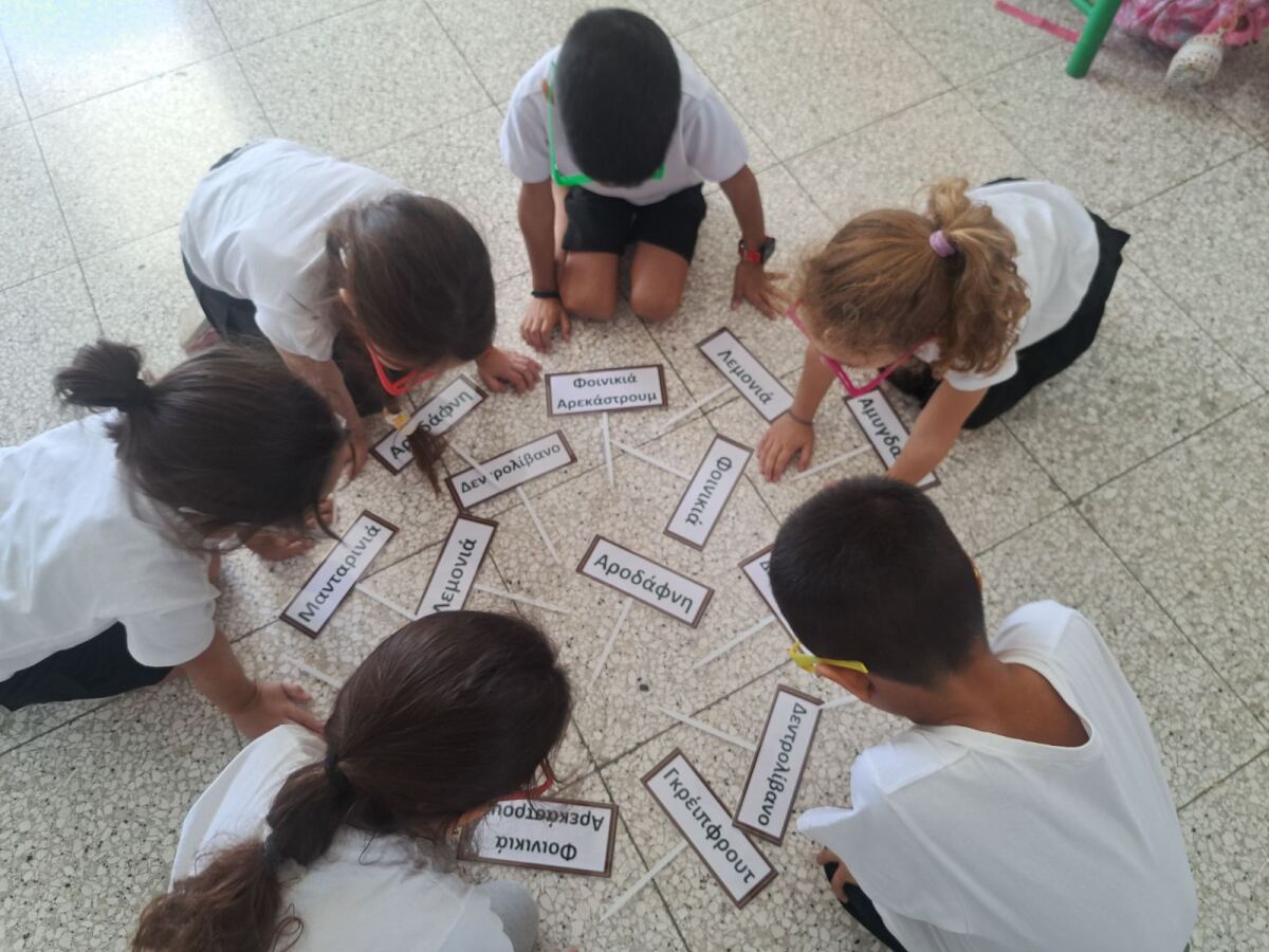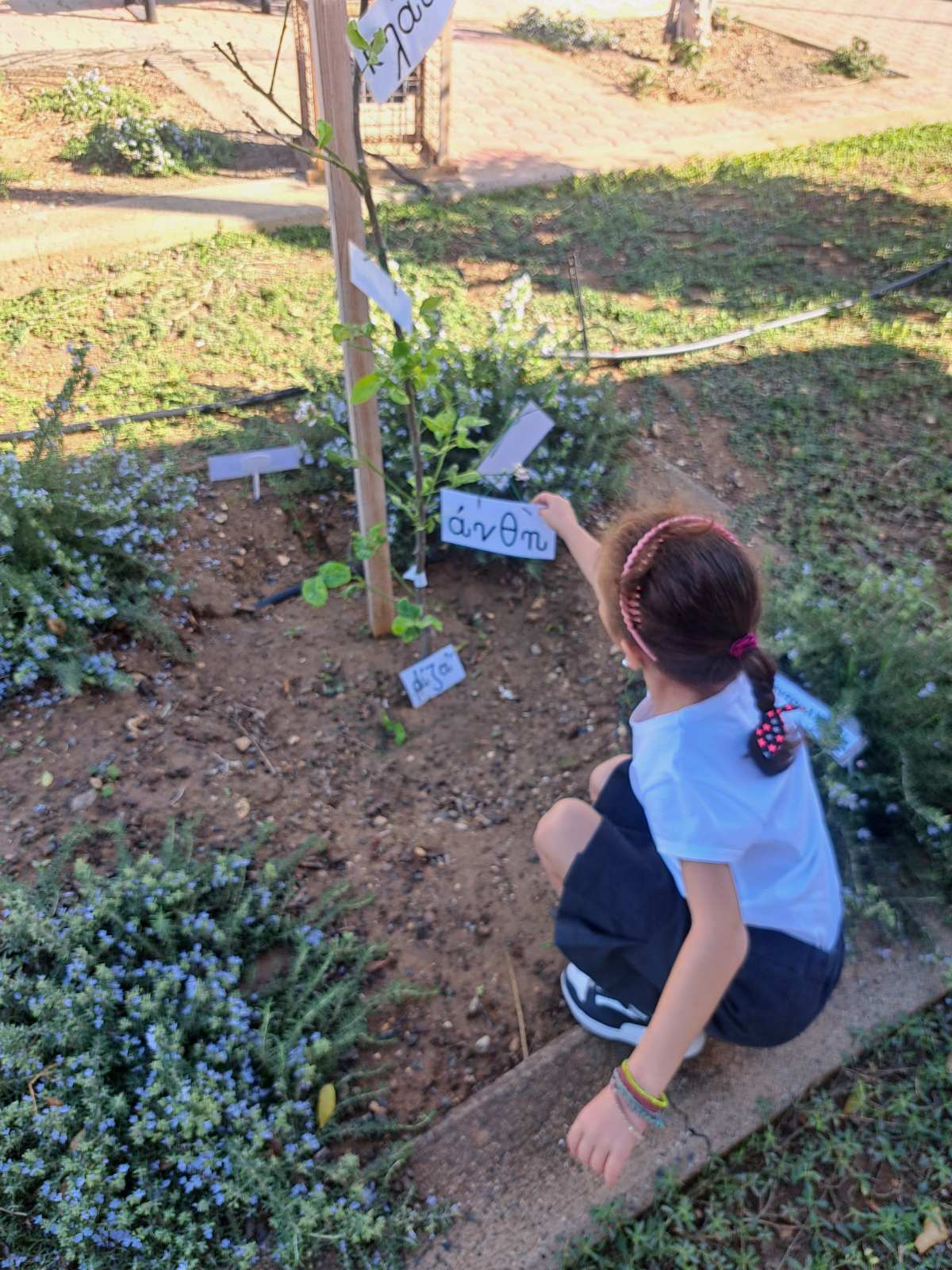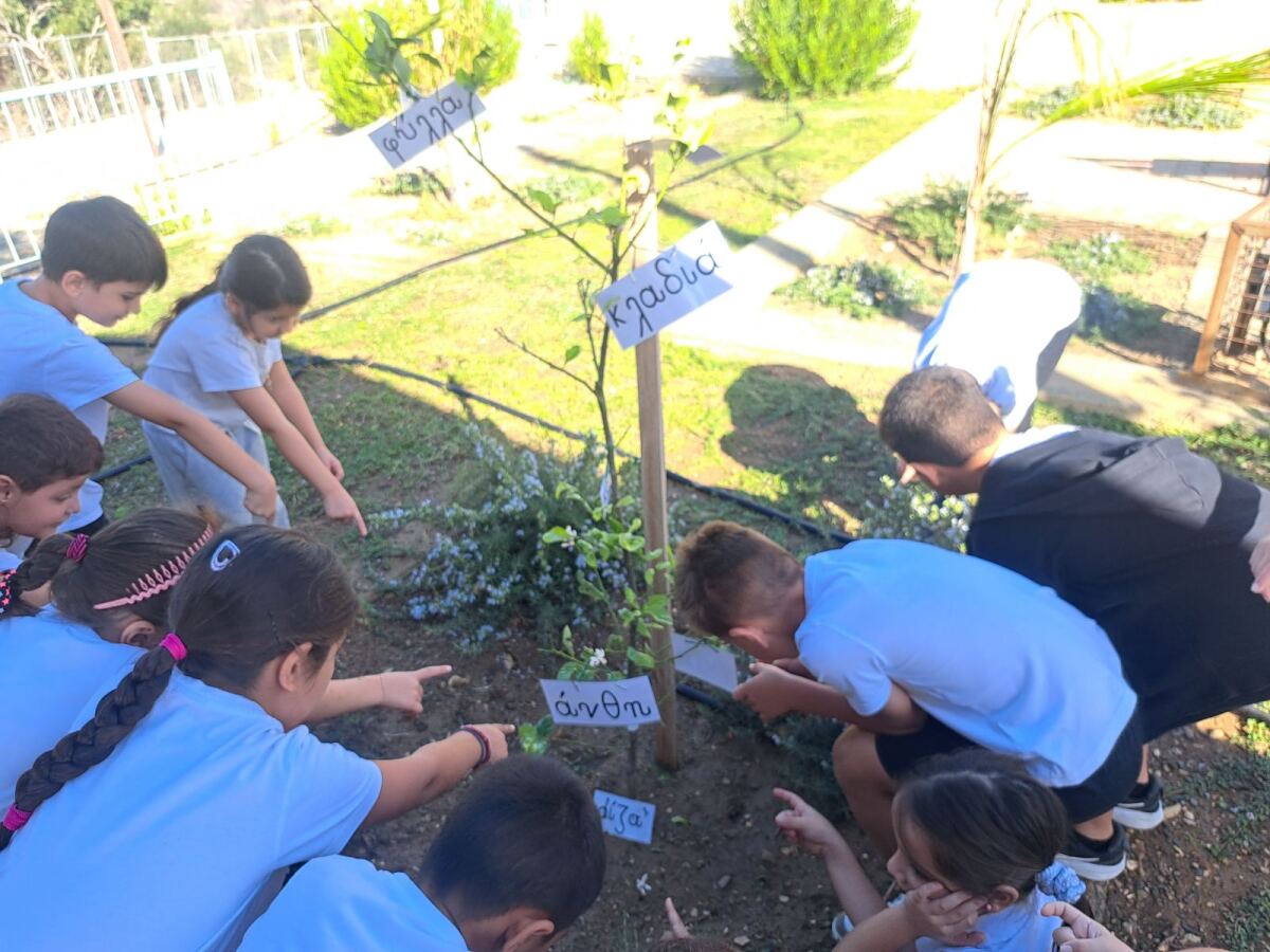 Τα παιδιά της Α΄ τάξης, αξιοποιώντας τις πρώτες τους γνώσεις στο δημοτικό, προσπάθησαν να διαβάσουν/μαντέψουν σε ποιες από τις καρτελίτσες που είχαν μπροστά τους ήταν γραμμένες οι λέξεις «λεμονιά» και «αμυγδαλιά». Έτσι, τα παιδιά, μέσα από τη δραστηριότητα αυτή γνώρισαν τα ονόματα των φυτών που έχουν αναλάβει ως τάξη να φροντίζουν. Στη συνέχεια, αφού μίλησαν ειδικότερα για τη λεμονιά (στο πλαίσιο της διδασκαλίας του συμφώνου «λ»), πήραν ανά ζευγάρι καρτελίτσα στην οποία ήταν γραμμένο ένα μέρος του φυτού της λεμονιάς. Τα παιδιά προσπάθησαν να διαβάσουν τη λέξη που είχαν μπροστά τους σε συνεργασία με το ζευγάρι τους. Στη συνέχεια, κατέβηκαν στον κήπο , εντόπισαν τη λεμονιά και τοποθέτησαν την καρτελίτσα στο μέρος της λεμονιάς που έπρεπε.