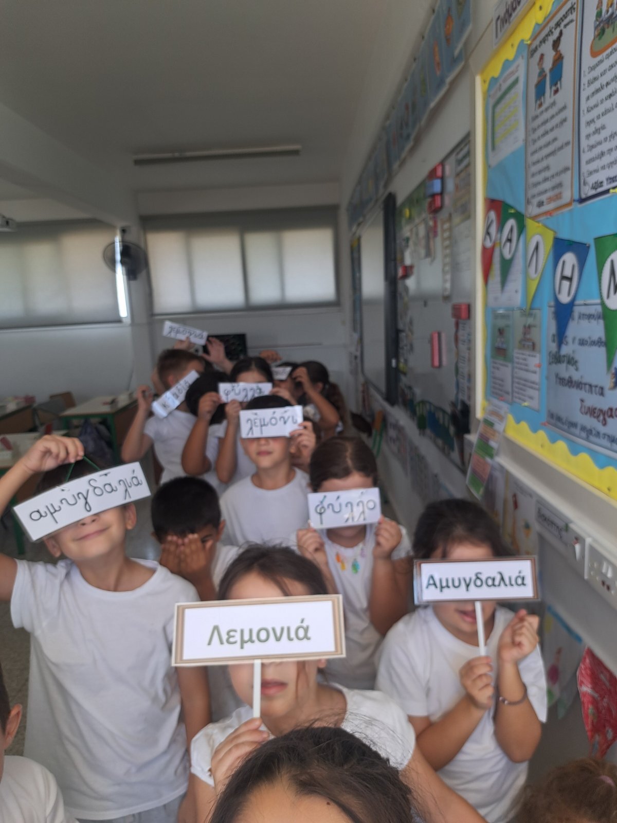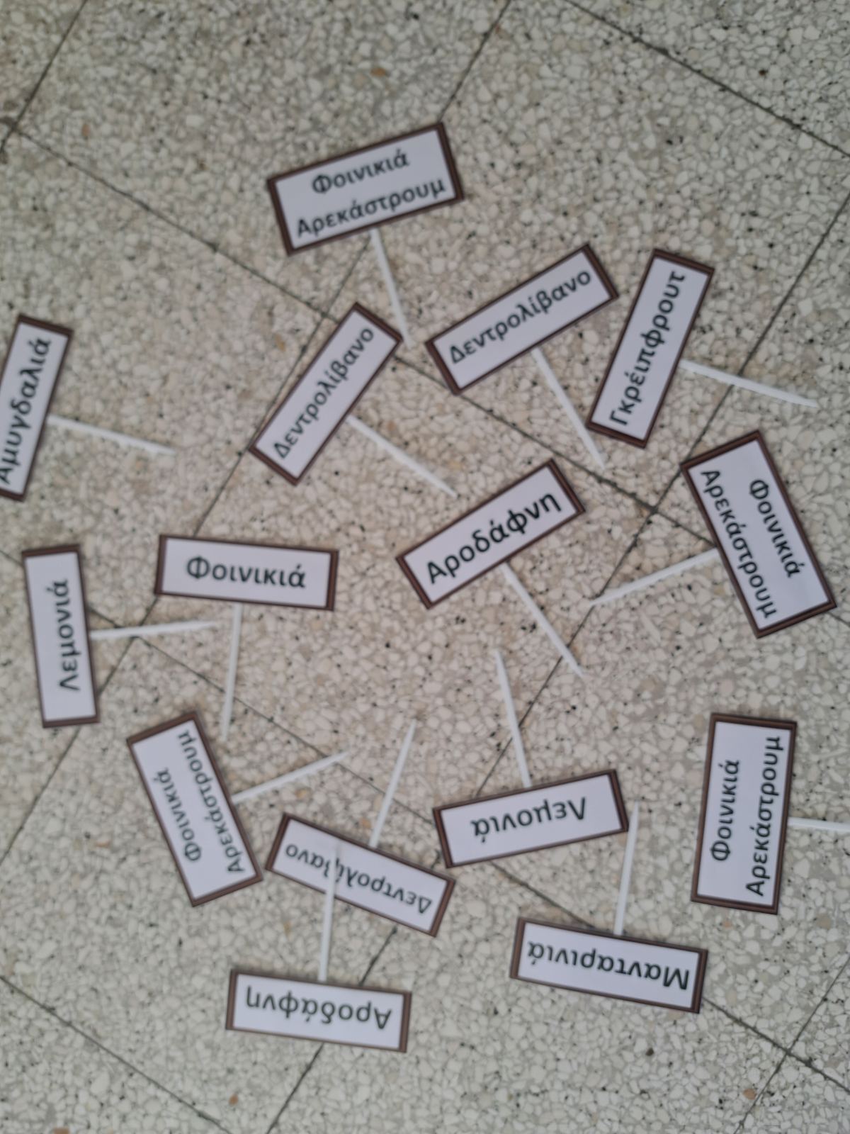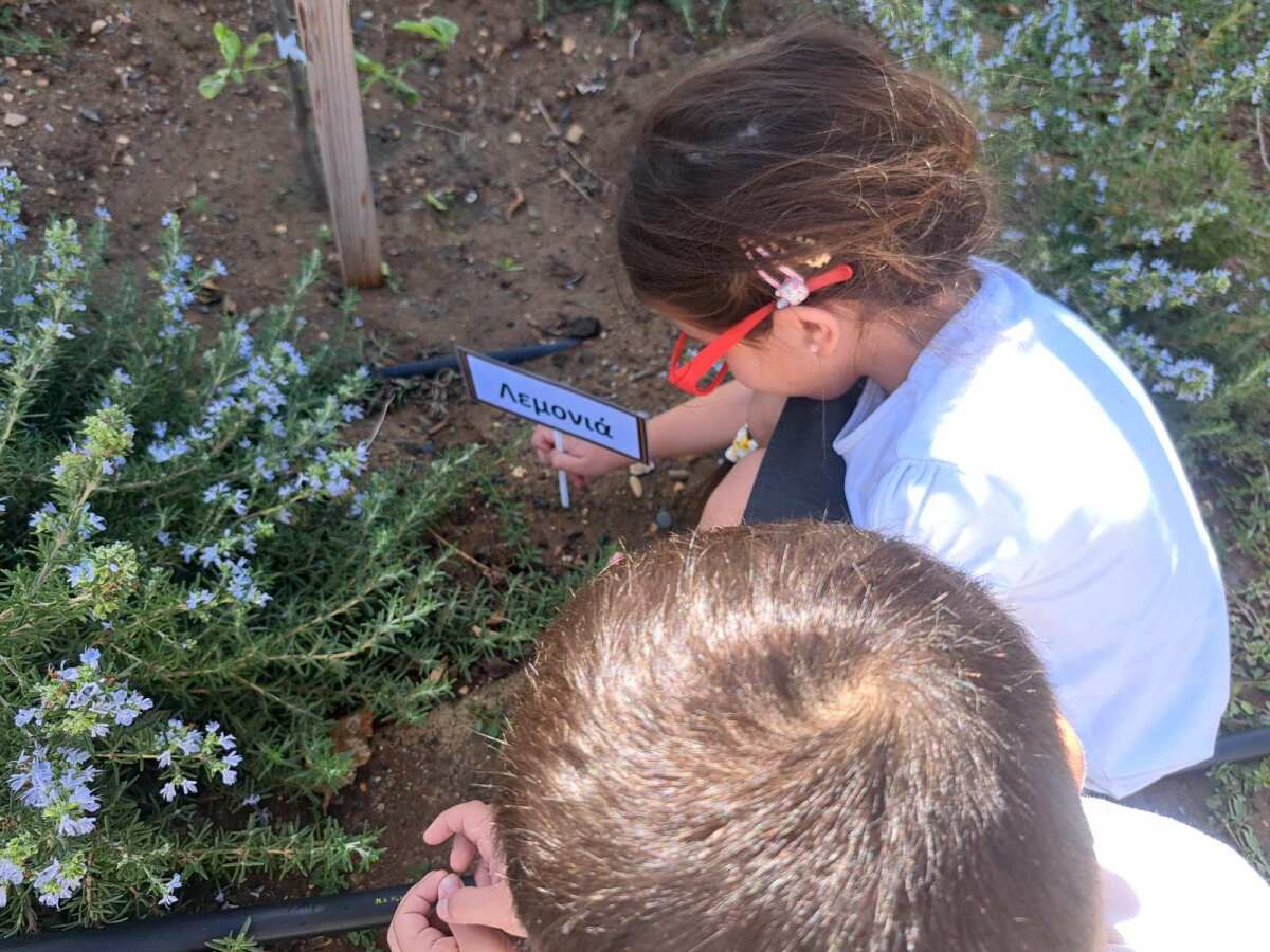 Τα παιδιά της Α΄ τάξης, αξιοποιώντας τις πρώτες τους γνώσεις στο δημοτικό, προσπάθησαν να διαβάσουν/μαντέψουν σε ποιες από τις καρτελίτσες που είχαν μπροστά τους ήταν γραμμένες οι λέξεις «λεμονιά» και «αμυγδαλιά». Έτσι, τα παιδιά, μέσα από τη δραστηριότητα αυτή γνώρισαν τα ονόματα των φυτών που έχουν αναλάβει ως τάξη να φροντίζουν. Στη συνέχεια, αφού μίλησαν ειδικότερα για τη λεμονιά (στο πλαίσιο της διδασκαλίας του συμφώνου «λ»), πήραν ανά ζευγάρι καρτελίτσα στην οποία ήταν γραμμένο ένα μέρος του φυτού της λεμονιάς. Τα παιδιά προσπάθησαν να διαβάσουν τη λέξη που είχαν μπροστά τους σε συνεργασία με το ζευγάρι τους. Στη συνέχεια, κατέβηκαν στον κήπο , εντόπισαν τη λεμονιά και τοποθέτησαν την καρτελίτσα στο μέρος της λεμονιάς που έπρεπε.