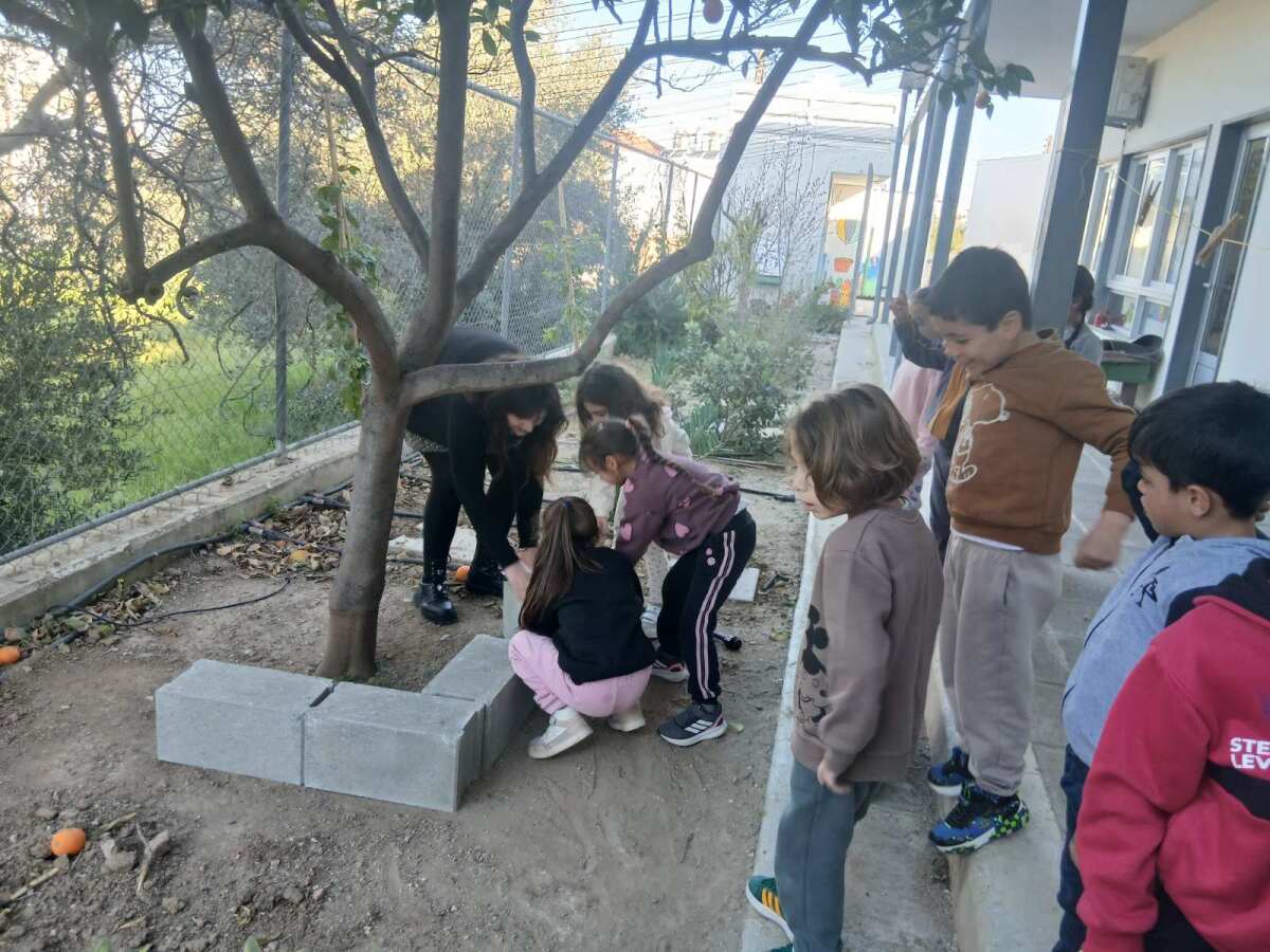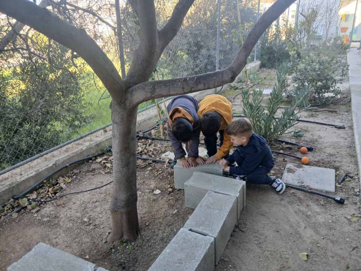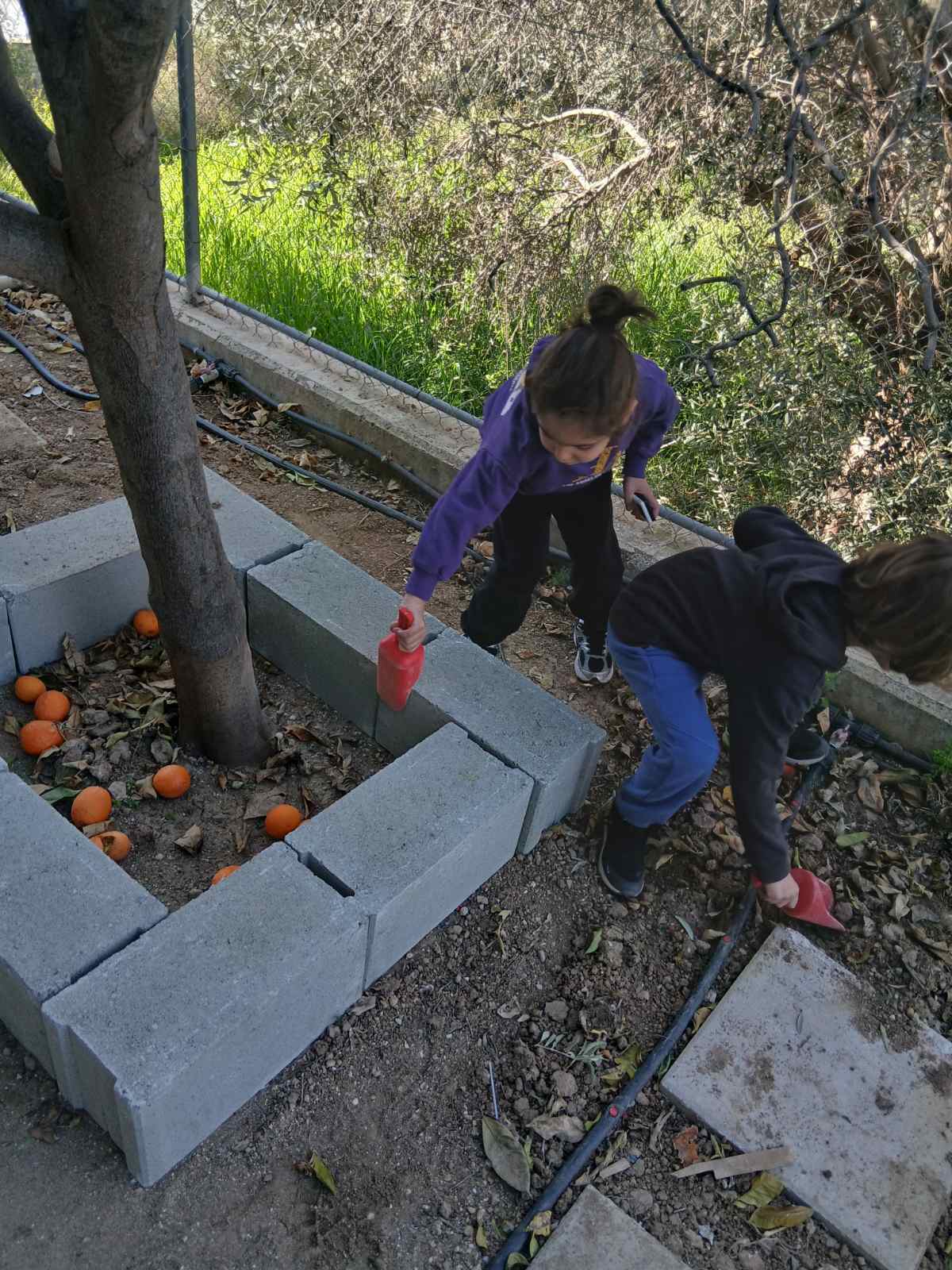 Δημιουργήσαμε λασάνι για την πορτοκαλιά μας! Φέραμε τσιμεντένια τούβλα και φτιάξαμε λασάνι γύρω από την πορτοκαλιά μας για να φυτέψουμε μέσα φυτά και να μπορούμε να καθόμαστε γύρω από το δέντρο μας!