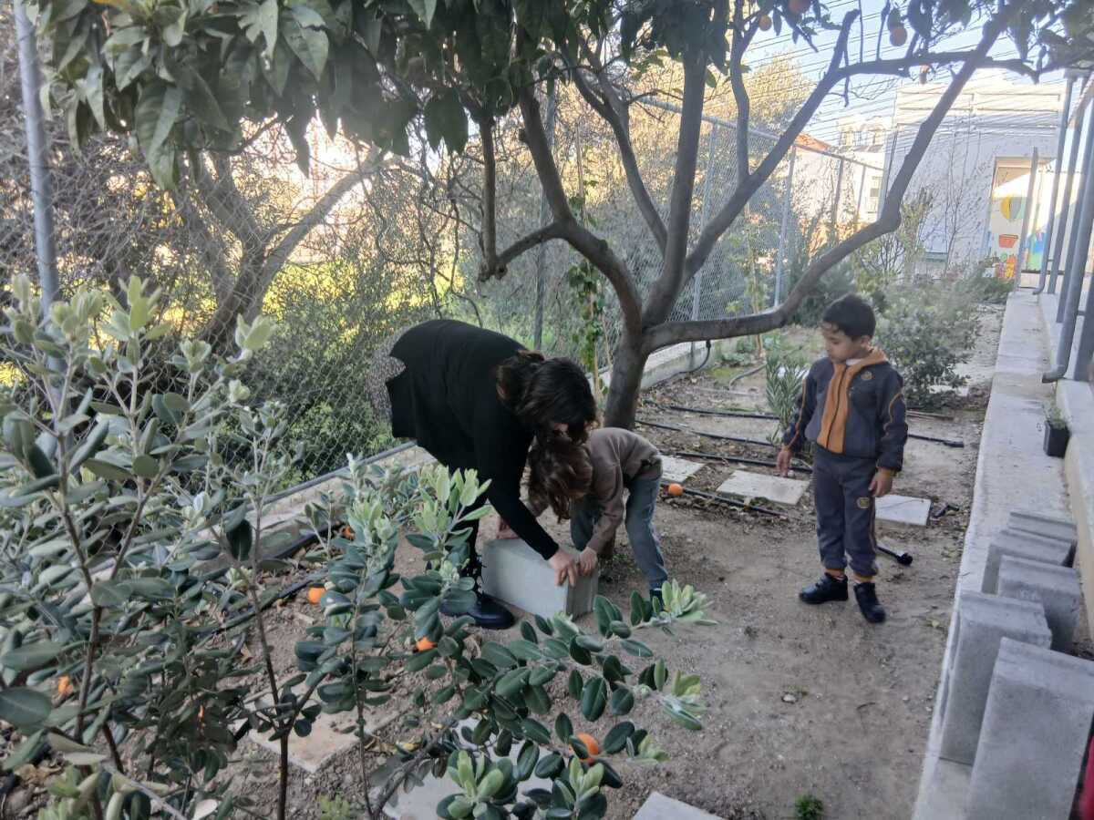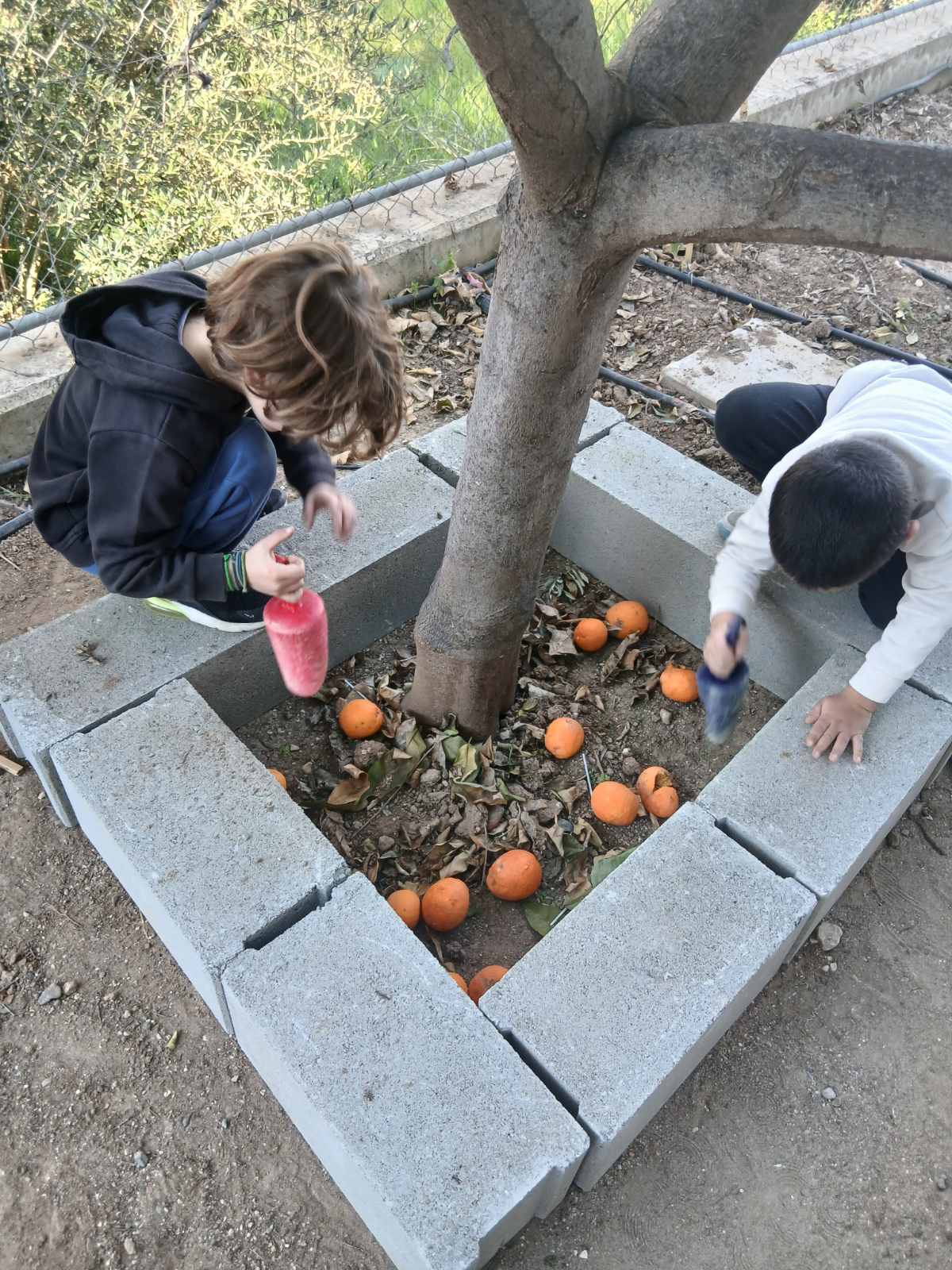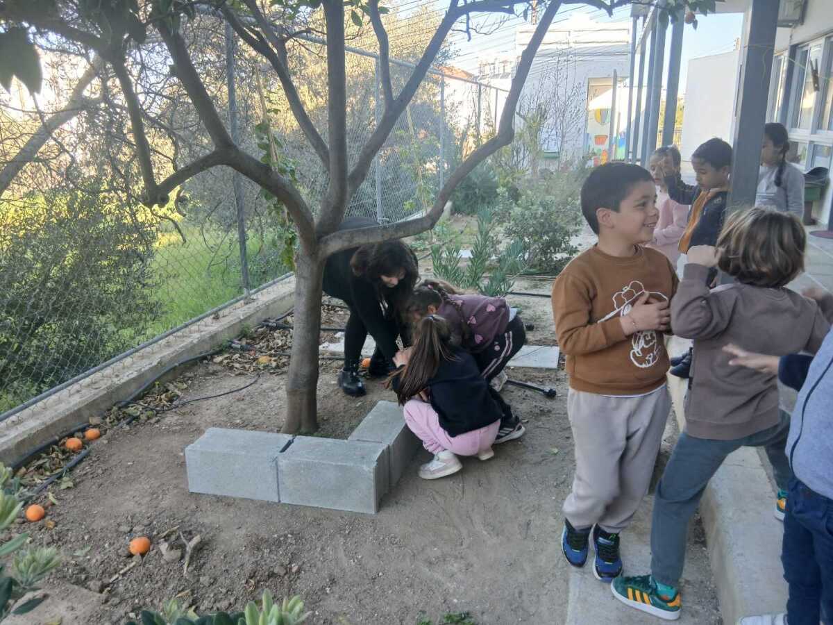 Δημιουργήσαμε λασάνι για την πορτοκαλιά μας! Φέραμε τσιμεντένια τούβλα και φτιάξαμε λασάνι γύρω από την πορτοκαλιά μας για να φυτέψουμε μέσα φυτά και να μπορούμε να καθόμαστε γύρω από το δέντρο μας!