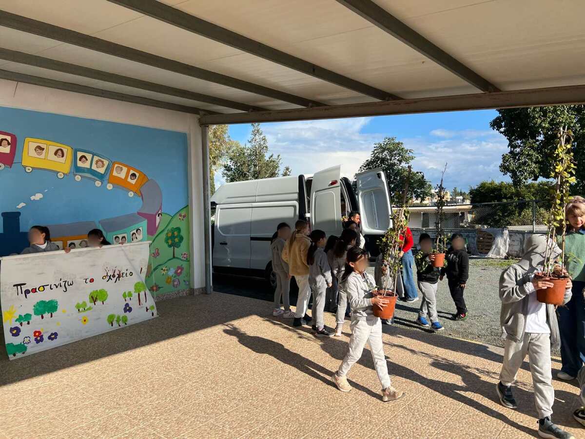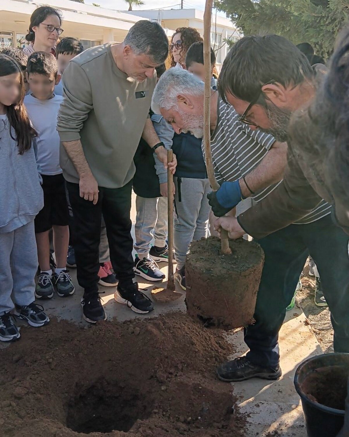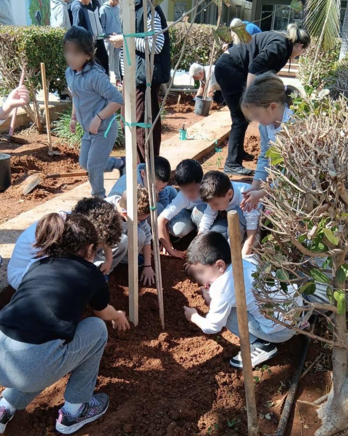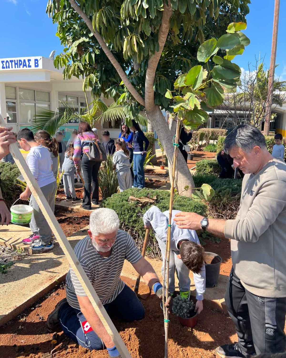 Επιτέλους έφτασε η μέρα που όλοι περίμεναν με αγωνία. Τα παιδιά της Β΄ τάξης υποδέχονται τους καινούργιους φίλους του σχολείου με το πανό που έφτιαξαν. Ακολουθεί η φύτευση. Ο κύριος Αναστάσης, ο κηπουρός μας, δείχνει στα παιδιά πώς φυτεύουμε ένα δένδρο. Ακολουθούν οδηγίες και όλοι μικροί και μεγάλοι σκάβουν, φυτεύουν με πολύ μεράκι. Όλοι βάζουν το λιθαράκι τους για ένα πράσινο σχολείο.