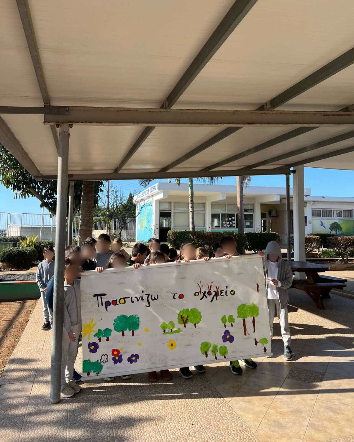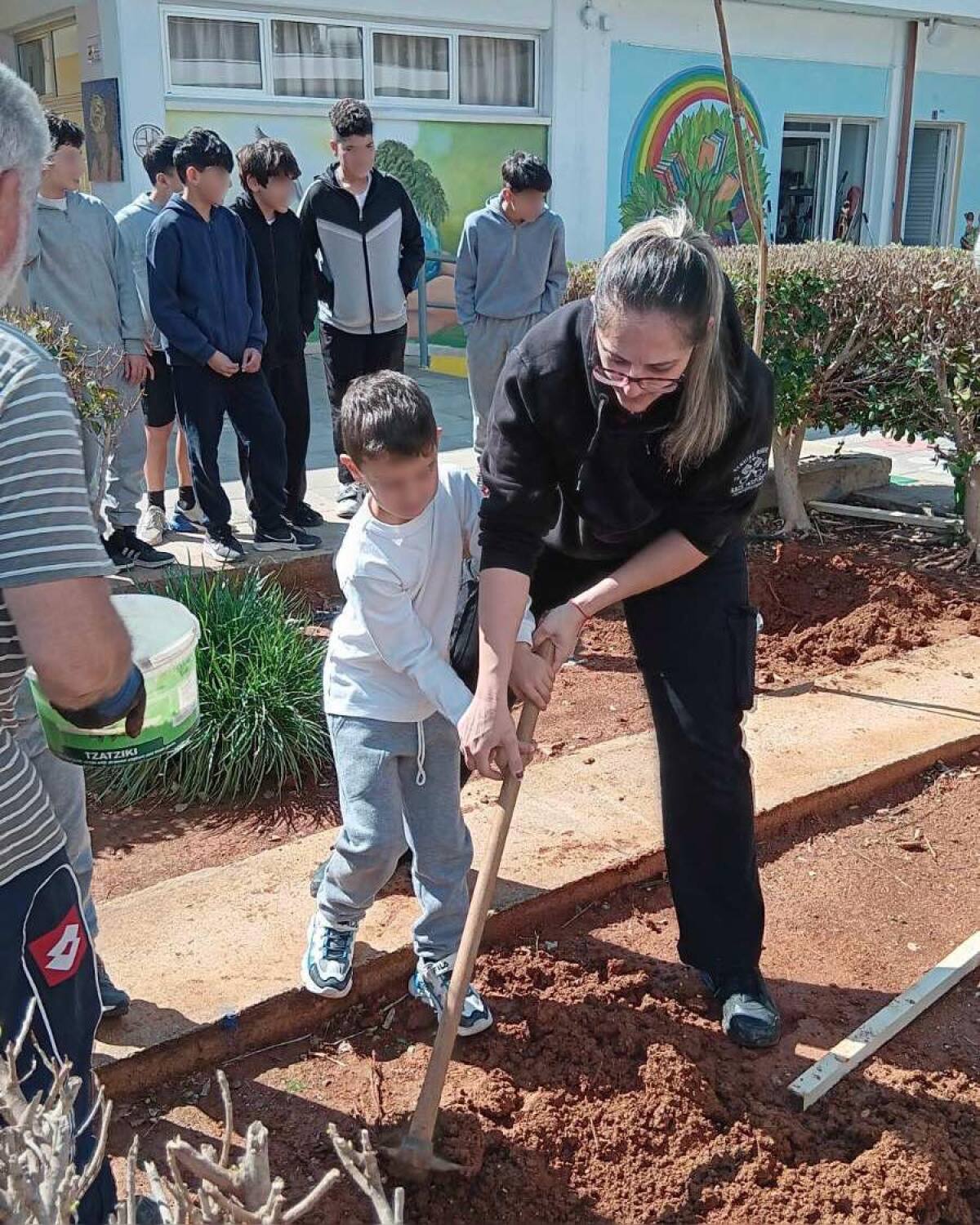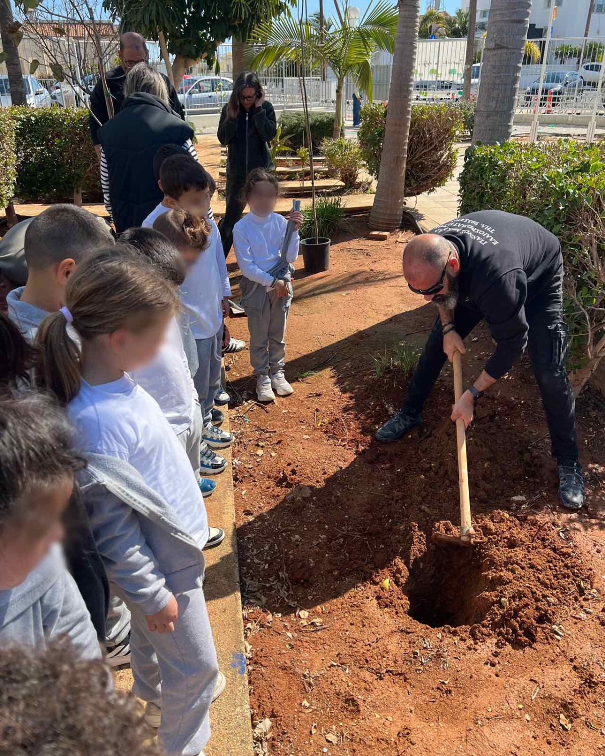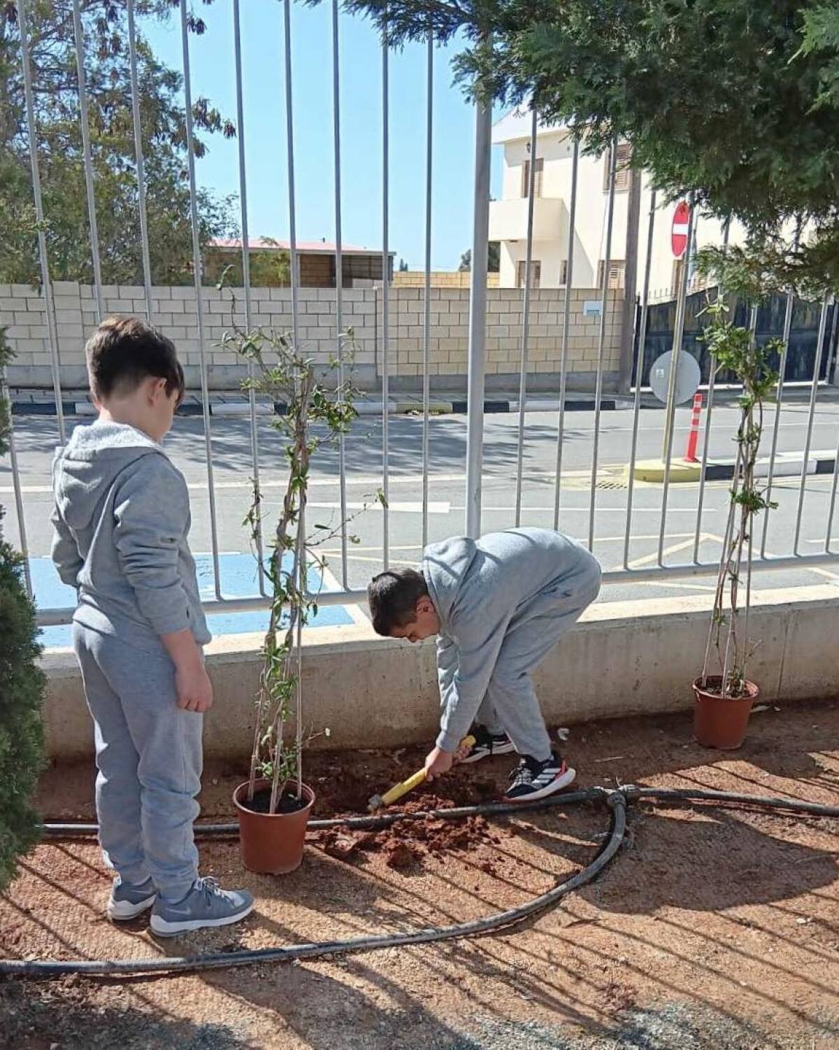 Επιτέλους έφτασε η μέρα που όλοι περίμεναν με αγωνία. Τα παιδιά της Β΄ τάξης υποδέχονται τους καινούργιους φίλους του σχολείου με το πανό που έφτιαξαν. Ακολουθεί η φύτευση. Ο κύριος Αναστάσης, ο κηπουρός μας, δείχνει στα παιδιά πώς φυτεύουμε ένα δένδρο. Ακολουθούν οδηγίες και όλοι μικροί και μεγάλοι σκάβουν, φυτεύουν με πολύ μεράκι. Όλοι βάζουν το λιθαράκι τους για ένα πράσινο σχολείο.