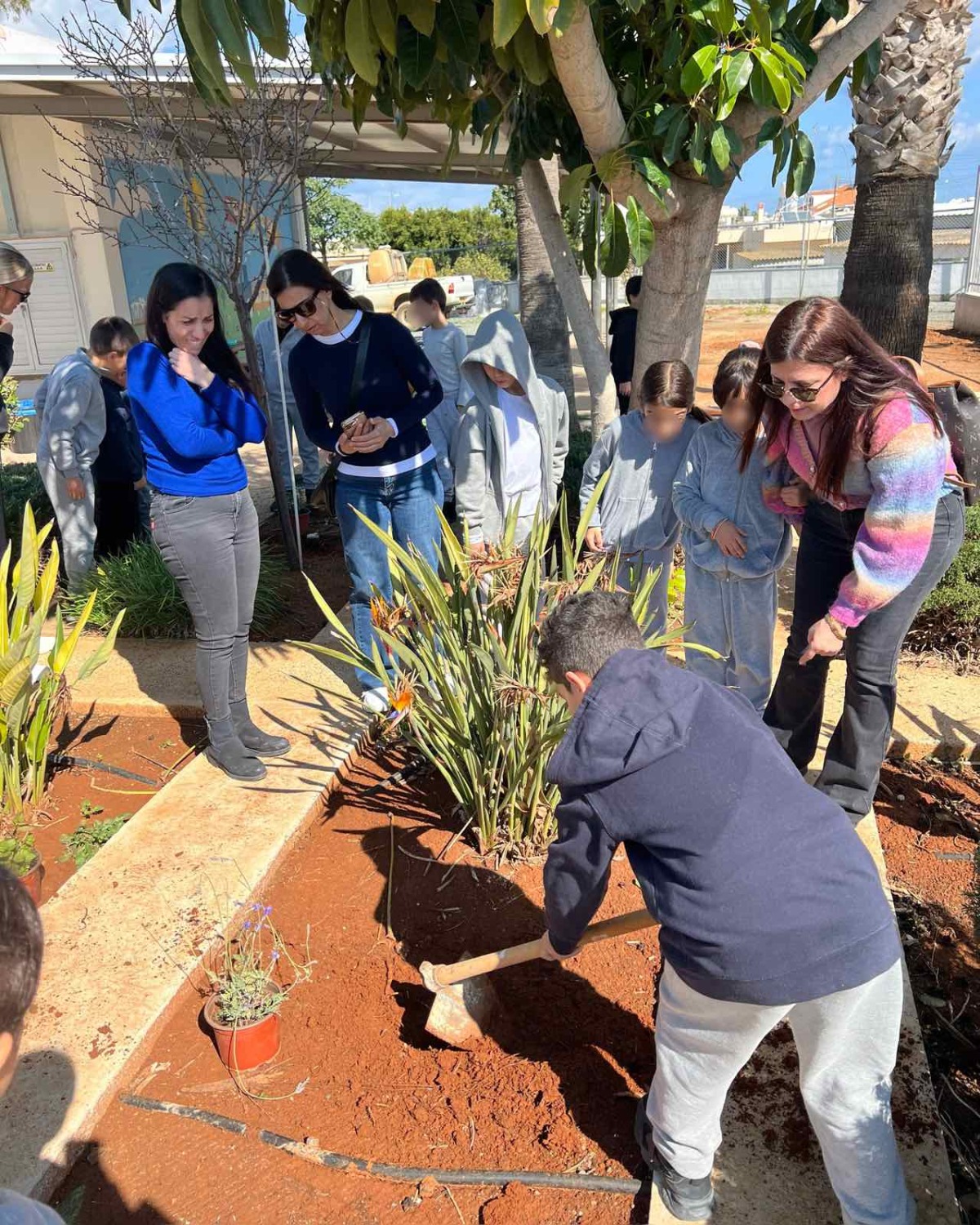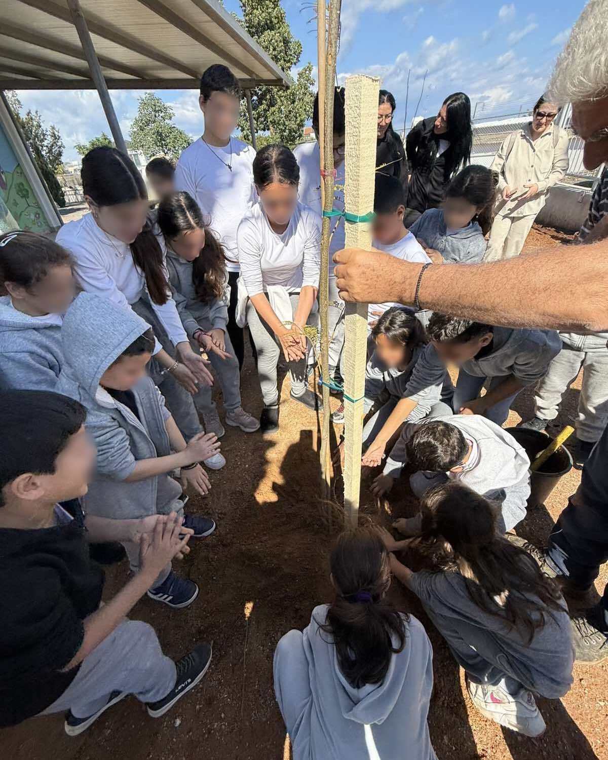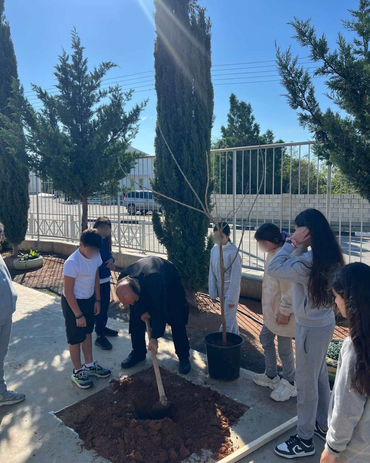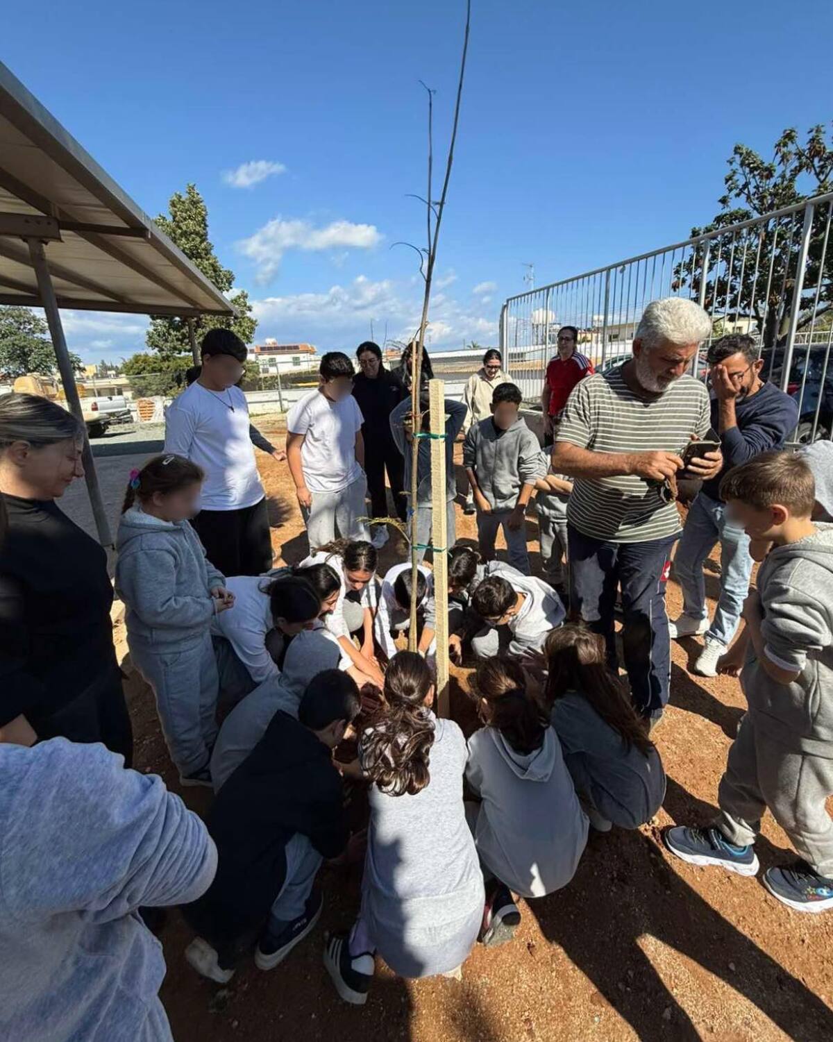 Επιτέλους έφτασε η μέρα που όλοι περίμεναν με αγωνία. Τα παιδιά της Β΄ τάξης υποδέχονται τους καινούργιους φίλους του σχολείου με το πανό που έφτιαξαν. Ακολουθεί η φύτευση. Ο κύριος Αναστάσης, ο κηπουρός μας, δείχνει στα παιδιά πώς φυτεύουμε ένα δένδρο. Ακολουθούν οδηγίες και όλοι μικροί και μεγάλοι σκάβουν, φυτεύουν με πολύ μεράκι. Όλοι βάζουν το λιθαράκι τους για ένα πράσινο σχολείο.