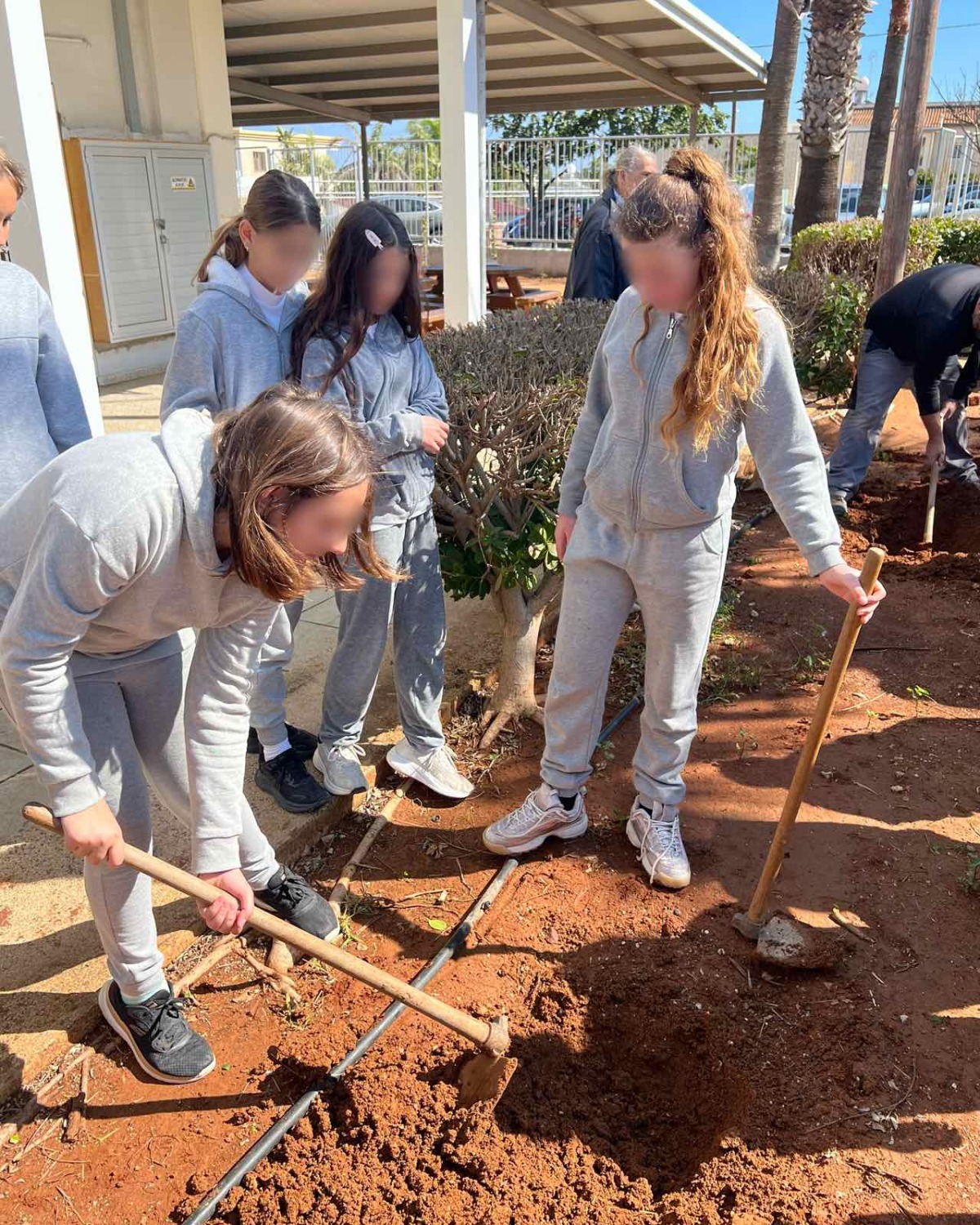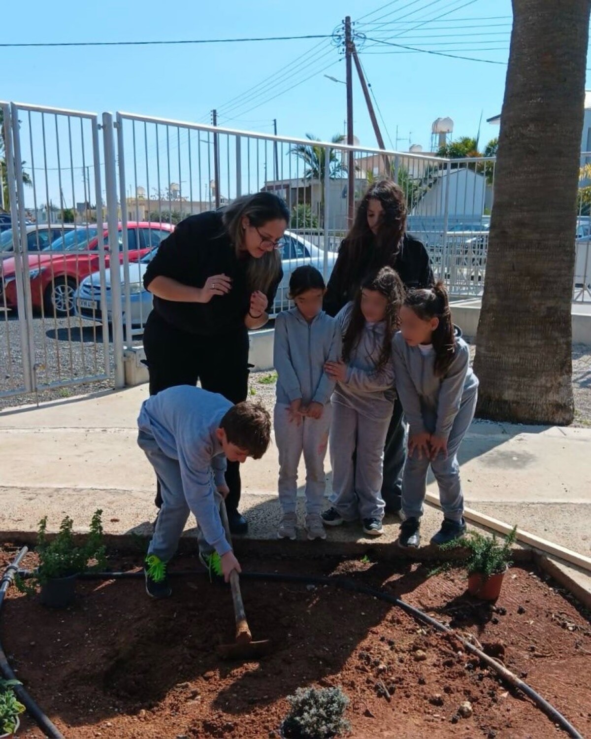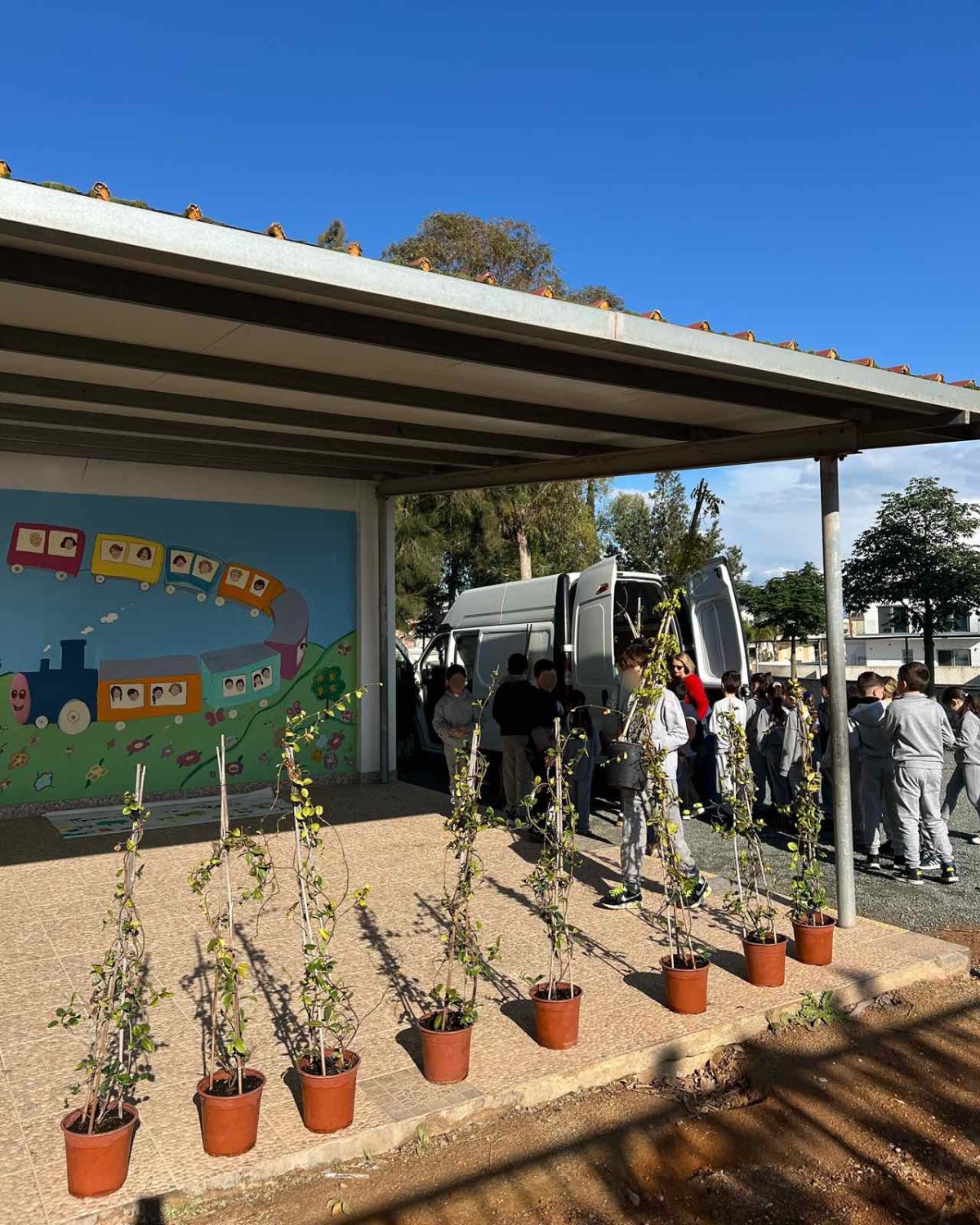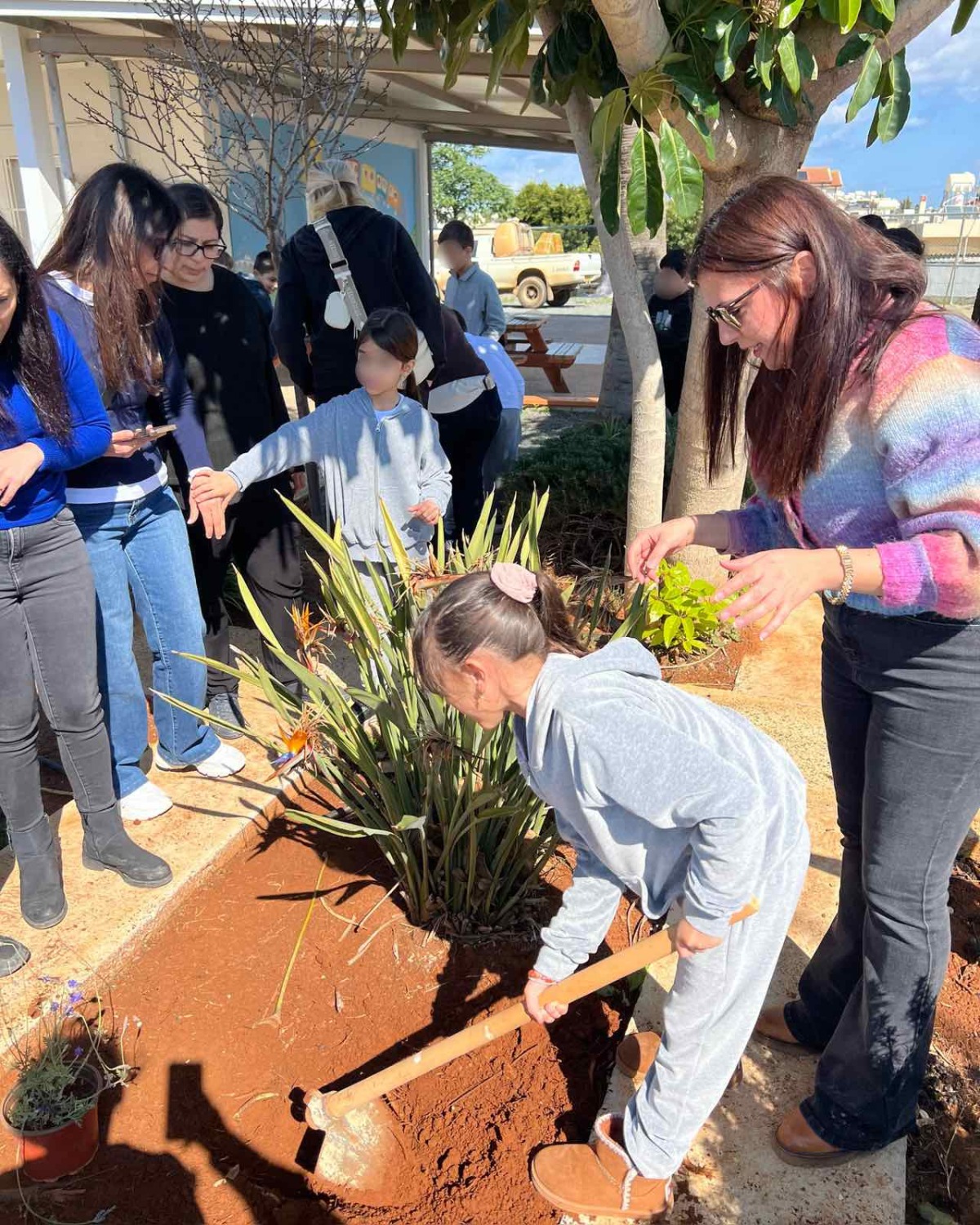 Επιτέλους έφτασε η μέρα που όλοι περίμεναν με αγωνία. Τα παιδιά της Β΄ τάξης υποδέχονται τους καινούργιους φίλους του σχολείου με το πανό που έφτιαξαν. Ακολουθεί η φύτευση. Ο κύριος Αναστάσης, ο κηπουρός μας, δείχνει στα παιδιά πώς φυτεύουμε ένα δένδρο. Ακολουθούν οδηγίες και όλοι μικροί και μεγάλοι σκάβουν, φυτεύουν με πολύ μεράκι. Όλοι βάζουν το λιθαράκι τους για ένα πράσινο σχολείο.