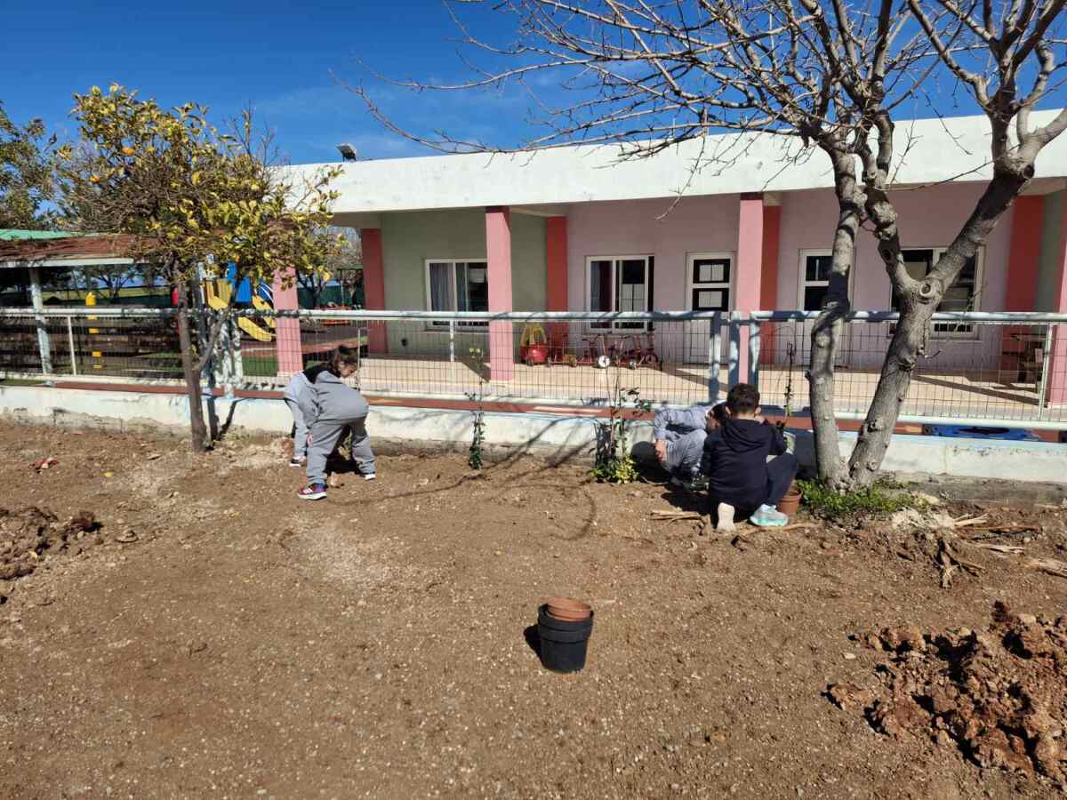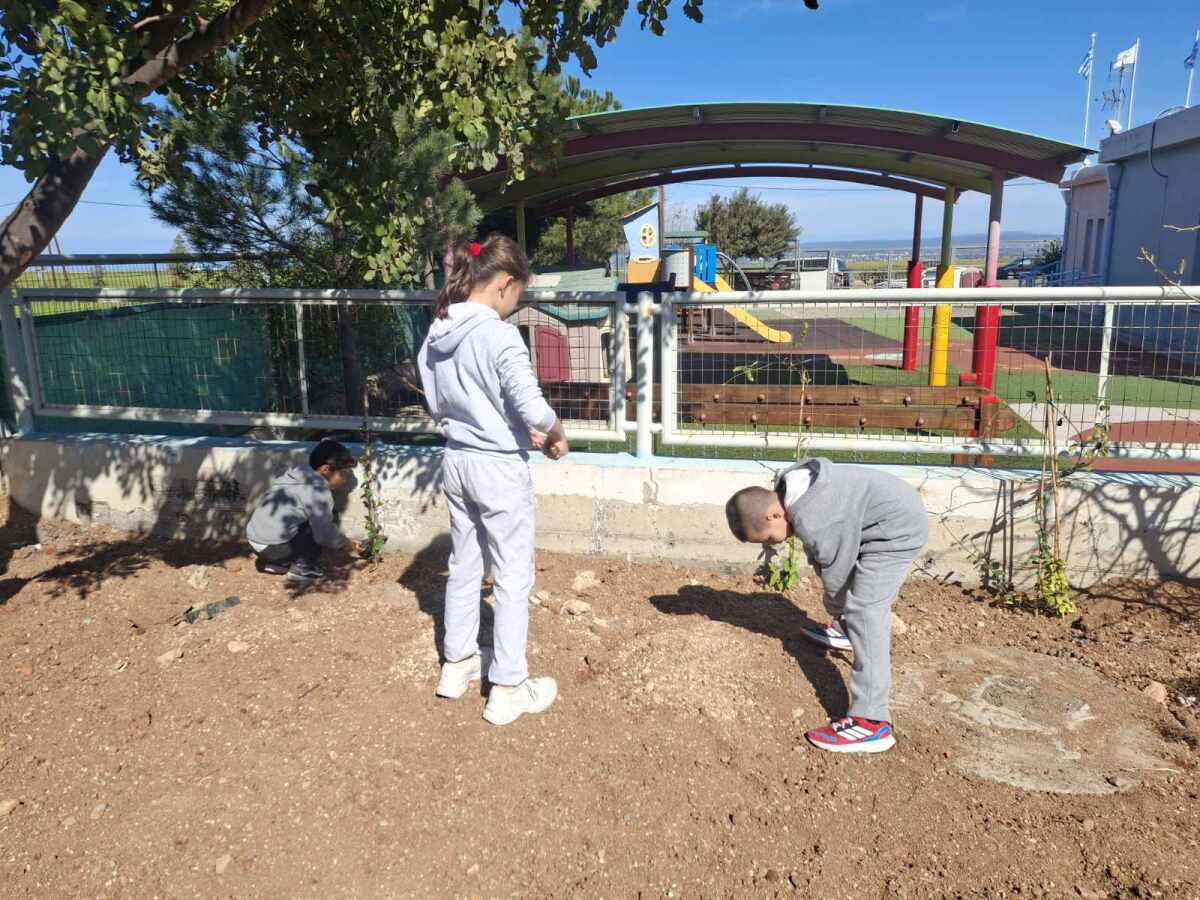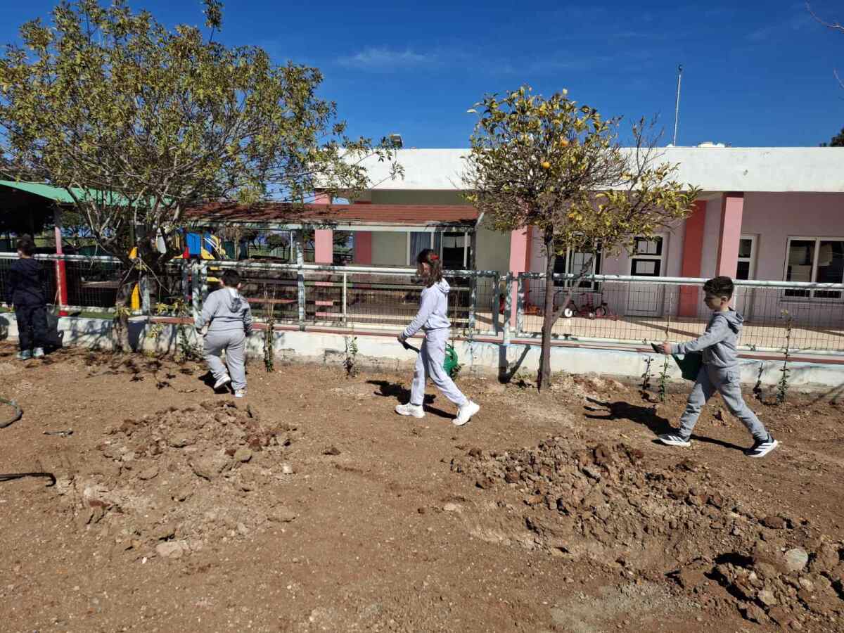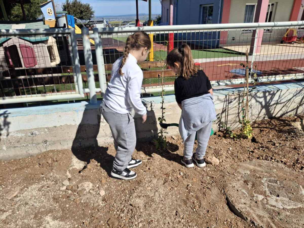 Ακολούθως, χρησιμοποιώντας παιδικά φτυαράκια, γέμισαν τους λάκκους με χώμα και ολοκλήρωσαν τη διαδικασία φύτευσης με νέο πότισμα των φυτών. Η δραστηριότητα αυτή αποτέλεσε μια βιωματική εμπειρία για τα παιδιά, ενισχύοντας τη συμμετοχή τους στη δημιουργία και φροντίδα του νέου χώρου πρασίνου του σχολείου.