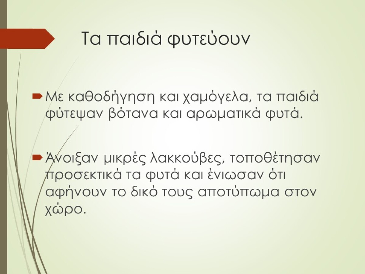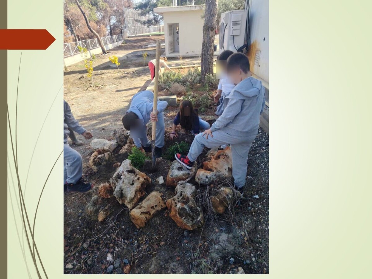 Τα παιδιά εργάστηκαν σε μικρές ομάδες, μαθαίνοντας να συνεργάζονται και να μοιράζονται ευθύνες. Με προσοχή άνοιξαν τις θέσεις φύτευσης, τοποθέτησαν τα φυτά στο χώμα και φρόντισαν να τα σταθεροποιήσουν σωστά. Έμαθαν ότι η φύτευση δεν είναι απλώς μια πράξη, αλλά μια διαδικασία που απαιτεί υπομονή, φροντίδα και κατανόηση των αναγκών κάθε φυτού.