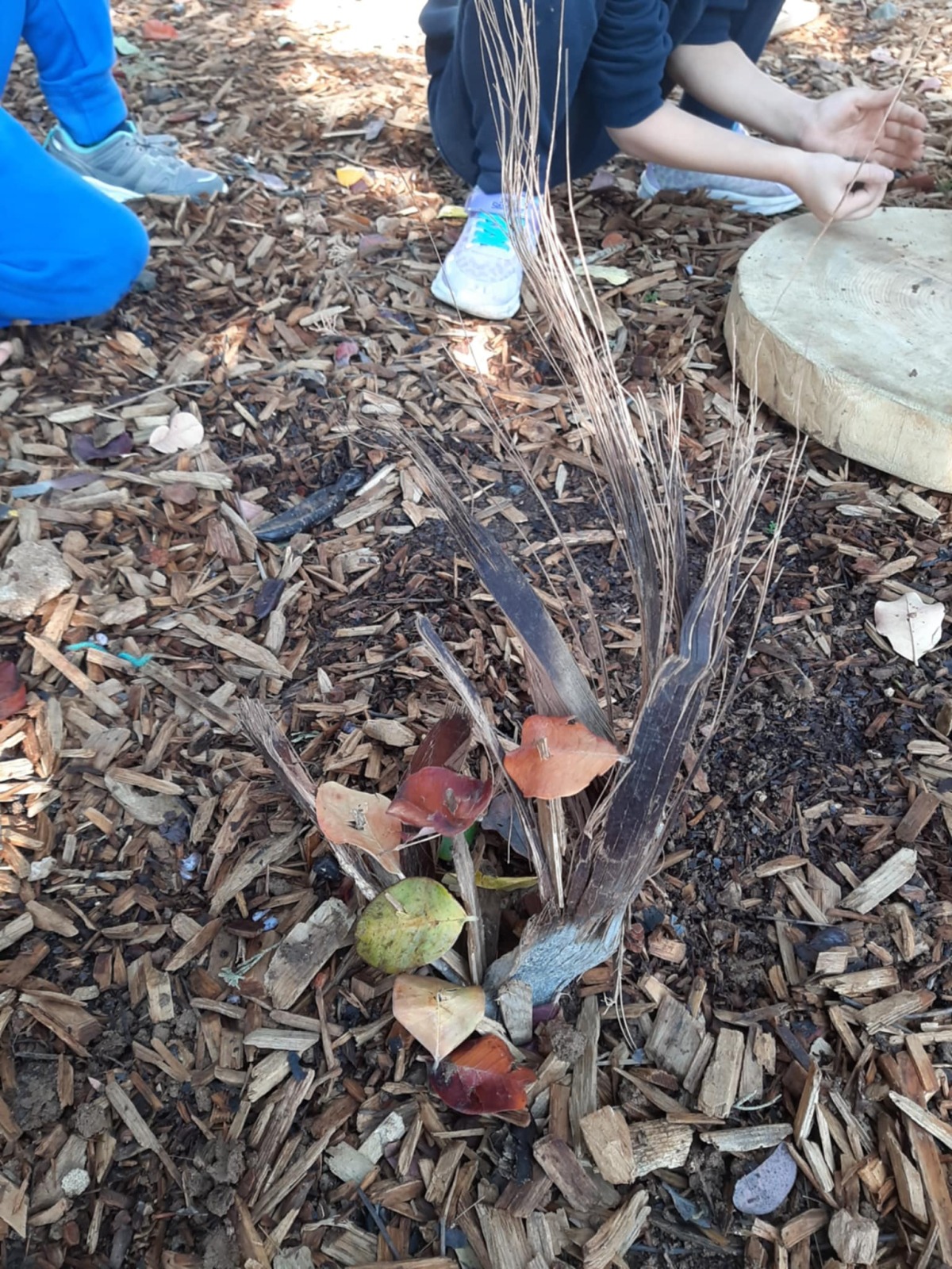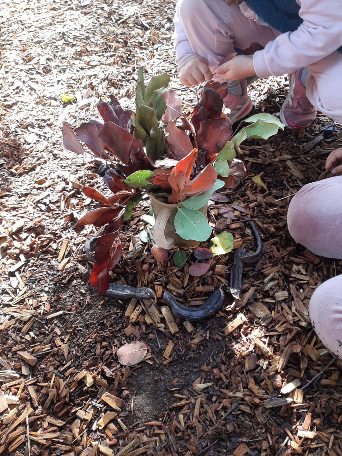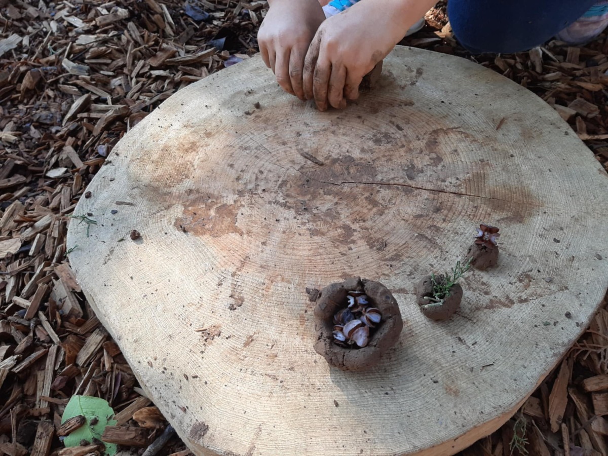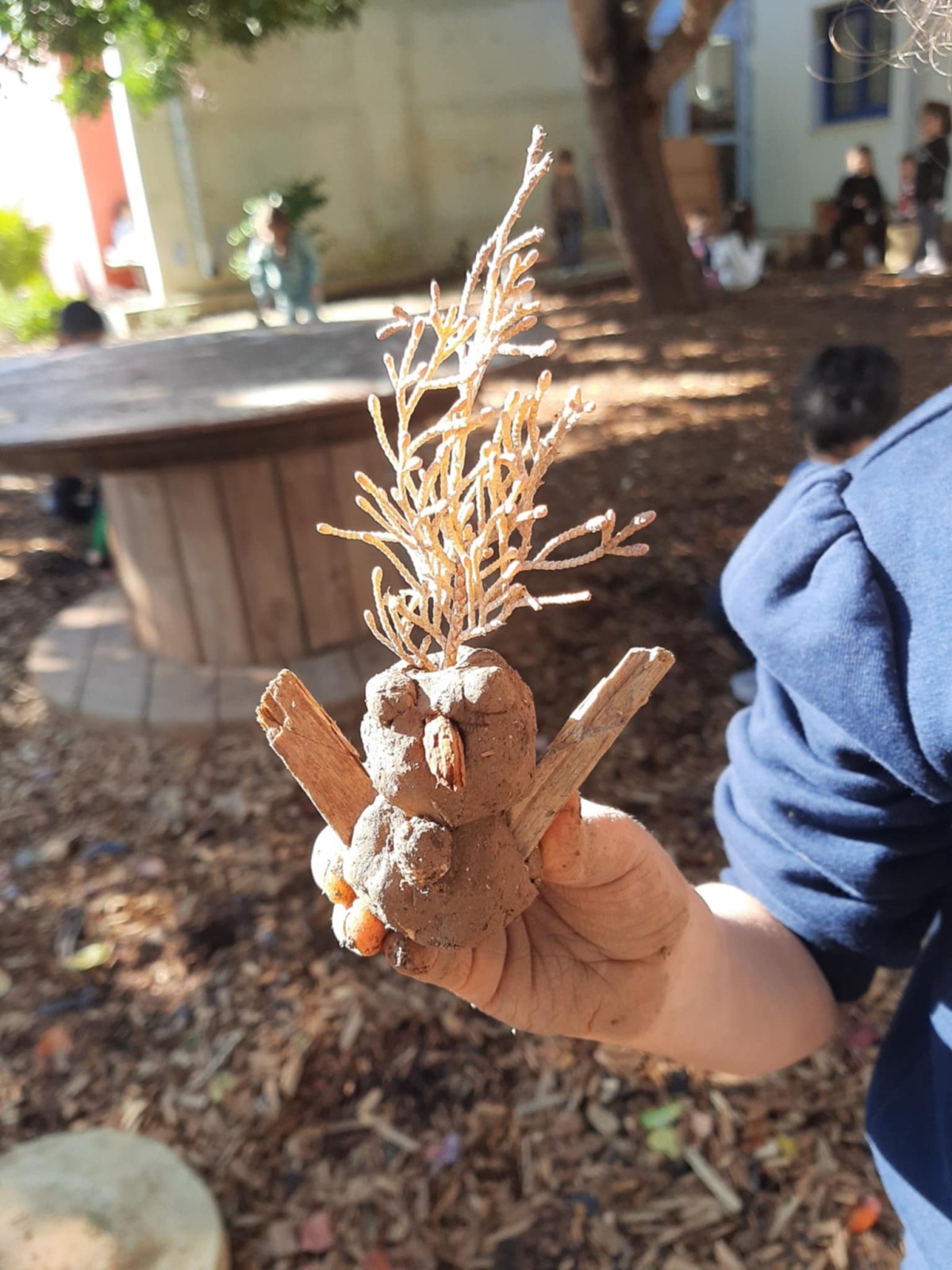 Εικαστικές δημιουργίες με φύλλα, πηλό, σποράκια, κλαδάκια και πέτρες από τον χώρο πρασίνου. Έφτιαξαν μαγικά δέντρα, ανθρωπάκια, εξωγήινους, βάρκα, κάστρα με γέφυρες, θάλασσα και βάρκες, καλαθάκια.