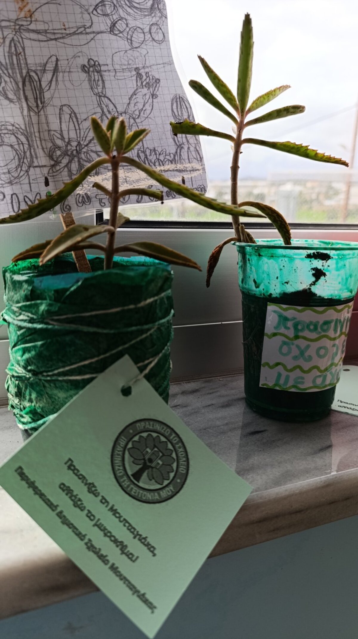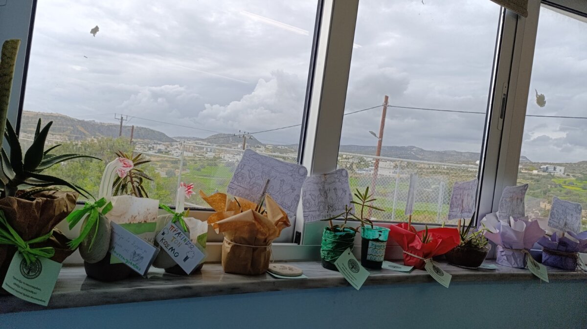 Η Περιβαλλοντική ομάδα του σχολείου μας δημιούργησε και χάρισε μικρά γλαστράκια στους προέδρους των τάξεων και σε άτομα που εργάζονται στο σχολείο (όπως τις επιστάτριες). Ετοιμάστηκαν επίσης και άλλα γλαστράκια για τους επισκέπτες του σχολείου όπως τον Χωρεπίσκοπο Αμαθούντας, τον αντιδήμαρχο Αμαθούντας και τον πρόεδρο του Συνδέσμου Γονέων. Τα γλαστράκια είχαν παχύφυτα που ρίζωσαν από κομμάτια που προμηθευτήκαμε από κήπο εκπαιδευτικού. Πολλά από τα γλαστράκια ήταν συσκευασίες που επαναχρησιμοποιήθηκαν.