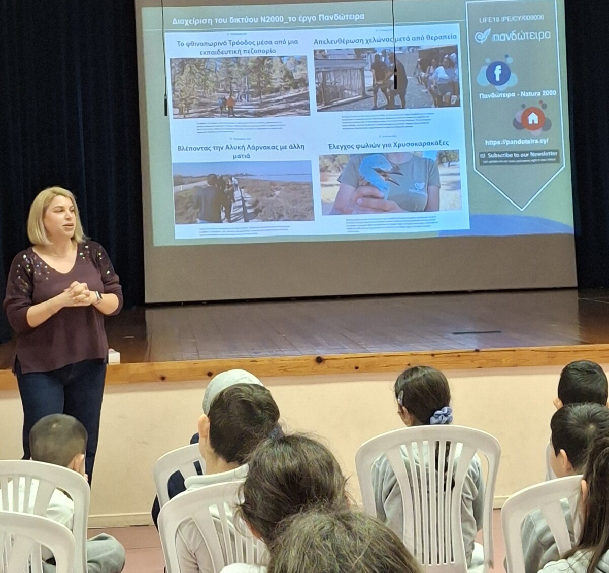 Με έναν μοναδικό και βιωματικό τρόπο, η κ. Κουζάλη «ταξίδεψε» τους μαθητές μας στις προστατευόμενες περιοχές του Δίκτυο Natura 2000 στην Κύπρο, παρουσιάζοντάς τους τη σπάνια και πολύτιμη χλωρίδα και πανίδα τους μέσα από πλούσιο φωτογραφικό υλικό και προσωπικές εμπειρίες από τη συμμετοχή της στο ερευνητικό έργο Πανδώτειρα.