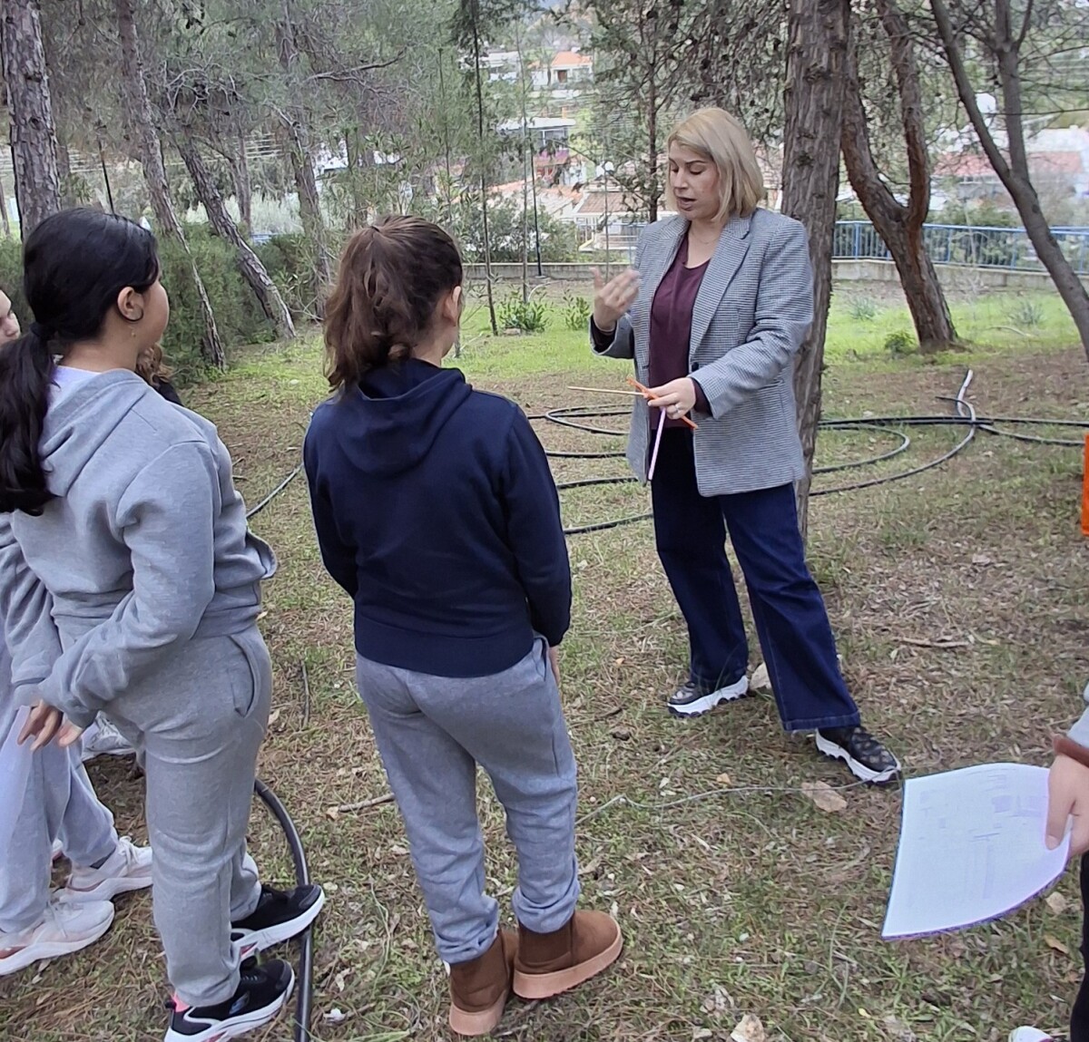 Ακολούθησε μελέτη πεδίου στον υπό αναδιαμόρφωση πράσινο χώρο του σχολείου μας. Εκεί, τα παιδιά των τάξεων Ε΄ και ΣΤ΄ είχαν την ευκαιρία να εργαστούν σαν μικροί ερευνητές! Έμαθαν πώς υπολογίζουμε την ηλικία και το ύψος ενός δέντρου, τι είναι η στηθιαία περίμετρος, τι πληροφορίες μπορούμε να αντλήσουμε από τα κουκουνάρια, ποια όργανα χρησιμοποιούν οι επιστήμονες κατά τη μελέτη τους κ.α.