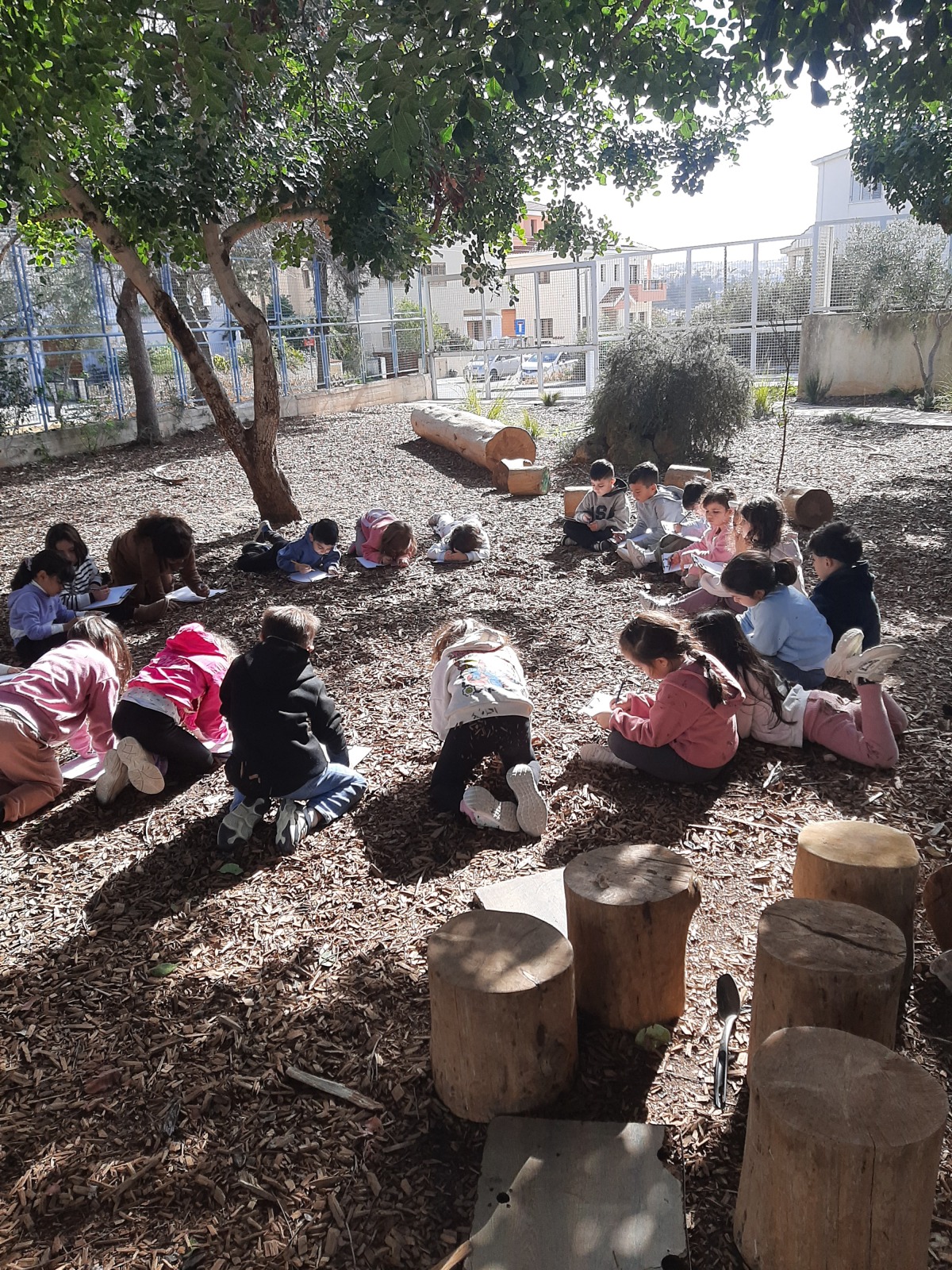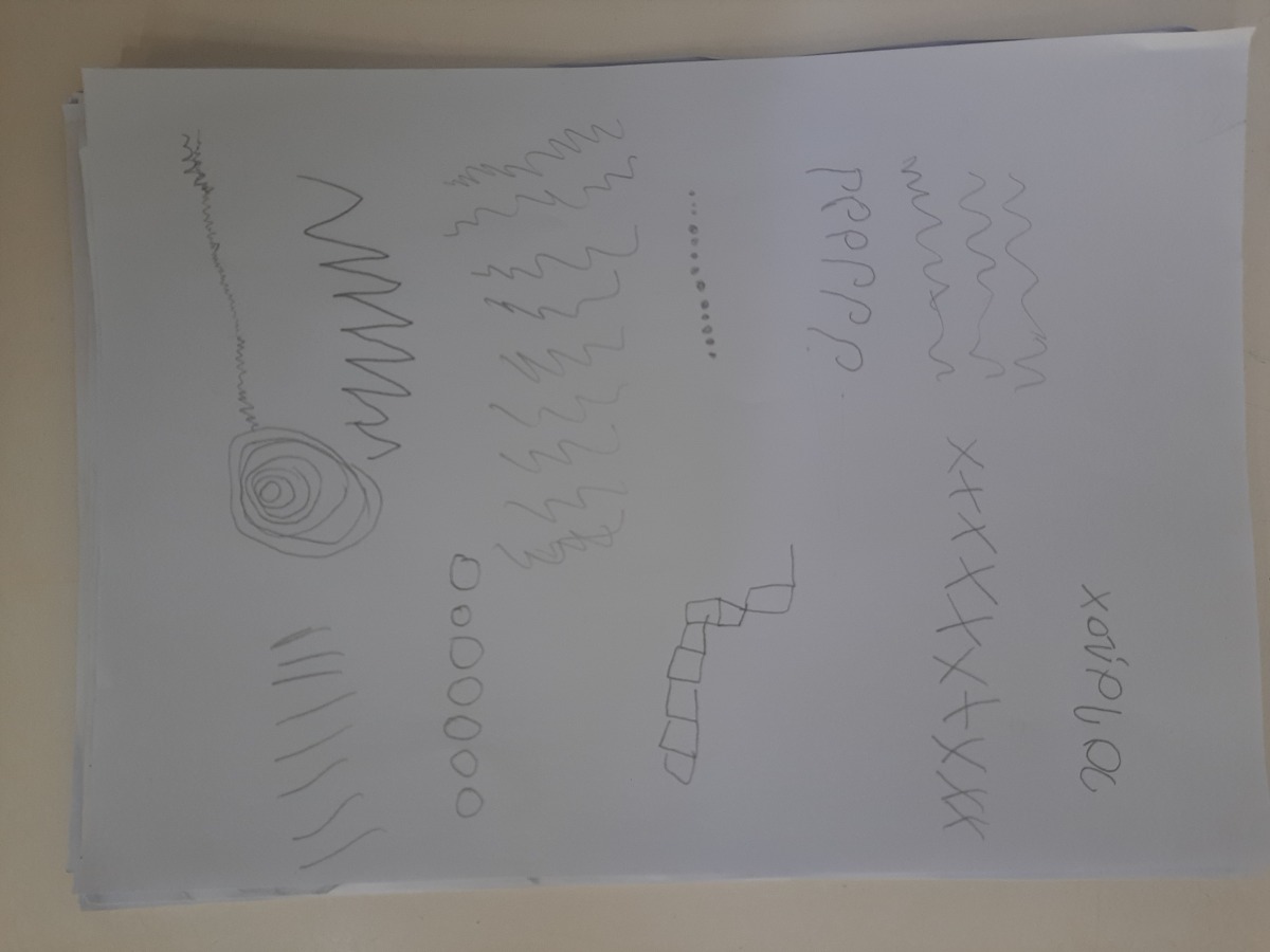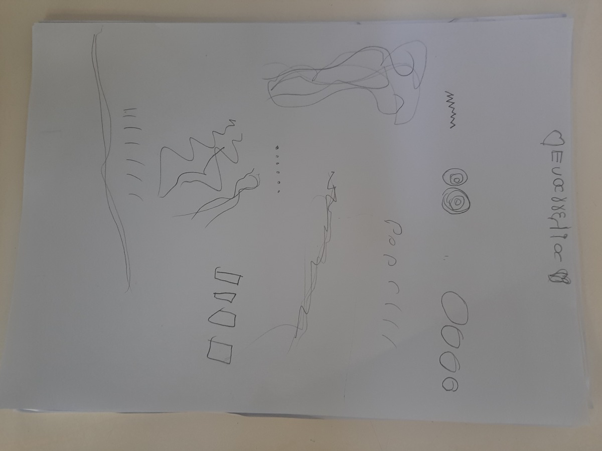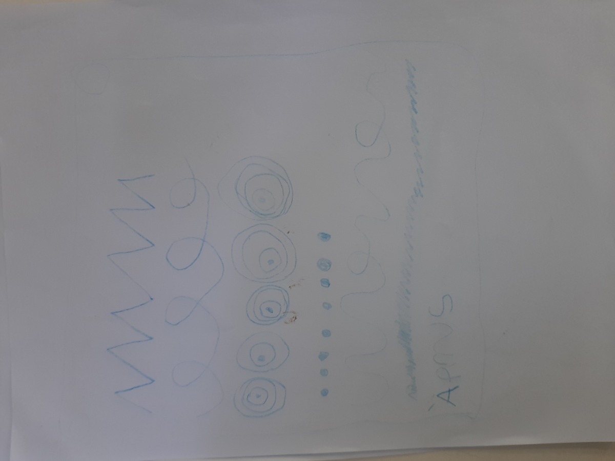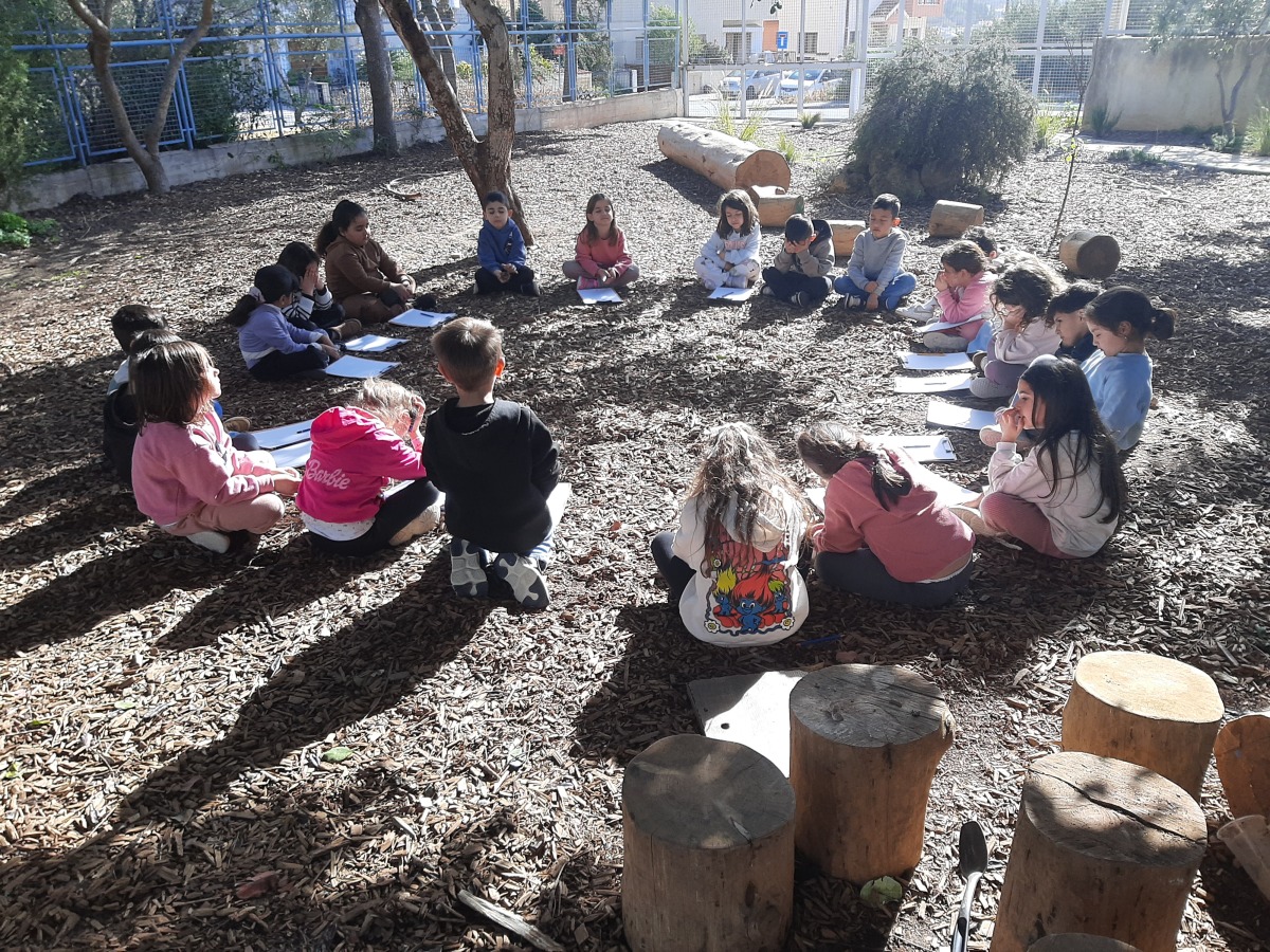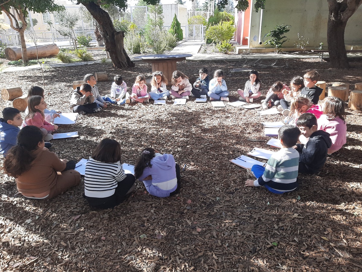Τα παιδιά κάθησαν στο χώρο φύσης και κλείνοντας τα μάτια προσπάθησαν να εντοπίσουν όλους τους ήχους που ακούγονταν στον χώρο φύσης. Άκουσαν τον άνεμο, θρόισμα των φύλλων, 2 διαφορετικούς ήχους πουλιών, πατημασιές, φωνές ανθρώπων, σκύλους, γάτα κ.ά. Στη συνέχεια ζωγράφισαν τους ήχους που άκουσαν.