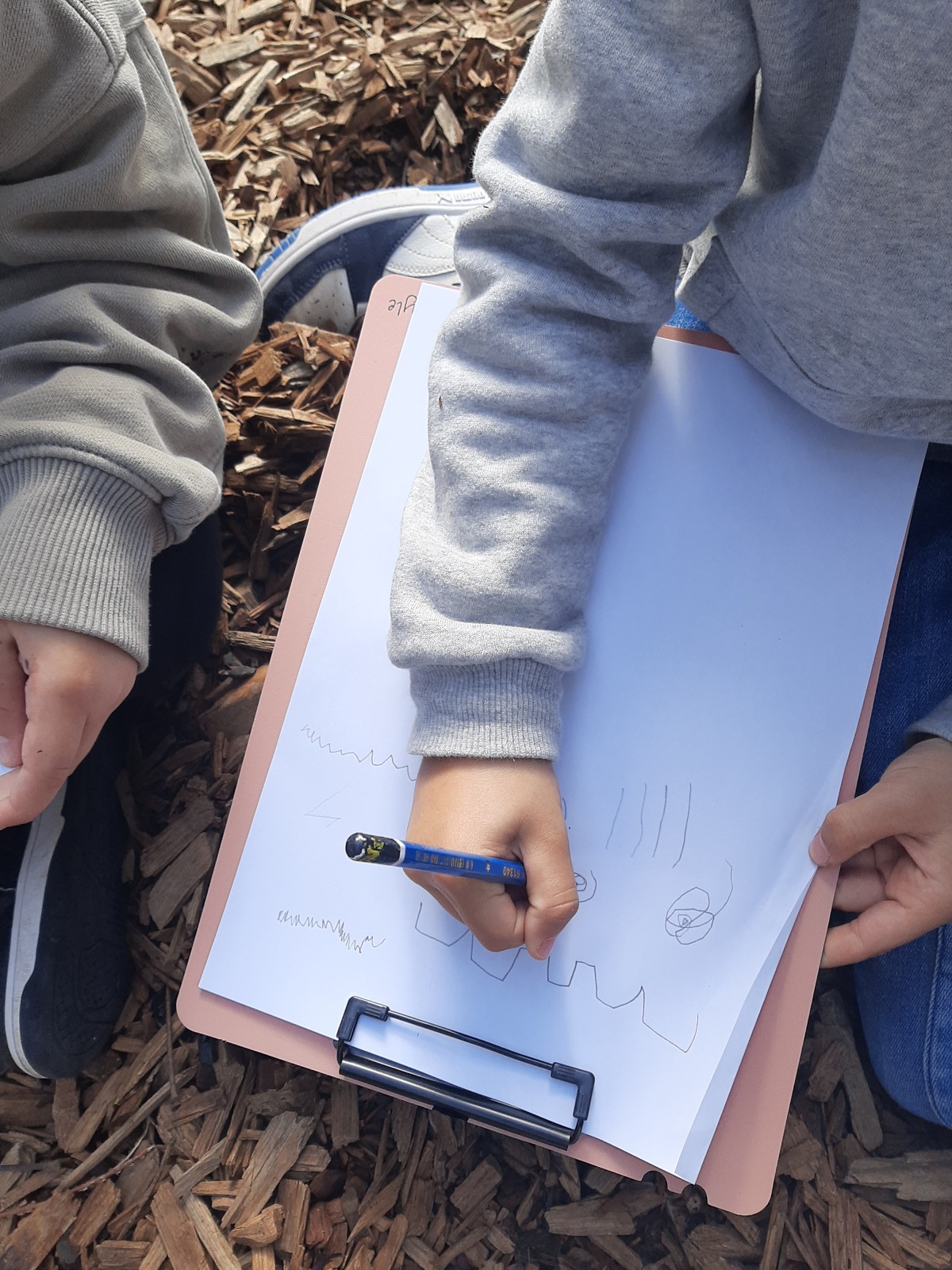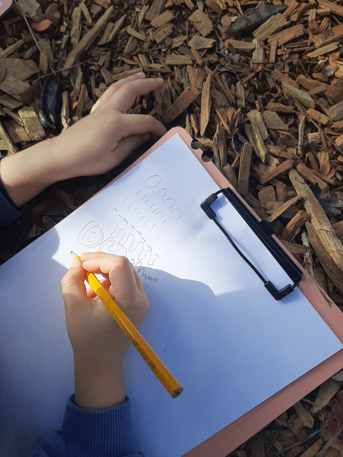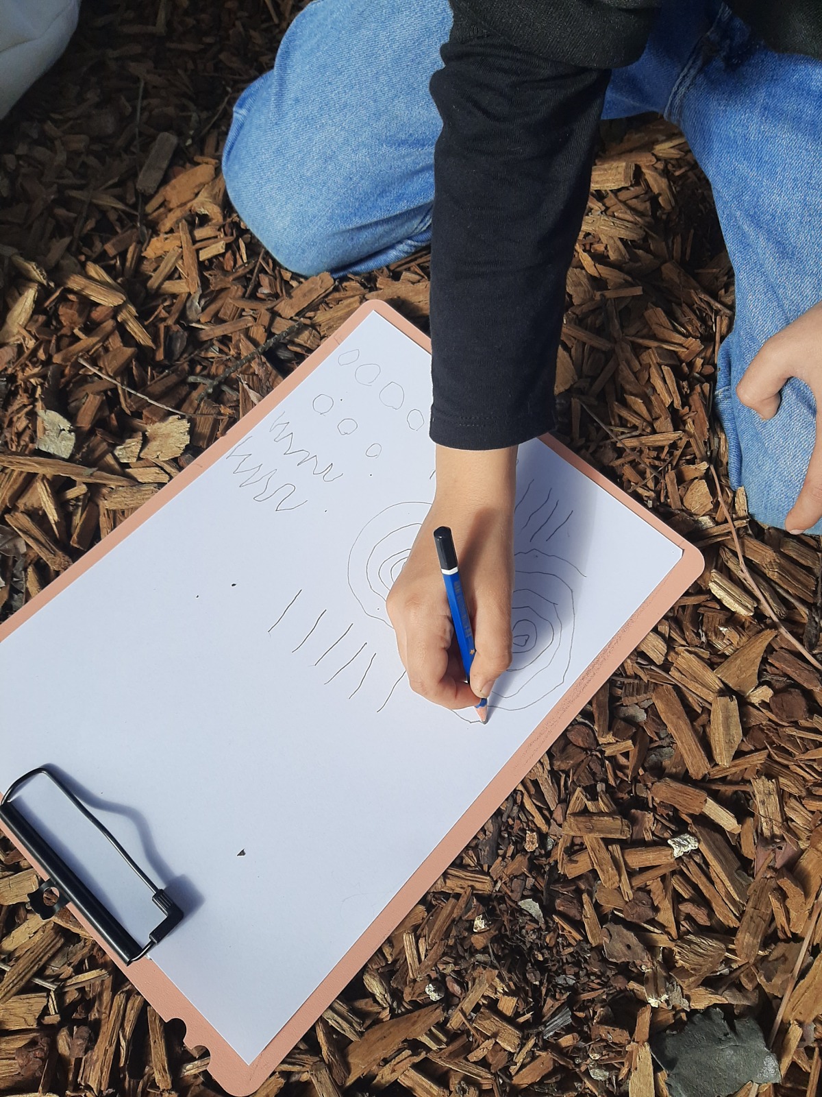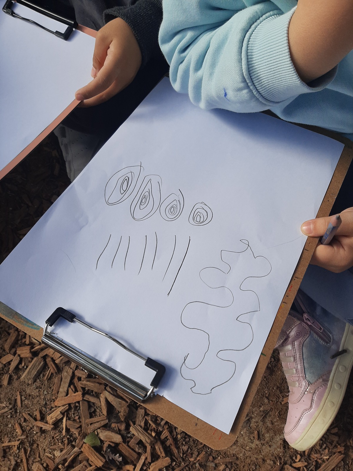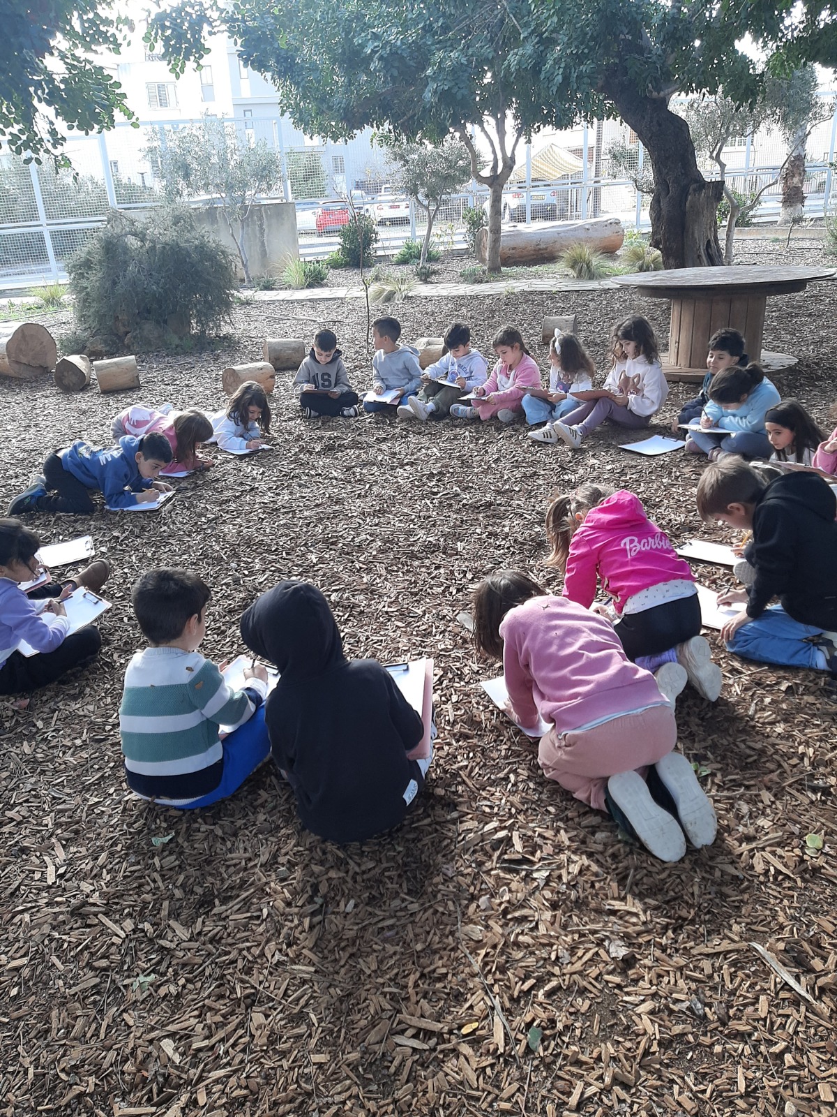 Τα παιδιά κάθησαν στο χώρο φύσης και κλείνοντας τα μάτια προσπάθησαν να εντοπίσουν όλους τους ήχους που ακούγονταν στον χώρο φύσης. Άκουσαν τον άνεμο, θρόισμα των φύλλων, 2 διαφορετικούς ήχους πουλιών, πατημασιές, φωνές ανθρώπων, σκύλους, γάτα κ.ά. Στη συνέχεια ζωγράφισαν τους ήχους που άκουσαν.
