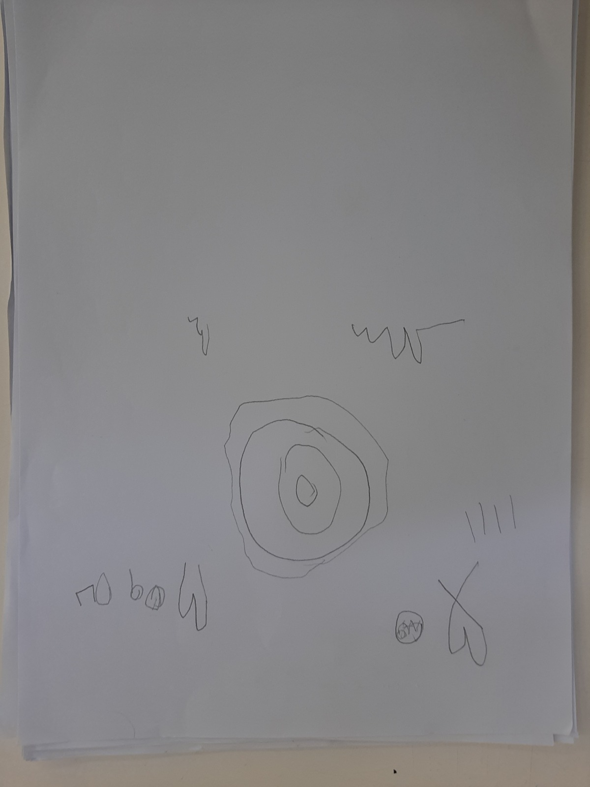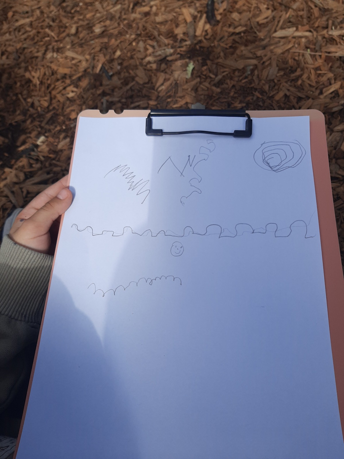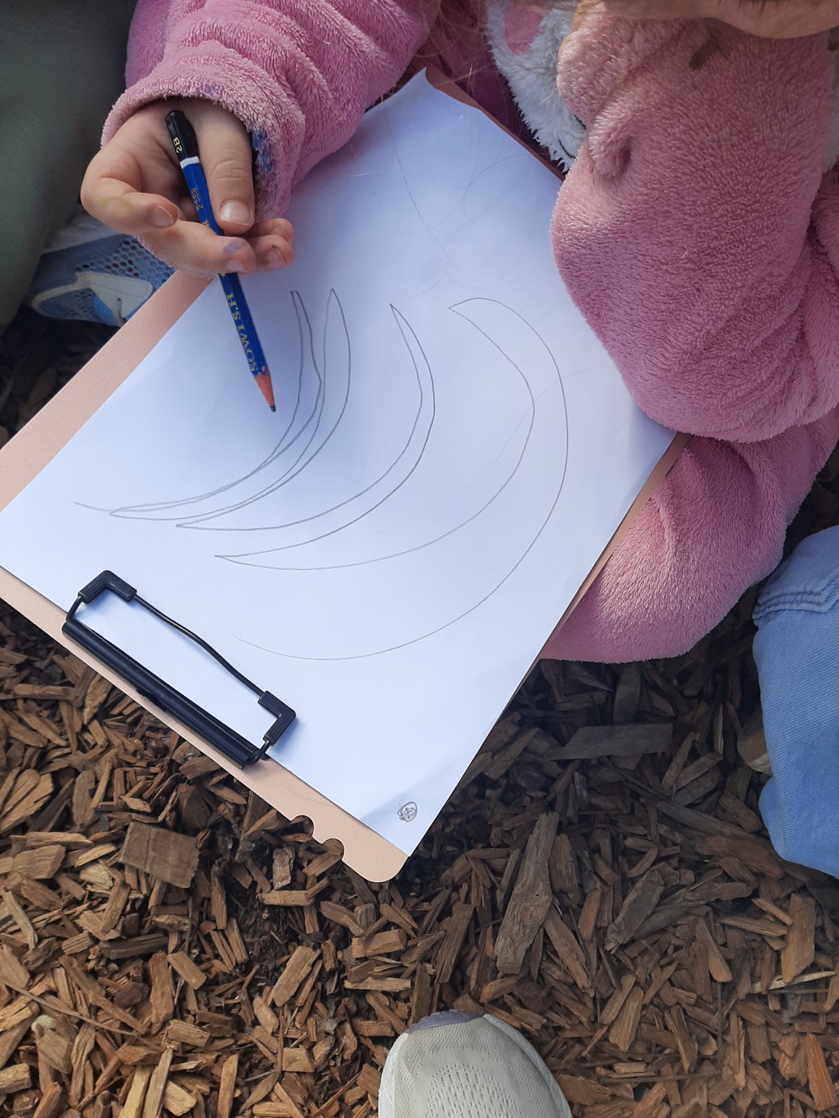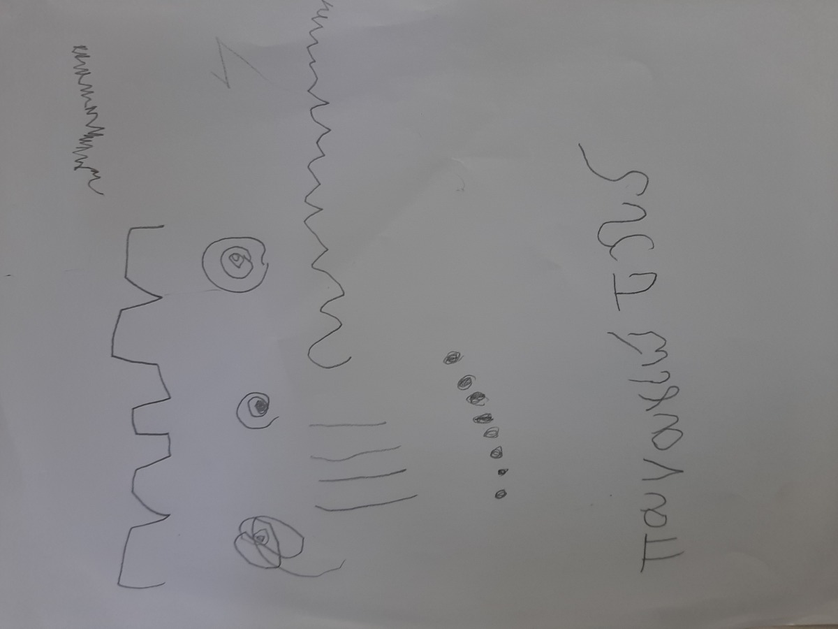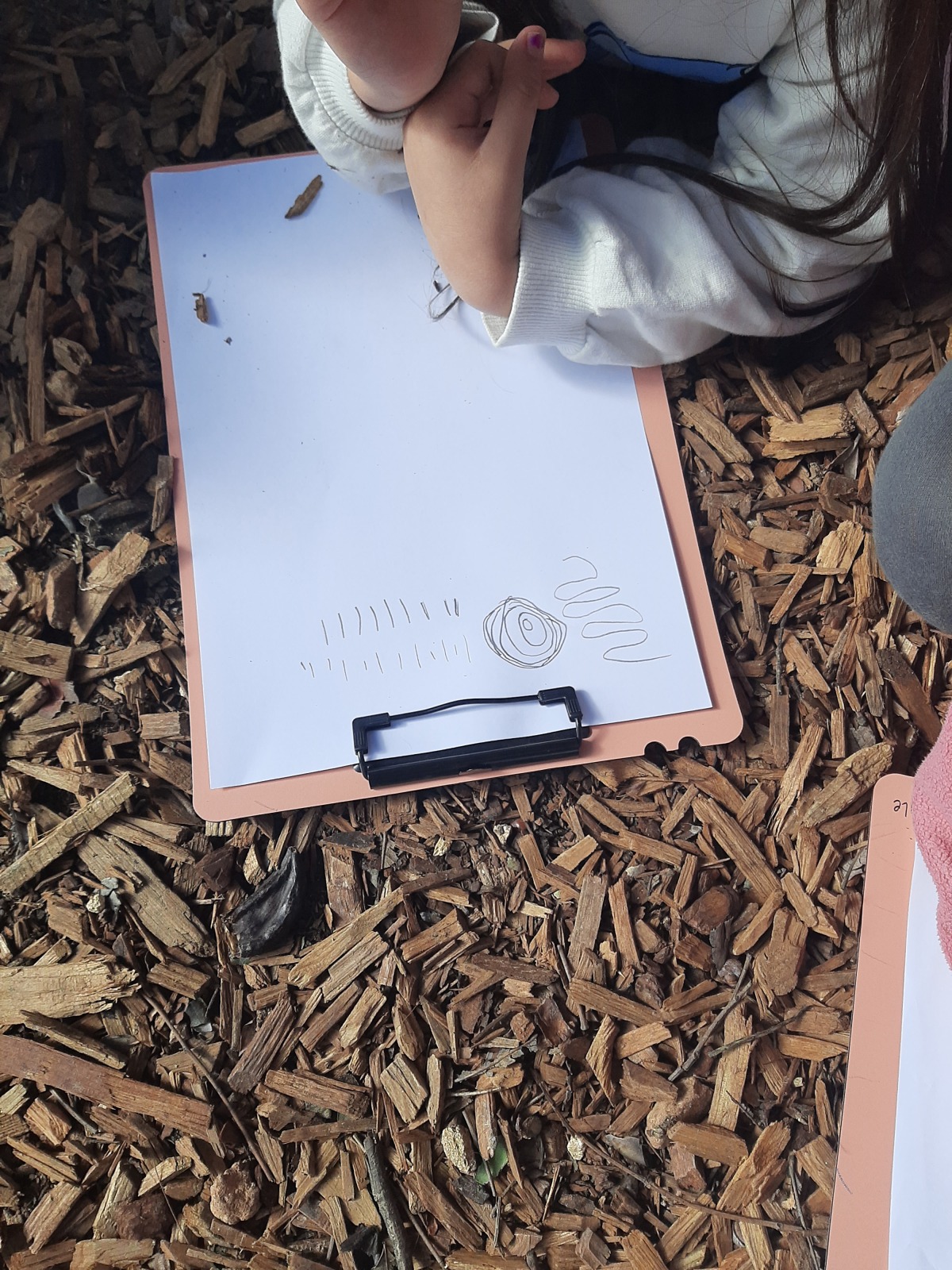 Τα παιδιά κάθησαν στο χώρο φύσης και κλείνοντας τα μάτια προσπάθησαν να εντοπίσουν όλους τους ήχους που ακούγονταν στον χώρο φύσης. Άκουσαν τον άνεμο, θρόισμα των φύλλων, 2 διαφορετικούς ήχους πουλιών, πατημασιές, φωνές ανθρώπων, σκύλους, γάτα κ.ά. Στη συνέχεια ζωγράφισαν τους ήχους που άκουσαν.