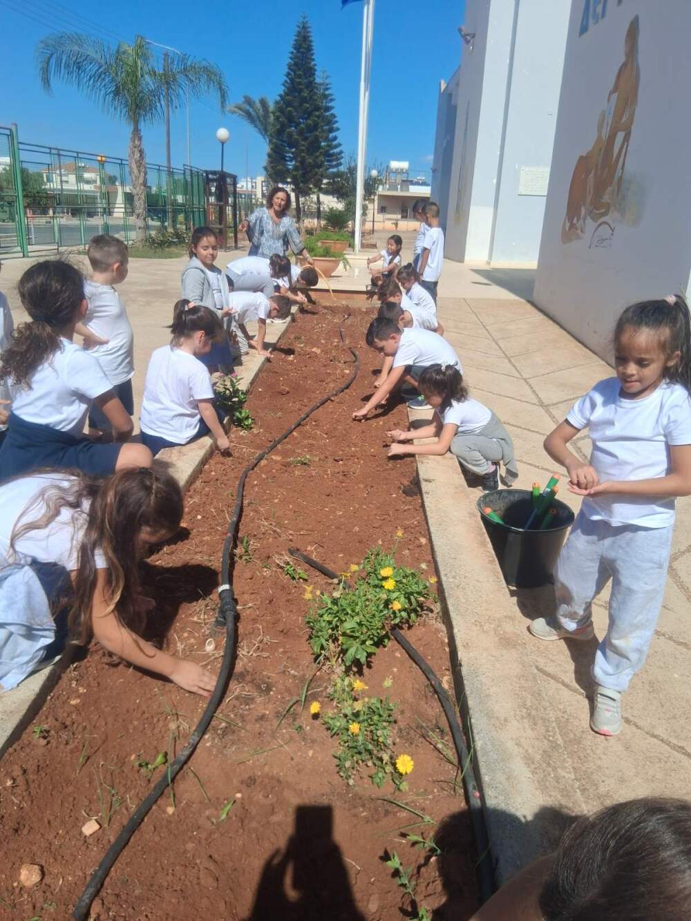 Τα παιδιά της Πρώτης και Δευτέρας τάξης ανέλαβαν να φυτέψουν σε αυτούς τους χώρους τριανταφυλλιές, δαφνάκια, βουκεμβίλιες, λουβανούδες (μοσχομπίζελα) δημιουργώντας μία πανδαισία χρωμάτων.