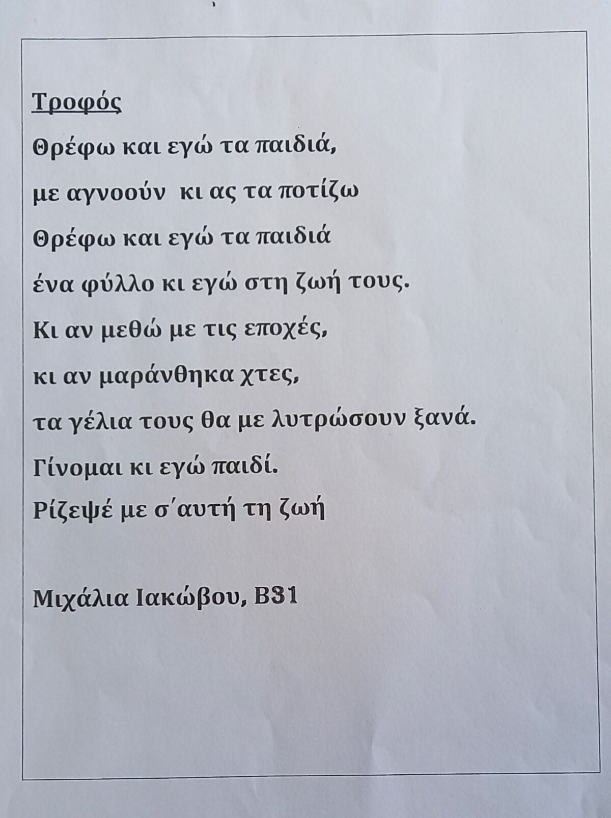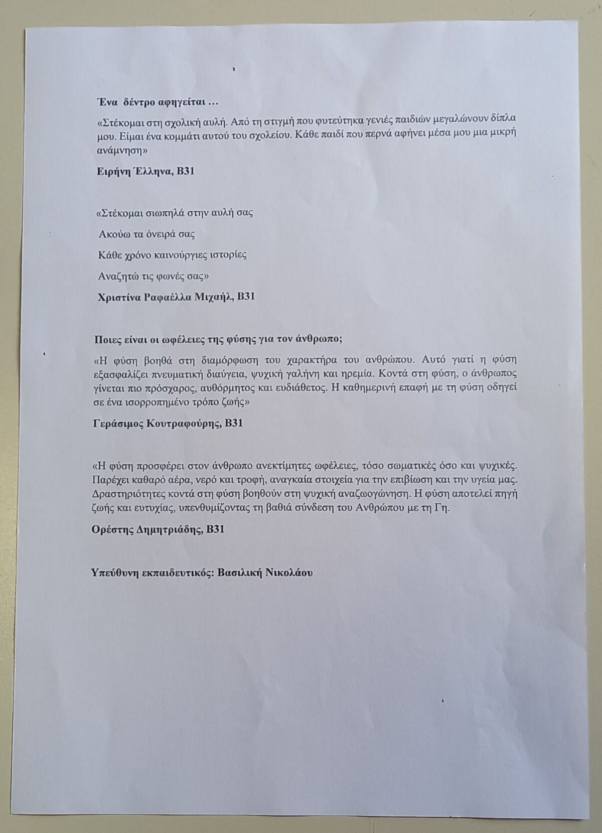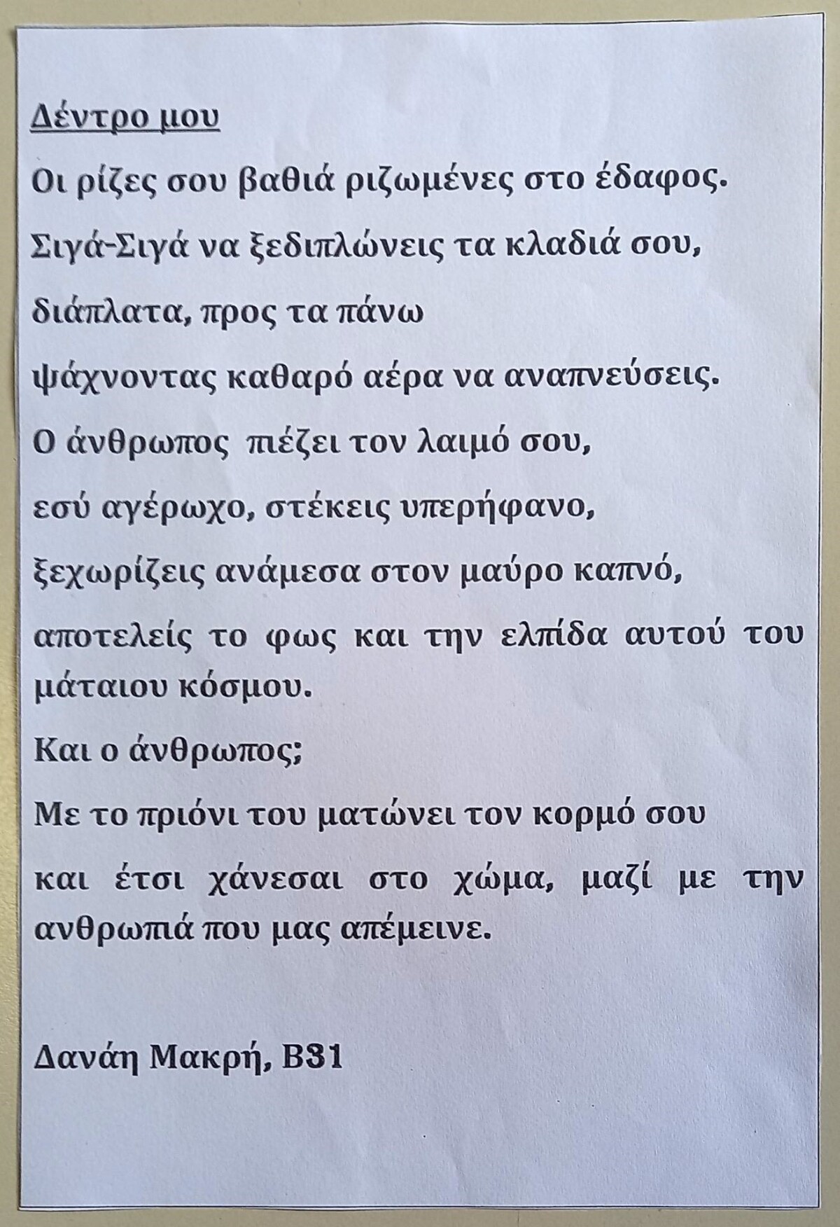 Δραστηριότητα δημιουργικής γραφής στο πλαίσιο του μαθήματος των Νέων Ελληνικών Β΄ Λυκείου «Οικολογία» και των δράσεων «Πρασινίζω το σχολείο μου», τμήμα Β31.