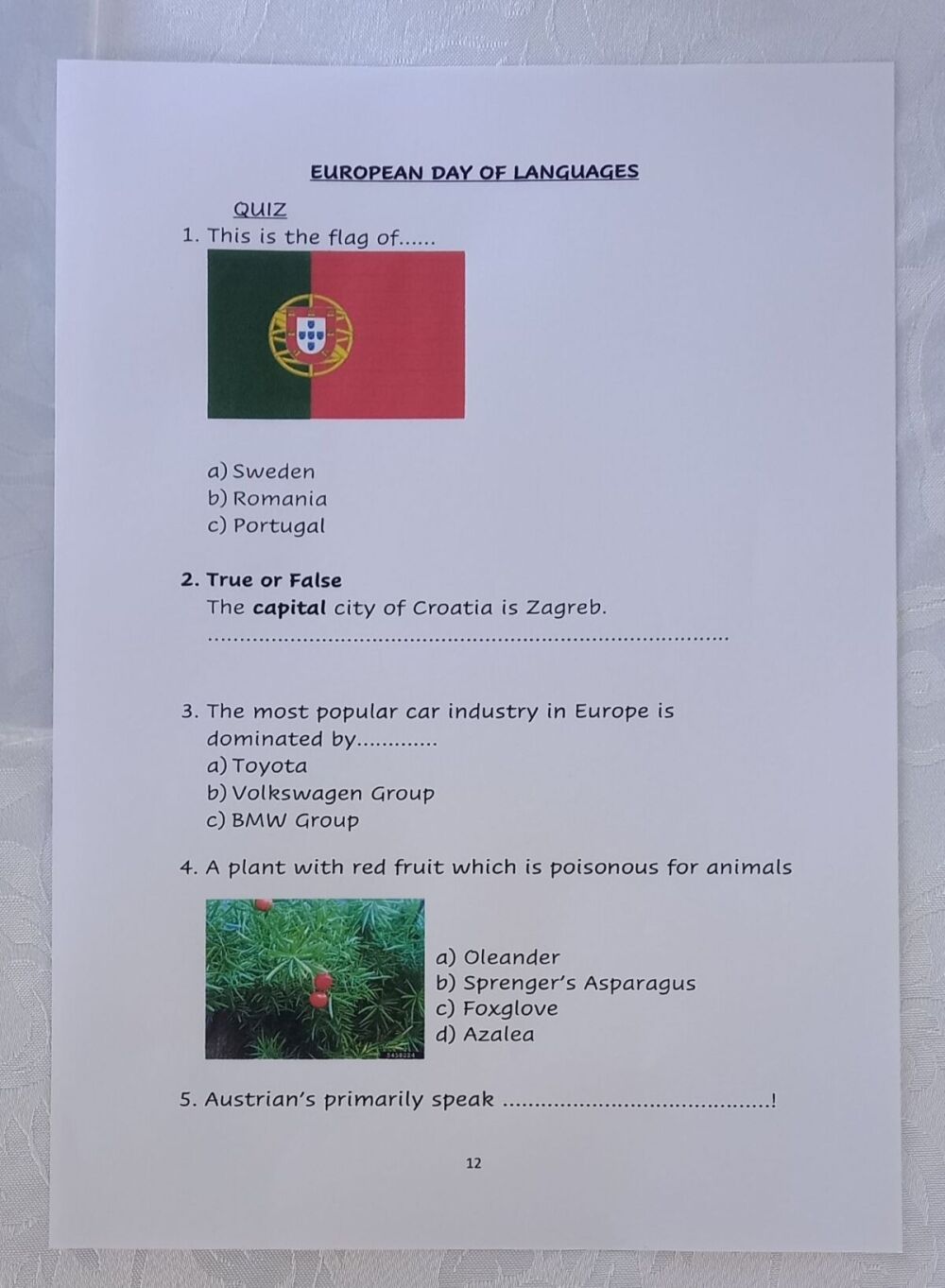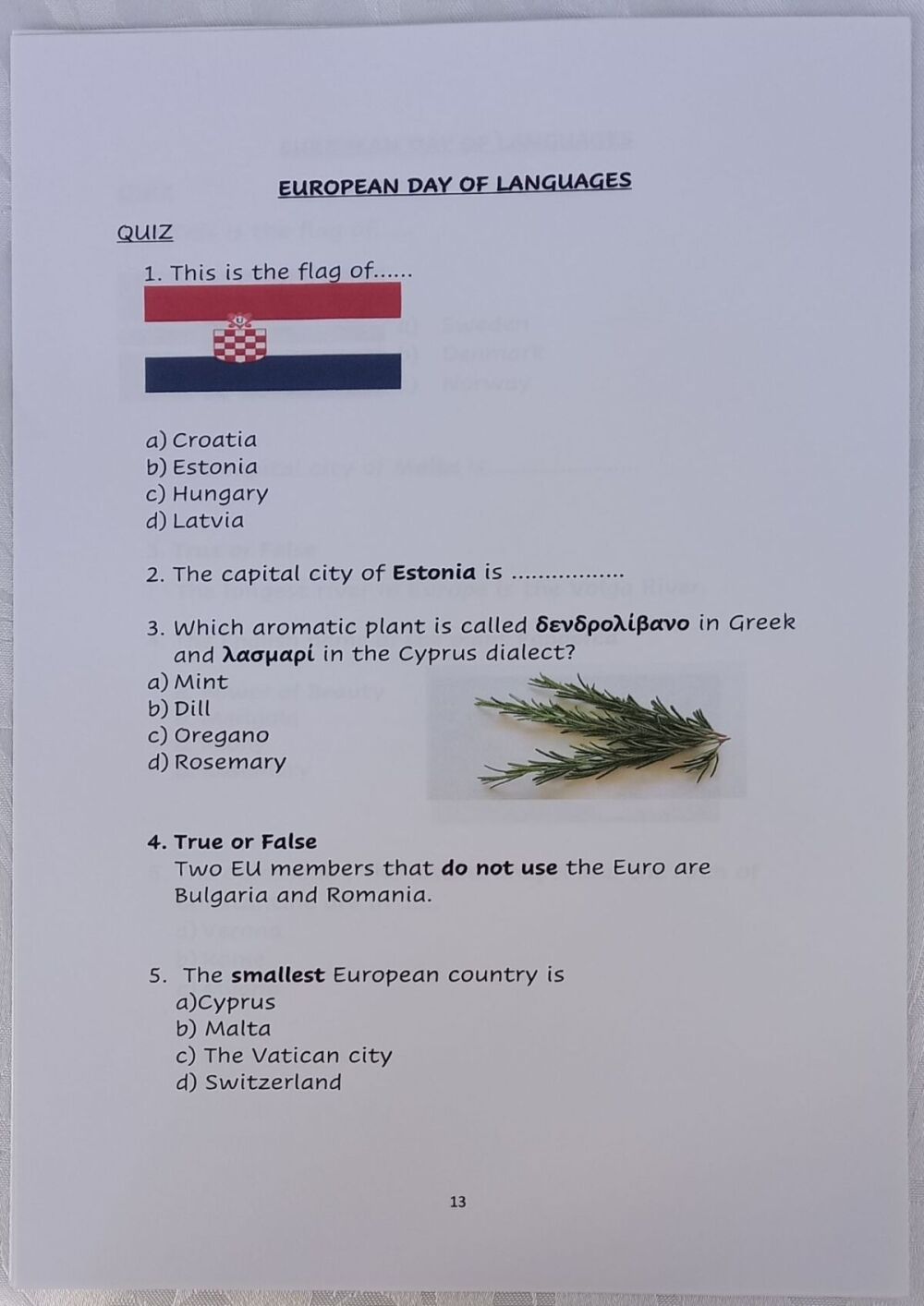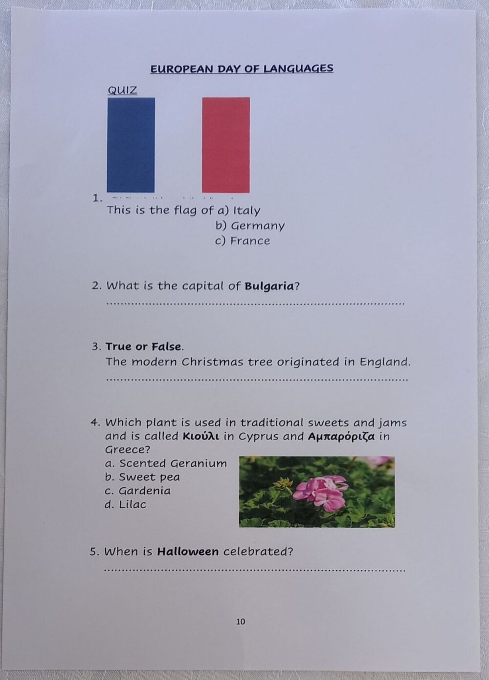 Στα πλαίσια των εορτασμών για την Ευρωπαϊκή Ημέρα Γλωσσών, την Τρίτη 07/10/2025, διοργανώθηκε κατά τη διάρκεια των διαλειμμάτων διαγωνισμός quiz (παιγνίδι γνώσεων) για τους/τις μαθητές/μαθήτριες σε διάφορες γλώσσες. Στο παιγνίδι συμπεριλήφθηκαν και ερωτήσεις που αφορούσαν στα φυτά που φυτεύτηκαν στον πράσινο χώρο του σχολείου μας, η δε δράση, στο Β΄ διάλειμμα φιλοξενήθηκε στον ίδιο τον χώρο πρασίνου. Παράλληλα, προκηρύχθηκε διαγωνισμός αφίσας για την πολυγλωσσία με θέμα «Οι Γλώσσες σαν ένα μπουκέτο λουλούδια», με αφόρμηση τον κήπο μας. Οι αφίσες εκτέθηκαν στον χώρο πρασίνου.