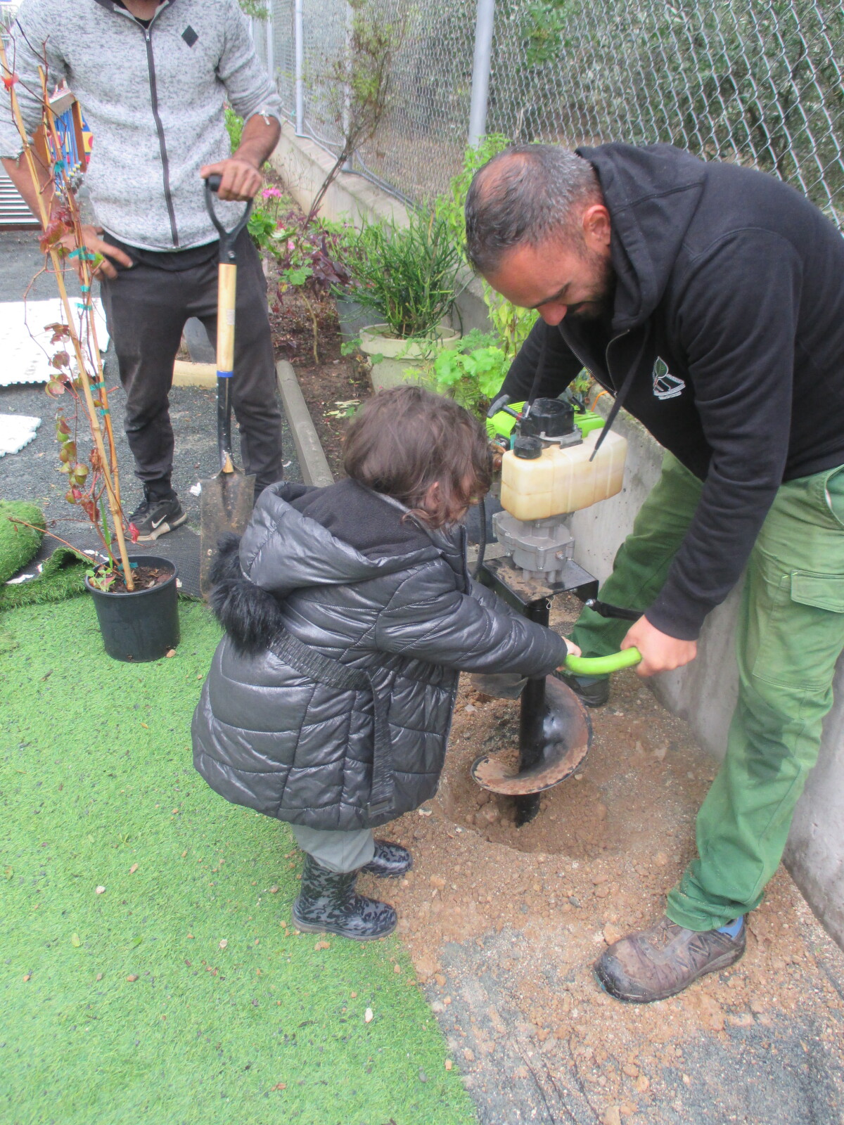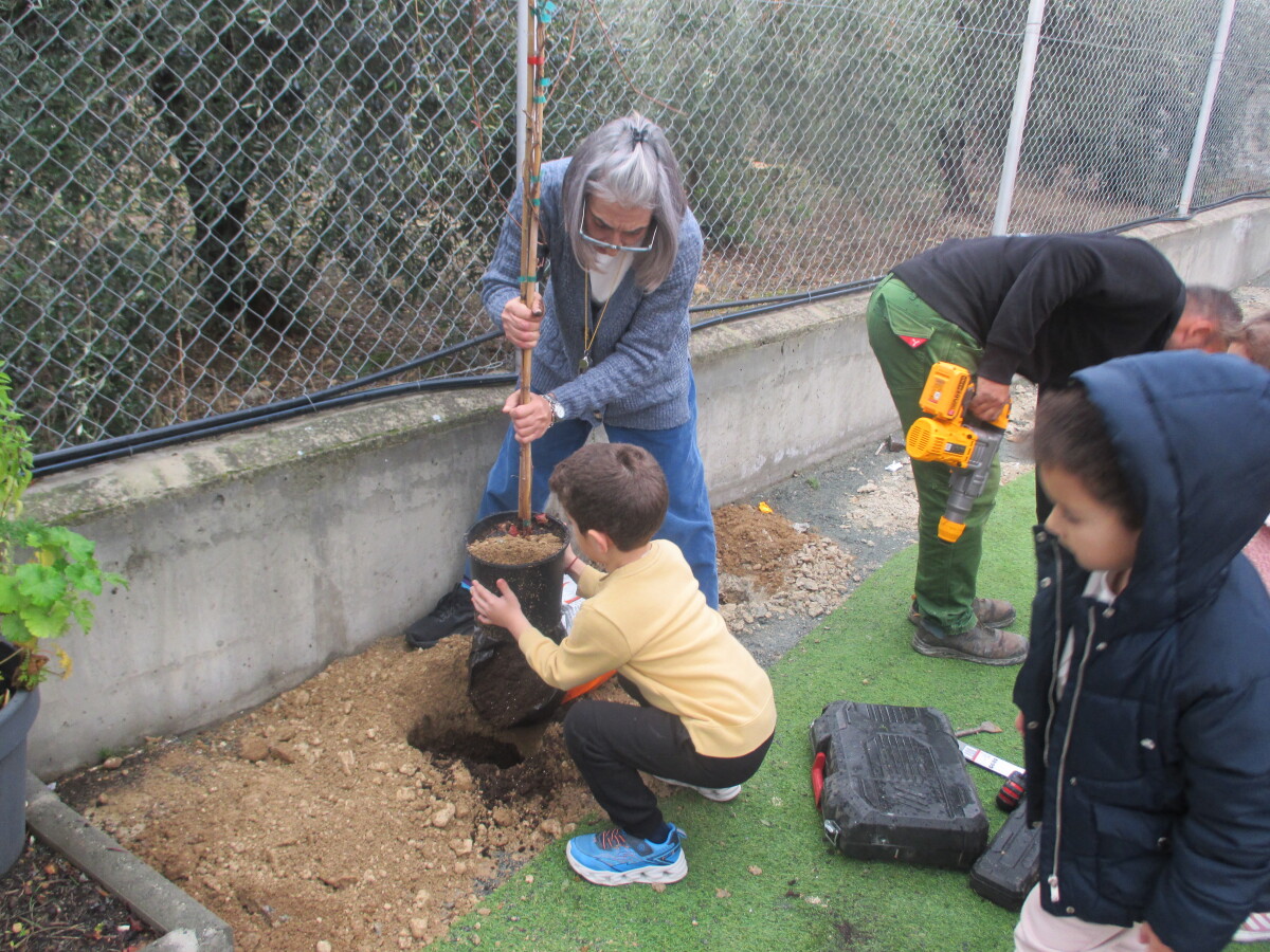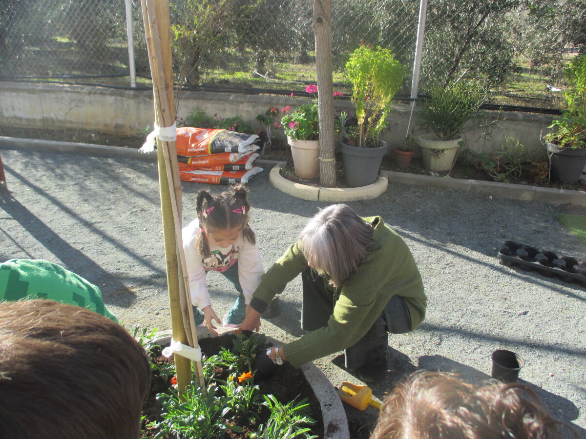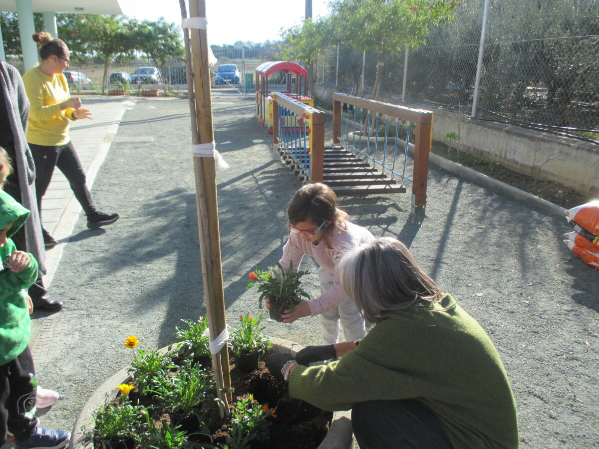 Οι κηπουροί ήρθαν στο σχολείο μας. Πρώτα αφαιρέσαμε το τεχνητό γρασίδι και στη συνέχεια ανοίχτηκαν οι τρύπες για τα φυτά. Φυτέψαμε τα φυτά και τους βοηθήσαμε να εγκαταστήσουν το σύστημα άρδευσης.