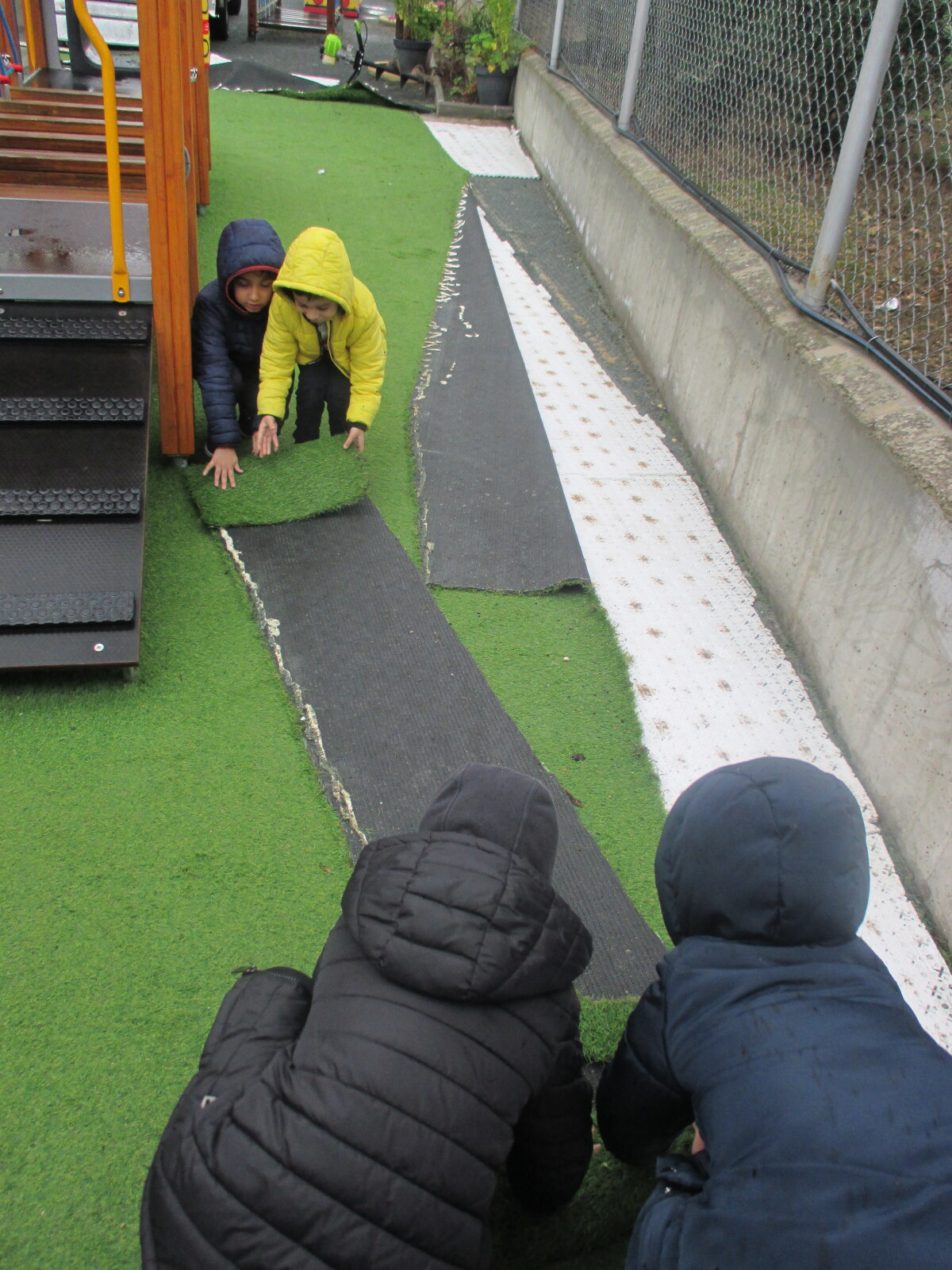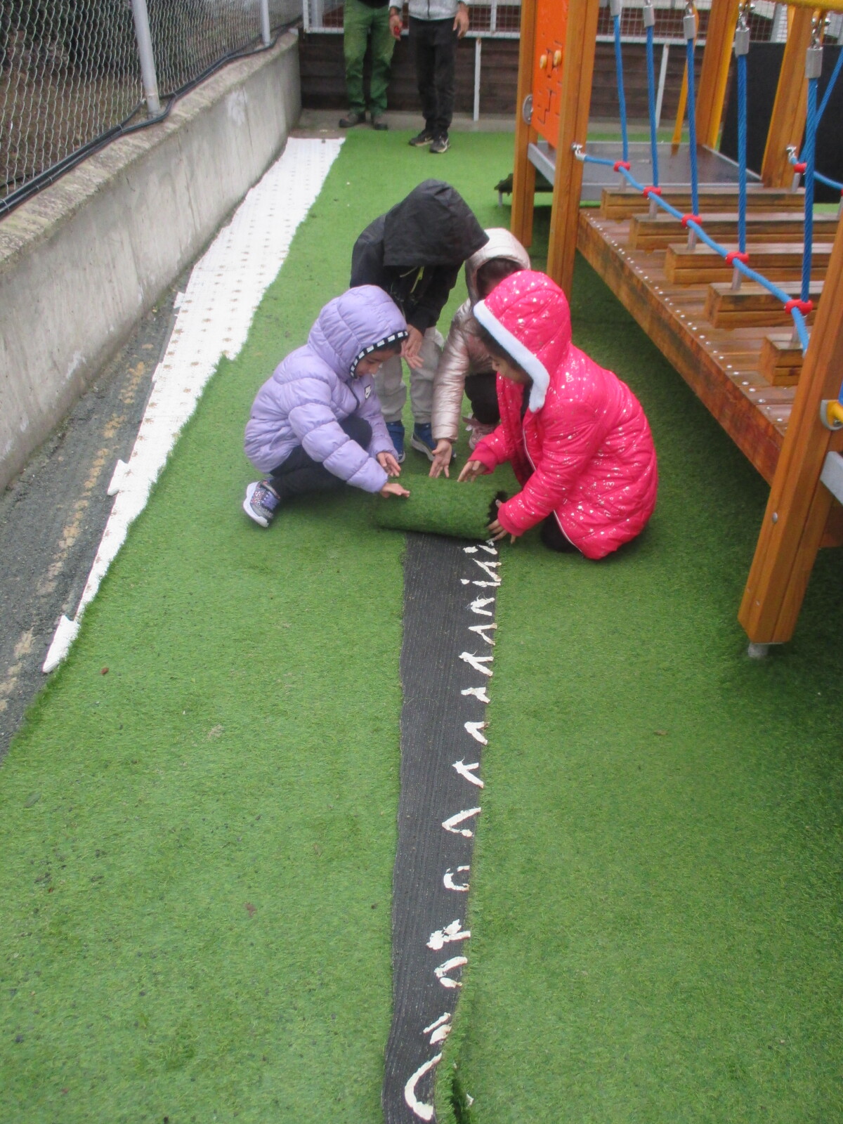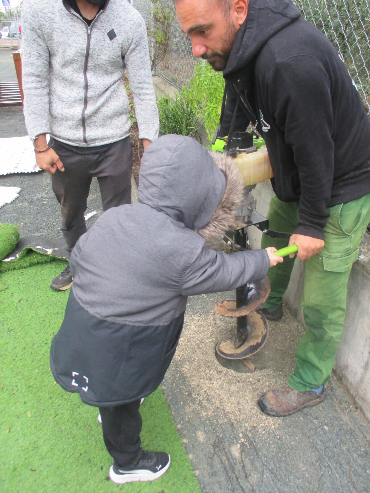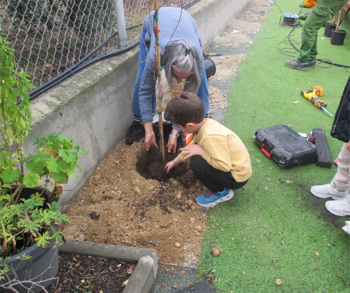 Οι κηπουροί ήρθαν στο σχολείο μας. Πρώτα αφαιρέσαμε το τεχνητό γρασίδι και στη συνέχεια ανοίχτηκαν οι τρύπες για τα φυτά. Φυτέψαμε τα φυτά και τους βοηθήσαμε να εγκαταστήσουν το σύστημα άρδευσης.
