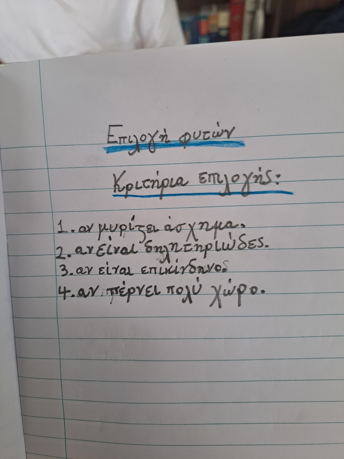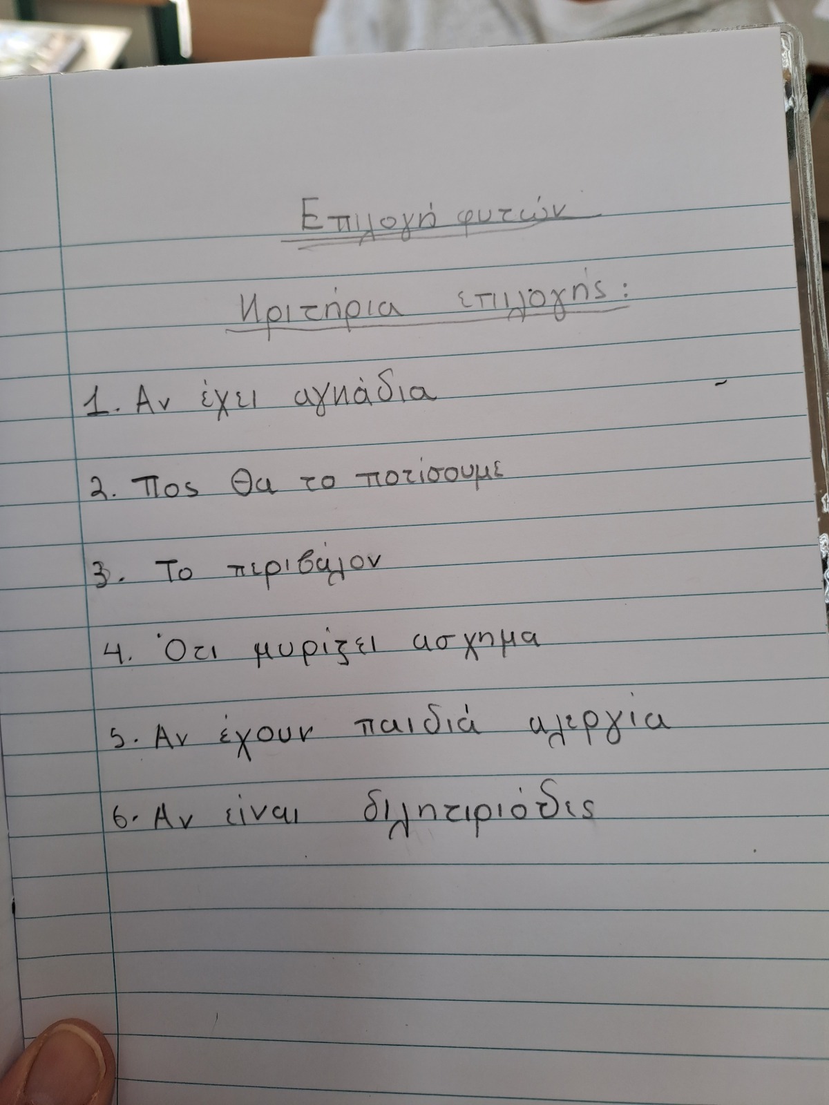 Ποια φυτά θα επιλέξουμε να φυτέψουμε; Αρκεί άραγε να φτιάξουμε μια πρόχειρη λίστα και να προχωρήσουμε στην αγορά τους ή χρειάζεται πρώτα να οργανωθούμε και να θέσουμε συγκεκριμένα κριτήρια; Τα παιδιά προβληματίστηκαν για όσα πρέπει να ληφθούν υπόψη, ώστε η επιλογή των φυτών να γίνει με σωστό και υπεύθυνο τρόπο.
