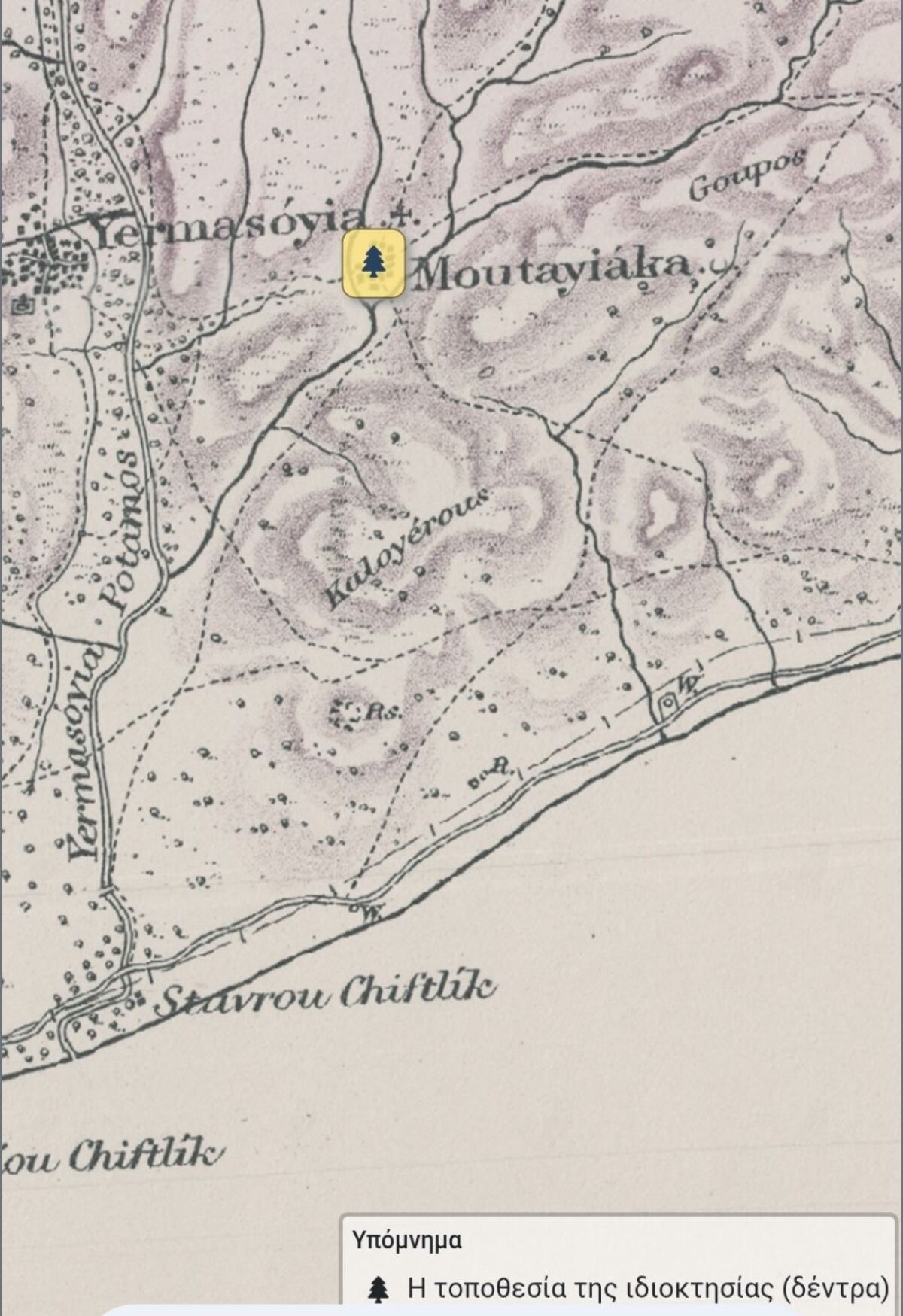 Α. Καταγραφή στην περιοχή Μουτταγιάκας των συγκεκριμένων δέντρων και μύλων στην Αγγλοκρατία.