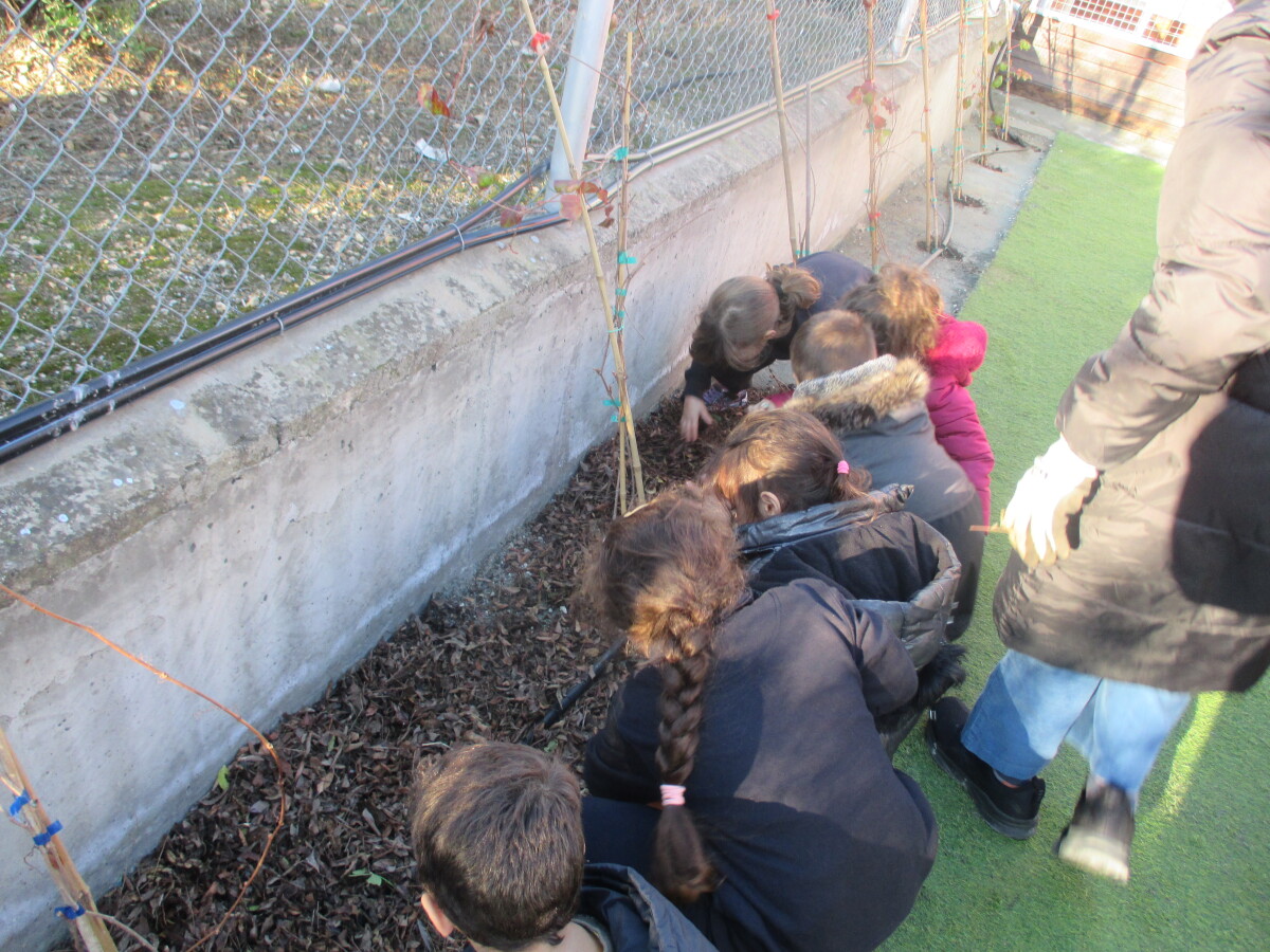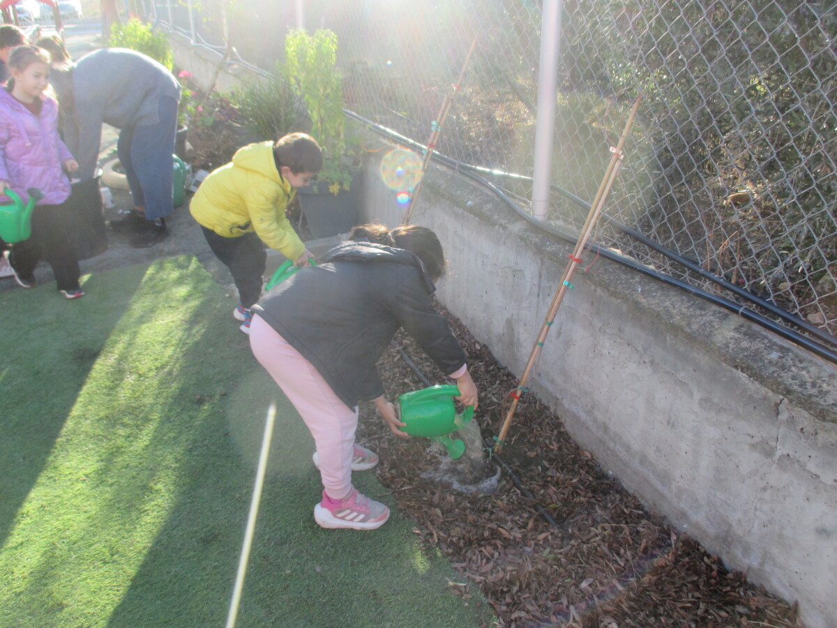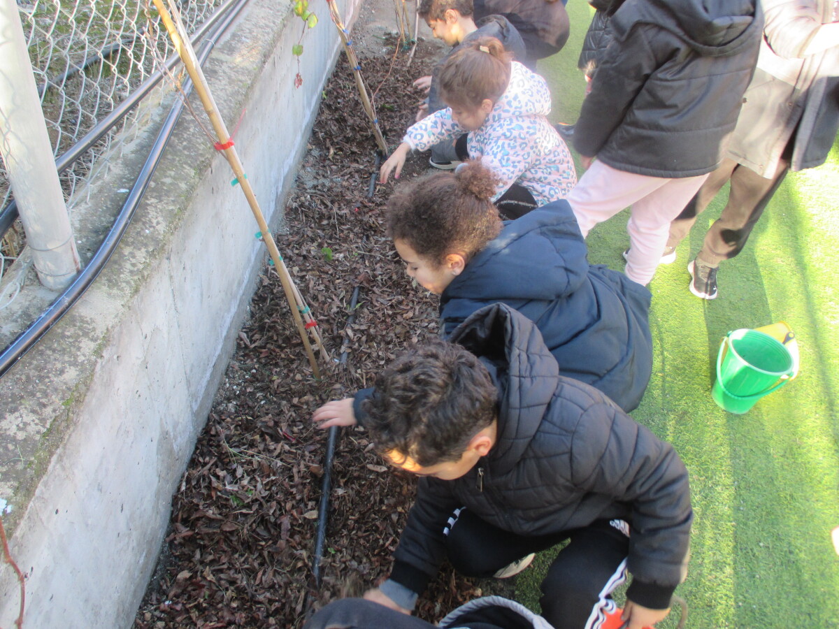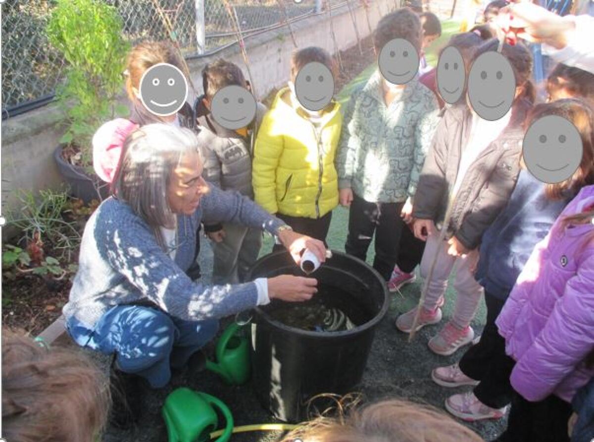 Ο γεωπόνος επισκέφθηκε το σχολείο μας και μας έδωσε συμβουλές για τα φυτά μας. Μάθαμε τι χρειάζεται να προσθέσουμε στο νερό για να βοηθήσουμε τις ρίζες να δυναμώσουν και πώς θα προστατεύσουμε το χώμα ώστε να μην στεγνώνει γρήγορα. Μαζέψαμε φύλλα από την αυλή και καλύψαμε το χώμα των νέων φυτών, βάλαμε βιοδιεγέρτη και λίπασμα στο νερό και ποτίσαμε με αυτό τα νέα φυτά μας. Τέλος στερεώσαμε τα κλαδιά των αναρρηχητικών στο πλέγμα ώστε να μπορούν να "σκαρφαλώσουν" στην στραταρκά μας.